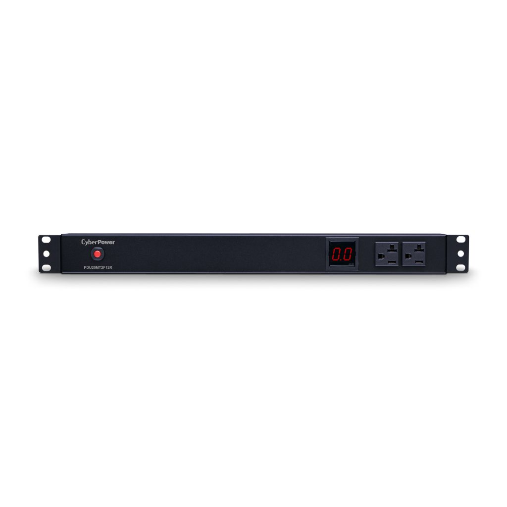 The CyberPower PDU20MT2F12R, a 14-outlet (2 front, 12 rear), rackmount metered power distribution unit (PDU), provides 100 – 125 V 20A output. It distributes power to 14 NEMA 5-20R receptacles from a single NEMA L5-20P twist lock plug with unfiltered electrical pass-through. The current draw for connected equipment is displayed in amps on the front LCD for real-time load monitoring.