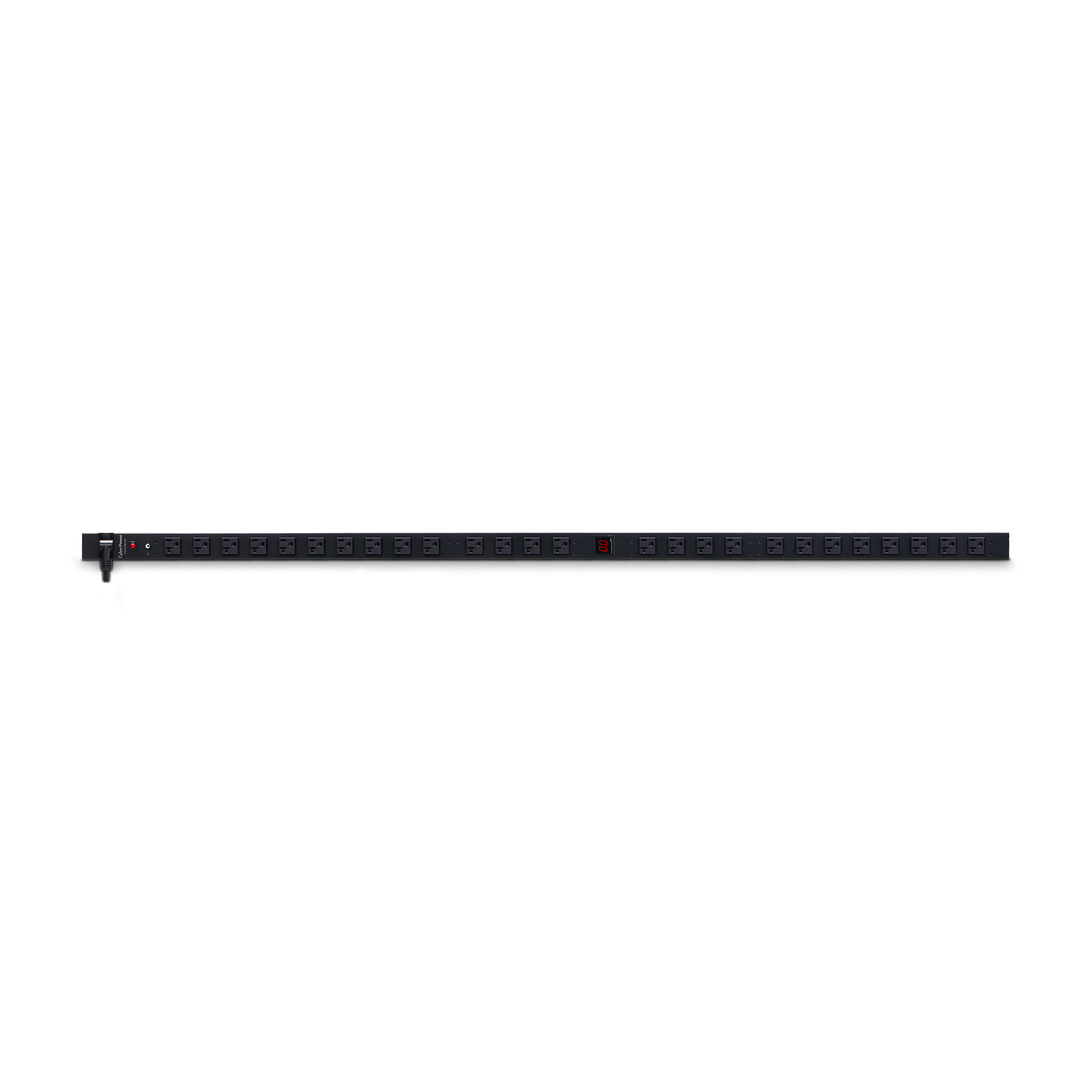 The CyberPower PDU20MV26F, a 26-outlet (front), 0U vertical rackmount metered power distribution unit (PDU), provides 100 – 125 V 20A output. It distributes power to 26 NEMA 5-20R receptacles from a single NEMA 5-20P plug with unfiltered electrical pass-through. The current draw for connected equipment is displayed in amps on the front LCD for real-time load monitoring.