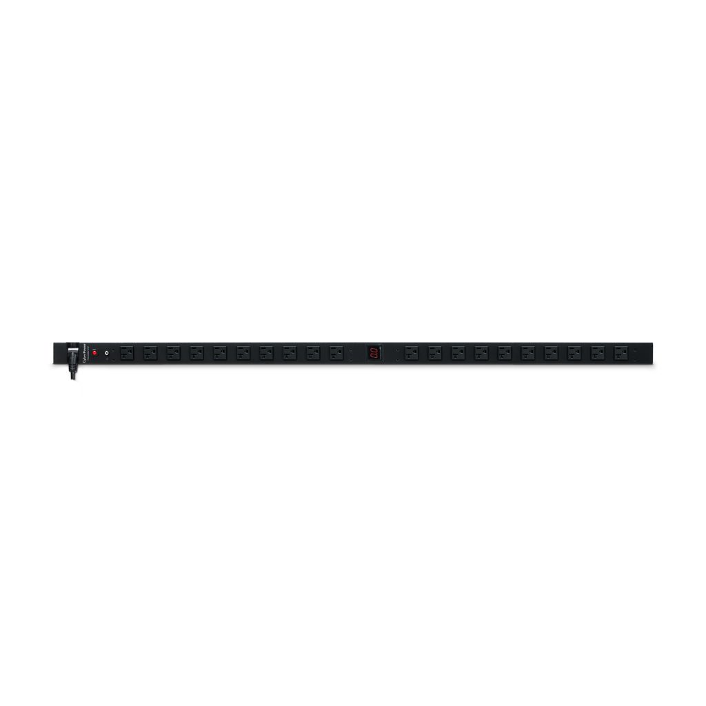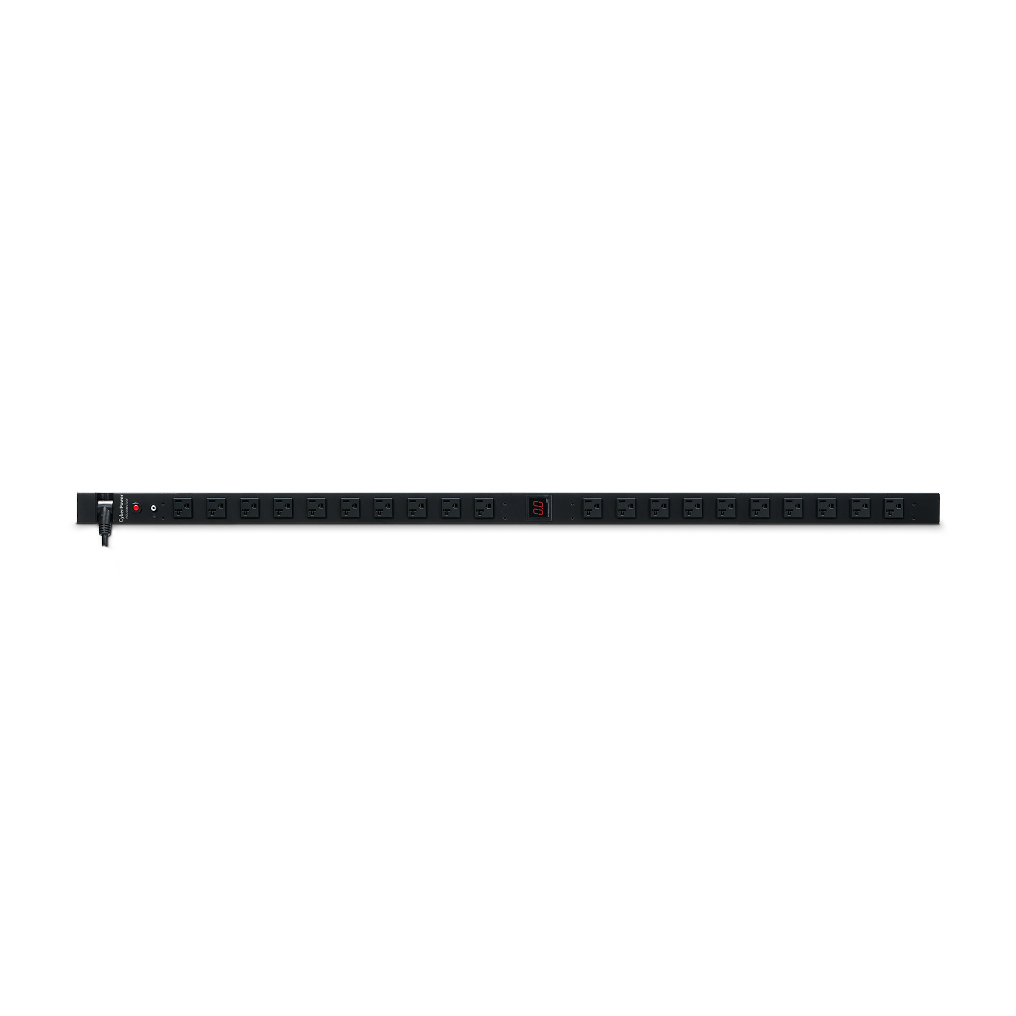 The CyberPower PDU20MVT20F, a 20-outlet (front), 0U vertical rackmount metered power distribution unit (PDU), provides 100 – 125 V 20A output. It distributes power to 20 NEMA 5-20R receptacles from a single NEMA L5-20P twist lock plug with unfiltered electrical pass-through. The current draw for connected equipment is displayed in amps on the front LCD for real-time load monitoring.