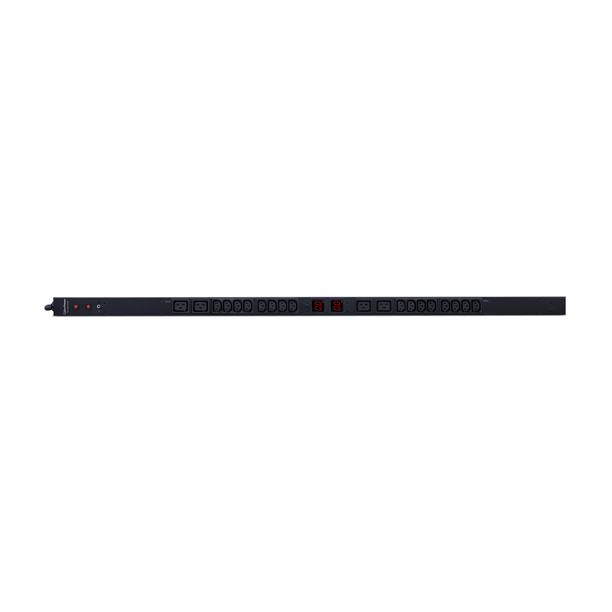 The CyberPower PDU30MVHVT20F, a 20-outlet (front), 0U vertical rackmount basic power distribution unit (PDU), provides 200/230V 30A output. It distributes power to 16 IEC-320 C13, 4 IEC-320 C19 receptacles from a single NEMA L6-30P twist lock plug with unfiltered electrical pass-through. The current draw for connected equipment is displayed in amps on the front of two LCDs for real-time load monitoring.
