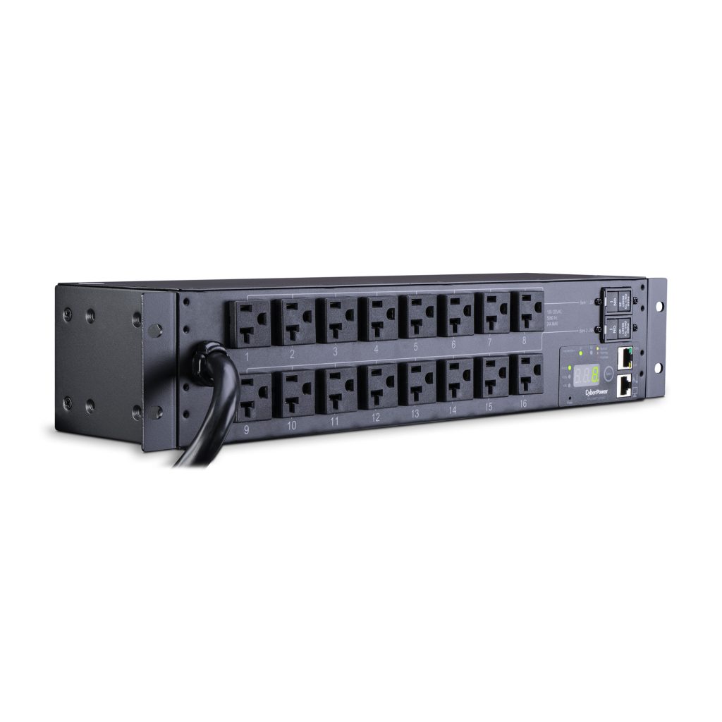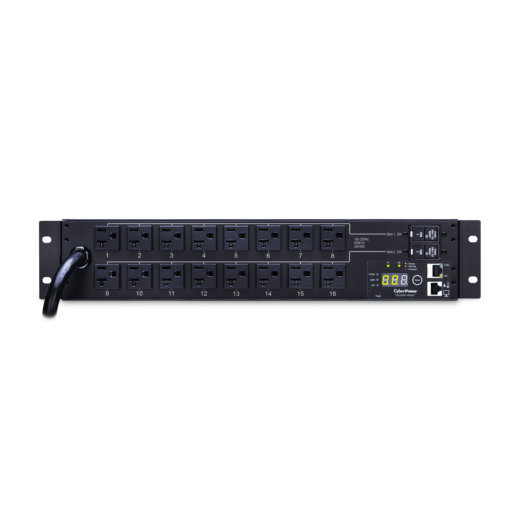 The CyberPower PDU30MT16FNET, a 16-outlet (front), 2U rackmount monitored power distribution unit (PDU), provides 120V 30A output. It distributes power to 16 NEMA 5-20R receptacles from a single twist lock NEMA L5-30P plug with unfiltered electrical pass-through. Power status can be monitored over the network, using the CyberPower Management Console and the RJ45 Ethernet port for network connection, or locally by using the LCD. The PDU30MT16FNET comes with a three-year limited warranty that covers defects in materials and workmanship in the product under normal use and conditions within three years of the purchase date.