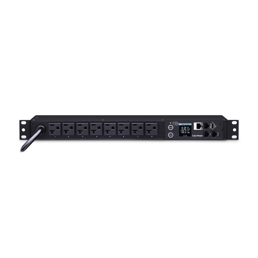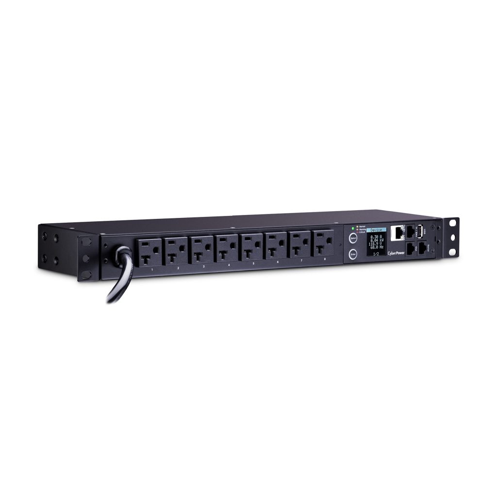 The CyberPower PDU31002 an 8-outlet (front), 1U rackmount monitored power distribution unit (PDU), provides 120V 20A output. PDU31002 distributes power to 8 NEMA 5-20R receptacles from a single twist lock NEMA L5-20P, or, with the included adaptor, NEMA 5-20P plug with unfiltered electrical pass-through. Monitor power status over the network by using the CyberPower management console and the RJ45 Ethernet port for network connection. Monitor power status locally by using the LCD.