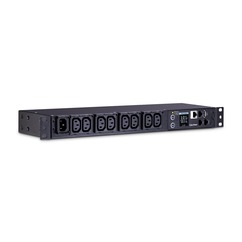 The CyberPower PDU31004, an 8-outlet (front), 1U rackmount monitored power distribution unit (PDU), provides 100-240V 15A output. PDU31004 distributes power to 8 IEC-320 C13 receptacles from a single IEC-320 C14 plug with unfiltered electrical pass-through. Monitor power status over the network by using the CyberPower management console by the RJ45 Ethernet port for network connection. Monitor power status locally by using the LCD.