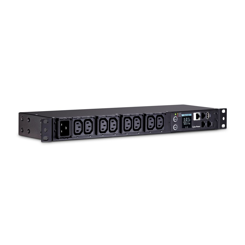 The CyberPower PDU31005, an 8-outlet (front), 1U rackmount monitored power distribution unit (PDU), provides 100-120V 20A output. PDU31005 distributes power to 8 IEC-320 C13 receptacles from a single IEC-320 C20 plug with unfiltered electrical pass-through. Monitor power status over the network using the CyberPower management console and the RJ45 Ethernet port for network connection. Monitor power status locally by using the LCD screen.