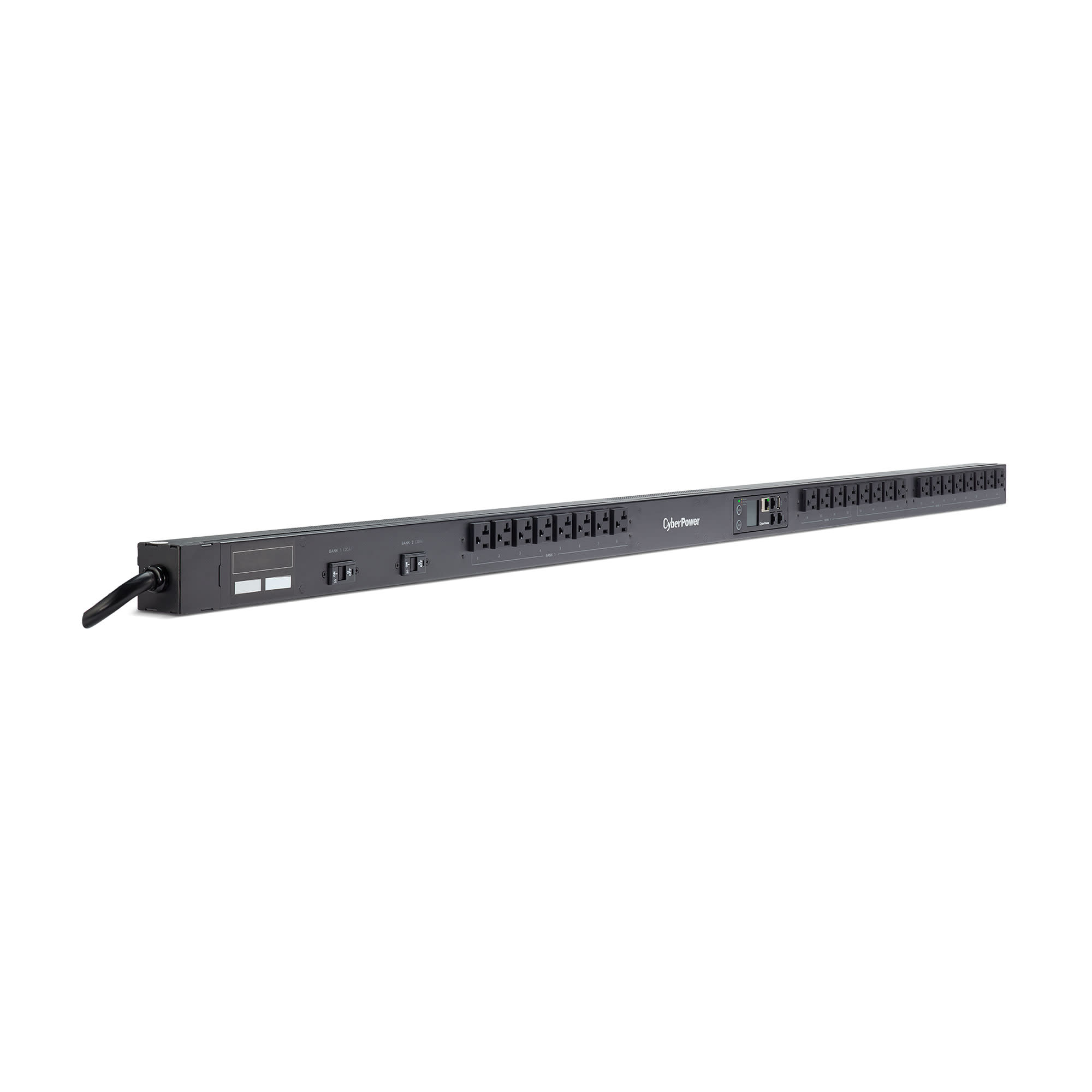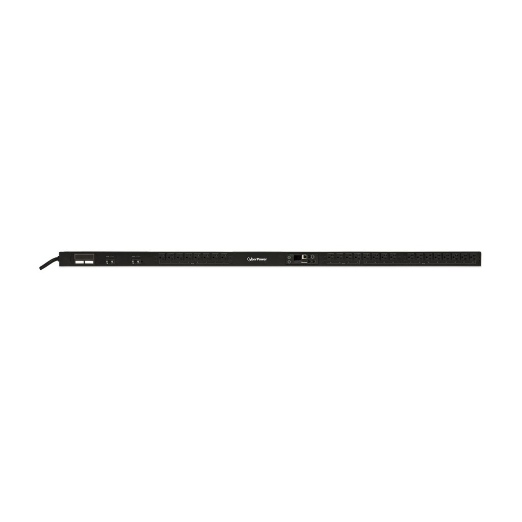 The CyberPower PDU31102, a 24-outlet (front), 0U rackmount monitored power distribution unit (PDU), provides 120V 30A output. It distributes power to 24 NEMA 5-20R receptacles from a single twist lock NEMA L5-30P plug with unfiltered electrical pass-through. Power status can be monitored over the network, using the CyberPower Management Console and the RJ45 Ethernet port for network connection, or locally using the LCD.
