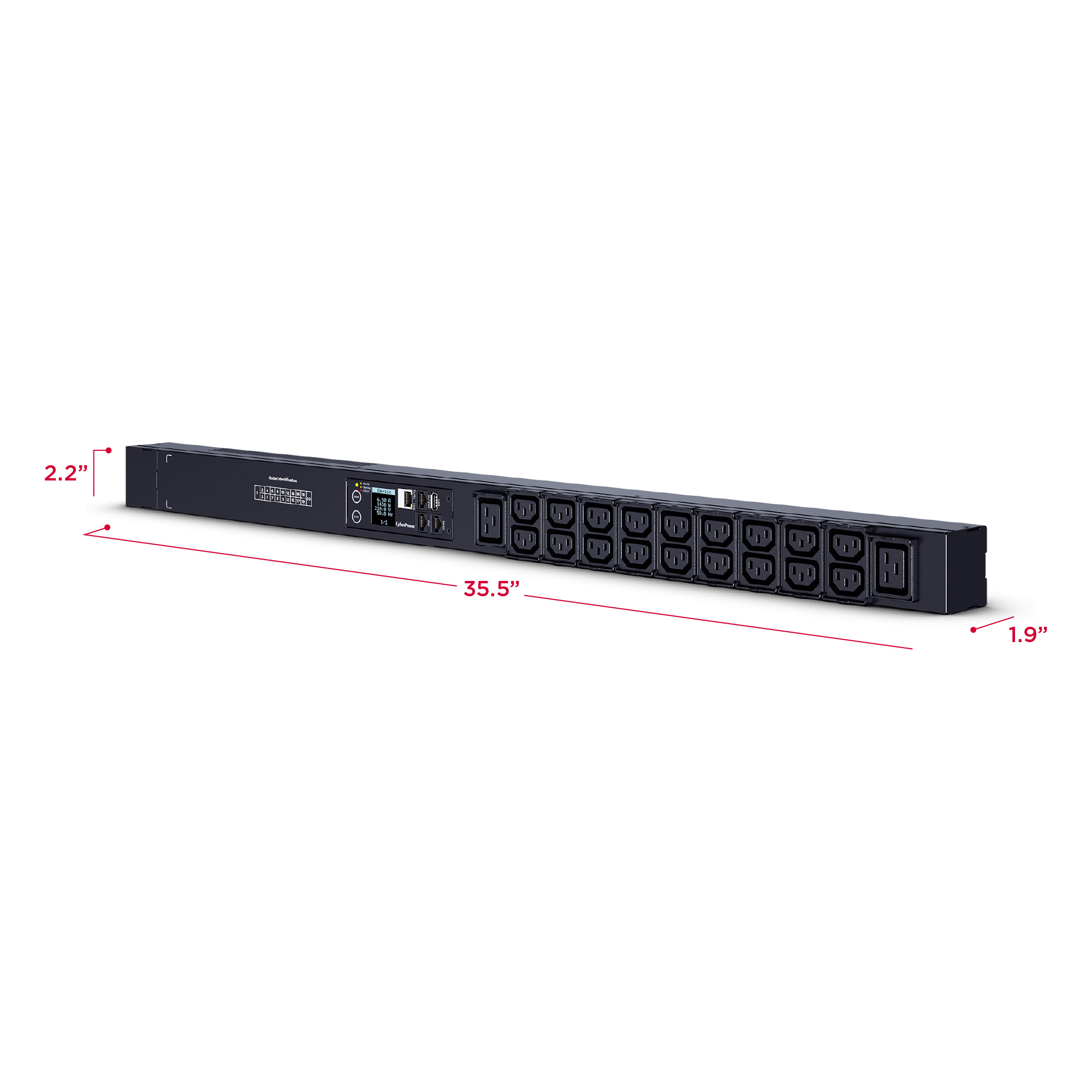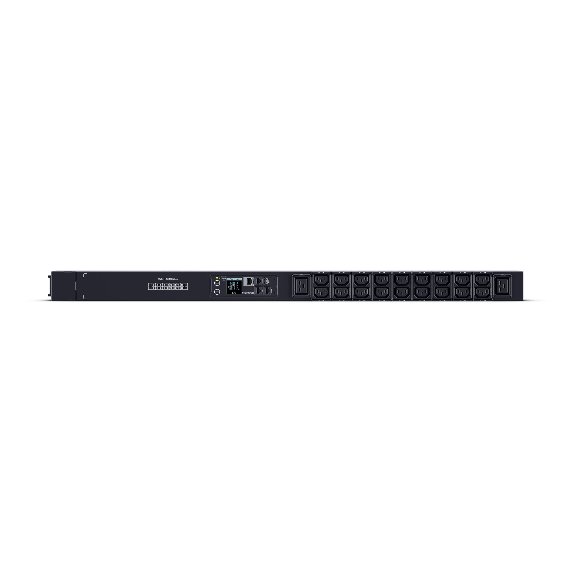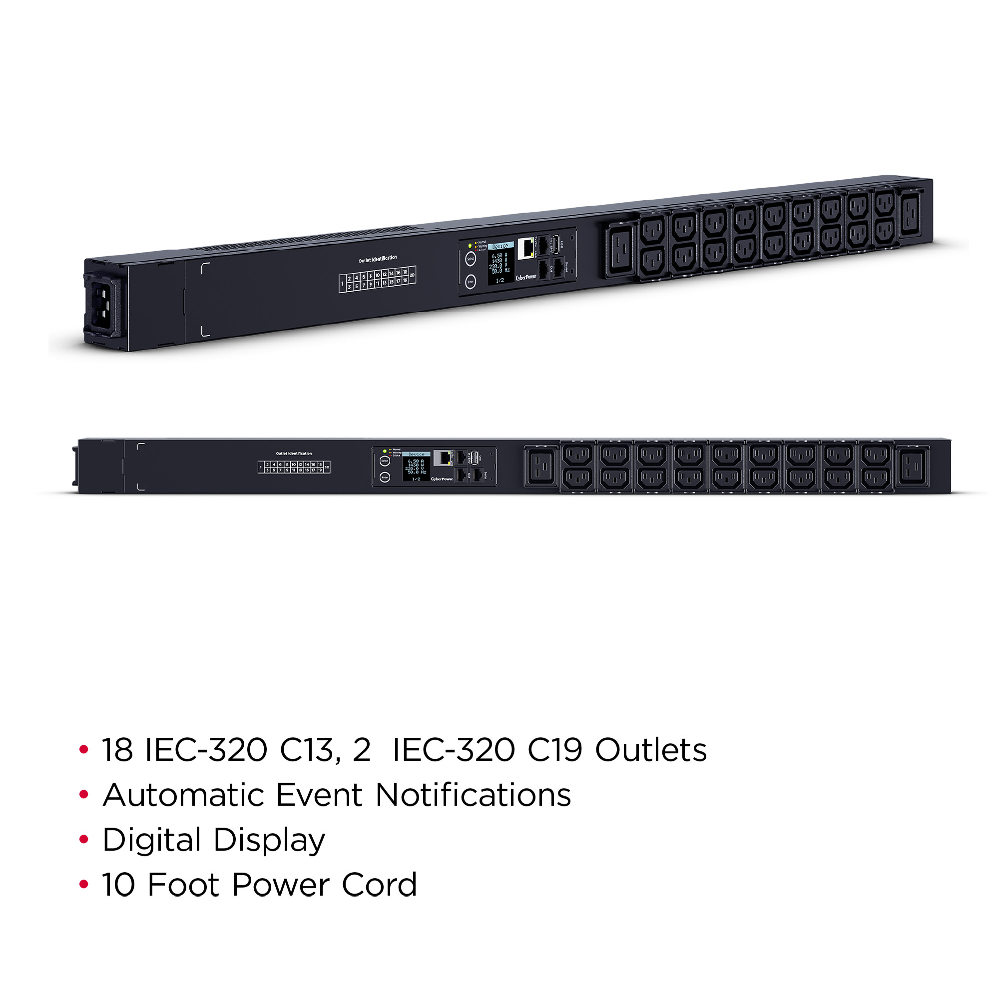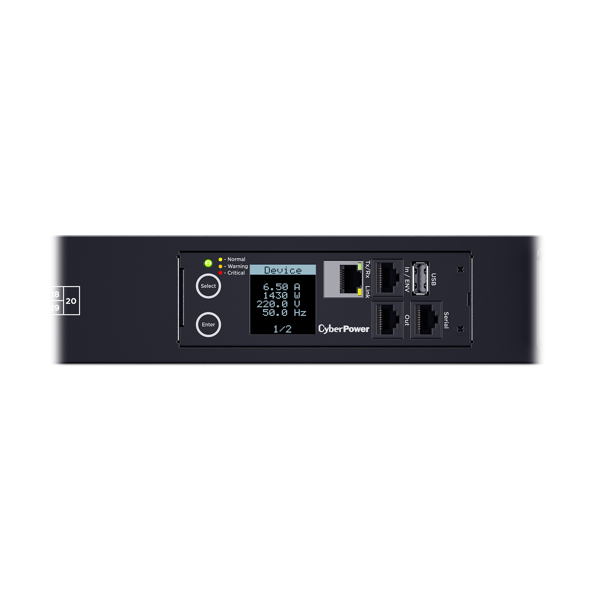 The CyberPower PDU31114, a 20-outlet (front), 0U rackmount monitored power distribution unit (PDU) provides 240V 20A output. PDU31114 distributes power to 18 IEC-320 C13 and 2 IEC-320 C19 receptacles from a single NEMA L6-20P plug with unfiltered electrical pass-through. Monitor power status over the network by using the CyberPower management console and the RJ45 Ethernet port for network connection. Monitor power status locally by using the LCD.