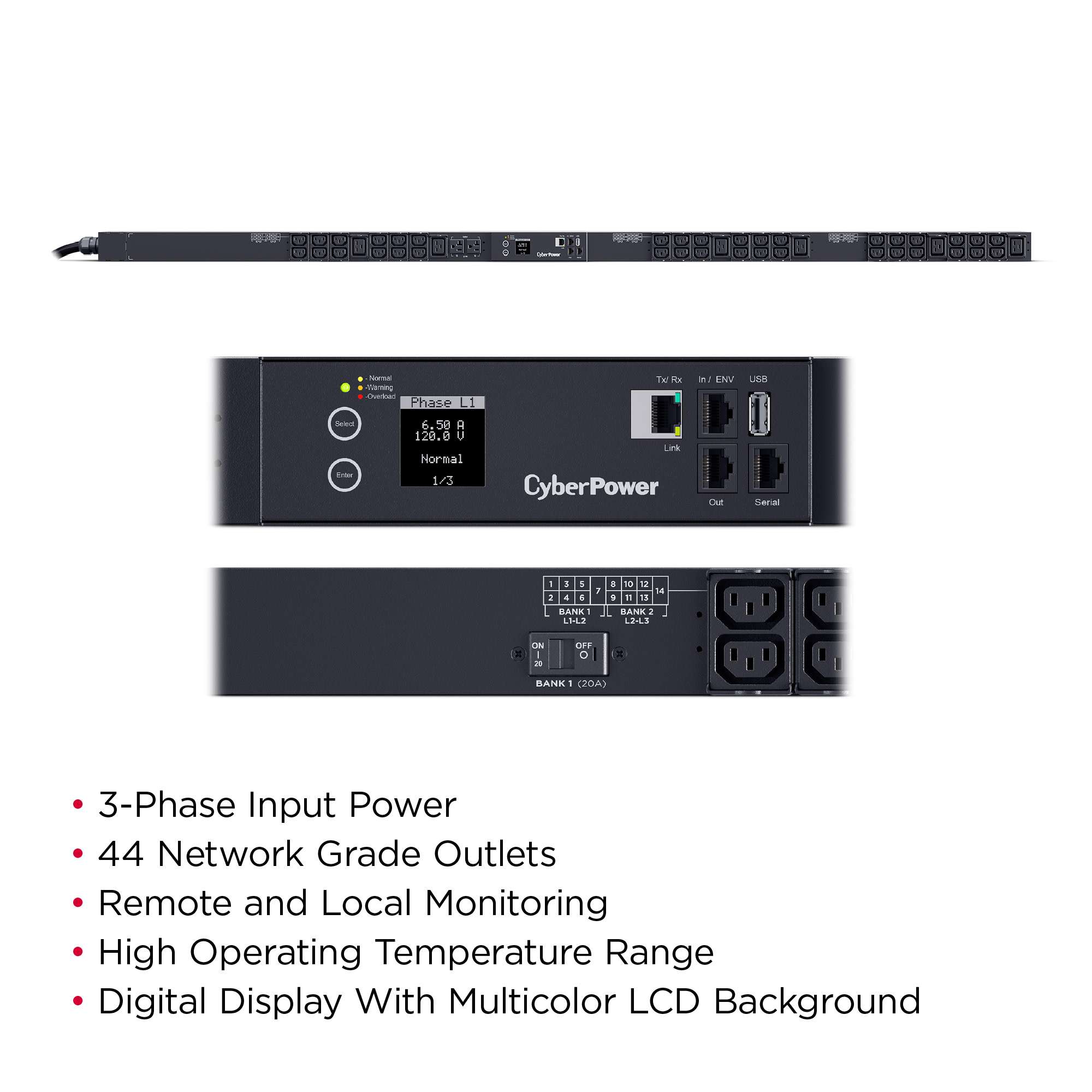 Stay informed about your power with the CyberPower PDU33105 monitored 3-Phase PDU. Ideal for data centers and network closets, this unit provides power monitoring in real time over the network by using the CyberPower management console and the RJ45 Ethernet port for network connection or locally by using the LCD.
