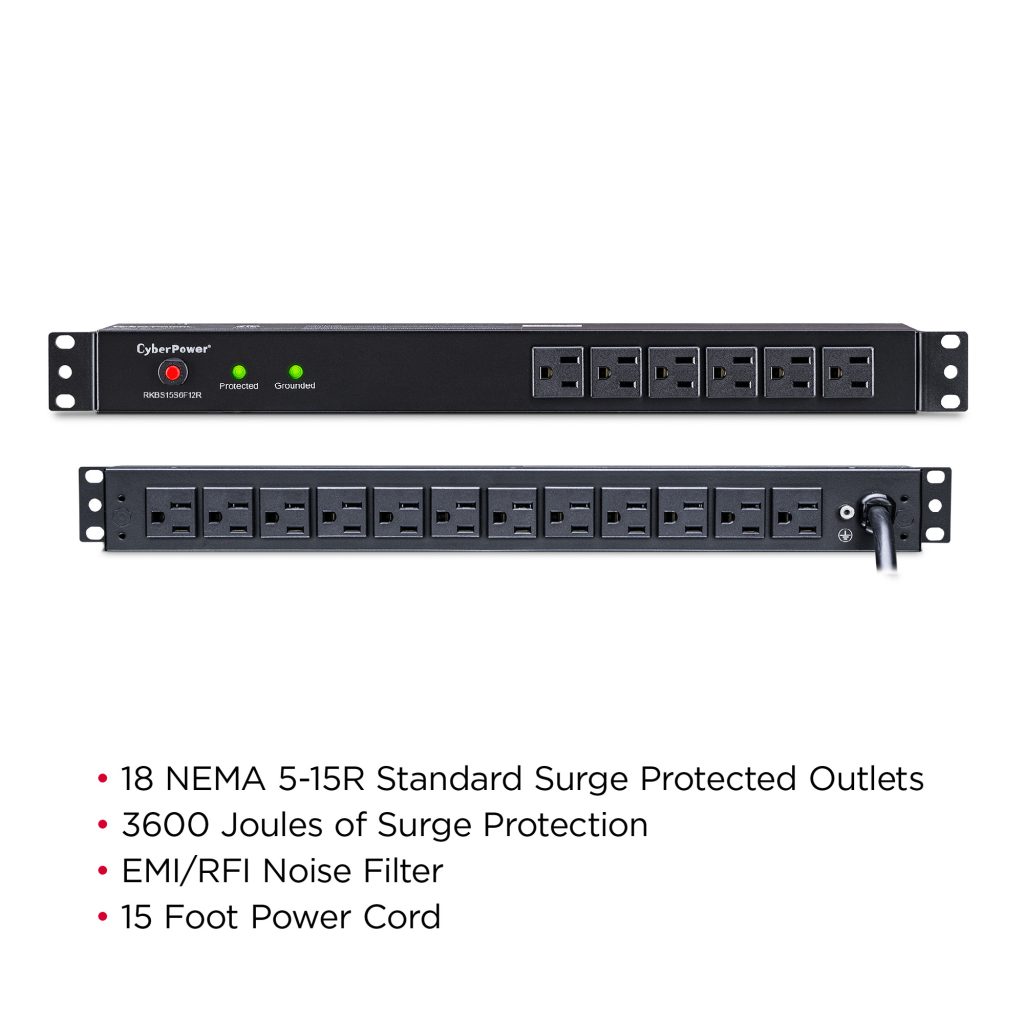 Engineered for the most demanding applications, the professional-grade Rackbar™ Surge Protector RKBS15S6F12R from CyberPower safeguards systems and networking equipment by absorbing spikes in energy caused by storms and electrical power surges. Designed for network environments, the RKBS15S6F12R also performs superbly for home office use, providing 3600 joules of protection, 15-Amp electrical capacity with circuit breaker, and 18 surge-protected outlets (6 front, 12 rear). Industrial-grade metal housing keeps this Rackbar performing flawlessly. Two sets of mounting brackets provide flexible installation options: 1U rackmount (19 in.); 0U vertical rackmount and under-counter configurations.