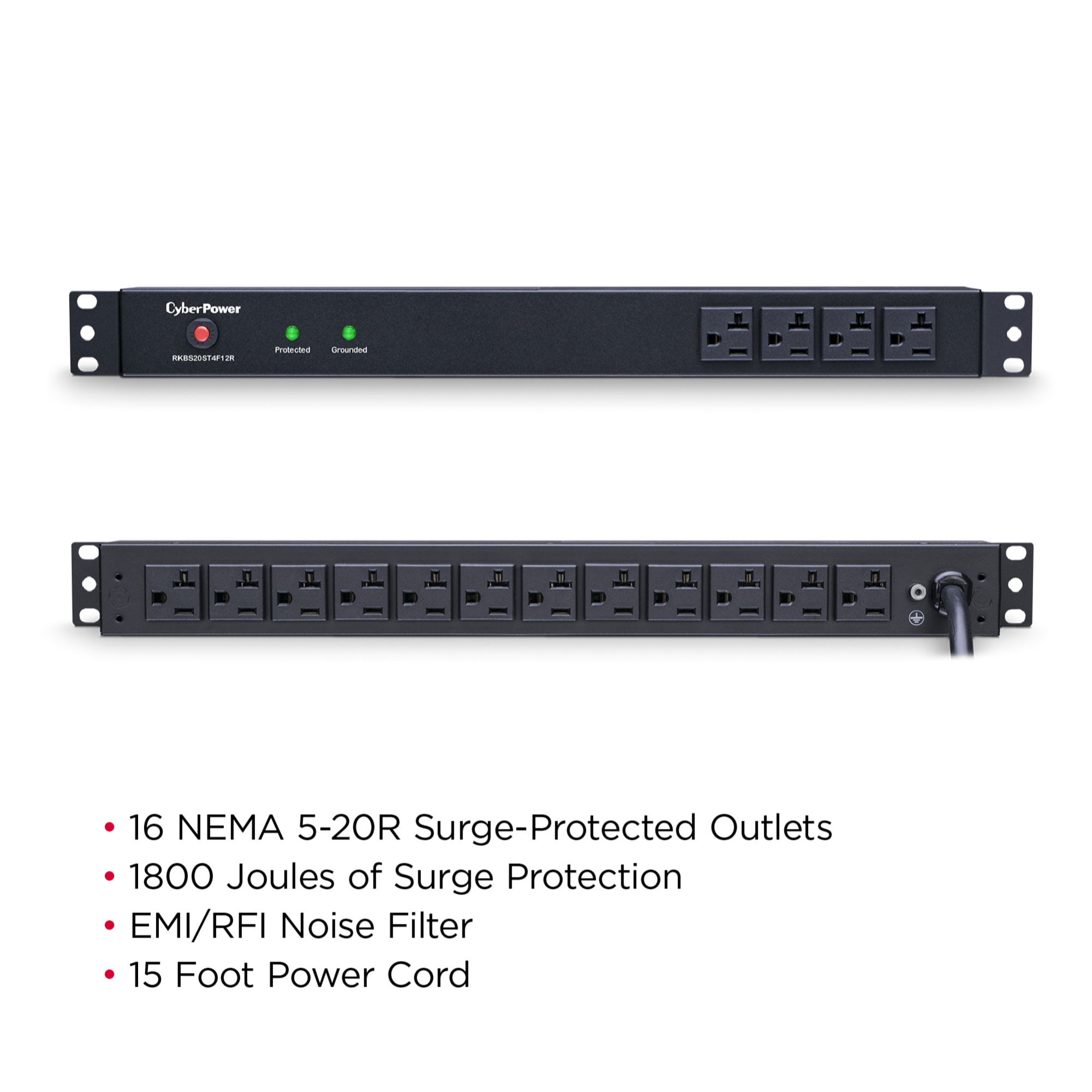 Engineered for the most demanding applications, the professional-grade Rackbar™ Surge Protector RKBS20ST4F12R safeguards systems and networking equipment by absorbing spikes in energy caused by storms and electrical power surges. Designed for network environments, the RKBS20ST4F12R also performs superbly for home office use, providing 1800 joules of protection, 20-Amp electrical capacity with circuit breaker and 16 surge-protected outlets (4 front, 12 rear). Industrial-grade metal housing keeps this Rackbar performing flawlessly. Two sets of mounting brackets provide flexible installation options: 1U rackmount (19 in.); 0U vertical rackmount and under-counter configurations.