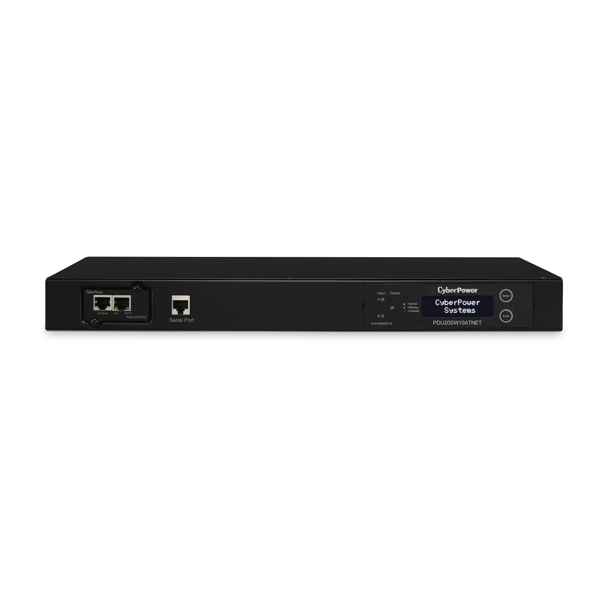 The PDU20SW10ATNET includes a SNMP/HTTP card (RMCARD203). With the SNMP card and an IP address on the network interface, users have real-time monitoring and outlet control of the PDU. The switched outlet receptacles can be managed individually or collectively. The LCD panel provides local monitoring of the PDU and on/off control for the outlets. It can also be used to measure the electrical current (displayed in amperes) used by connected equipment. The LCD panel also shows input and output voltages, active power consumption levels (displayed in kilowatts), and hardware and firmware versions.