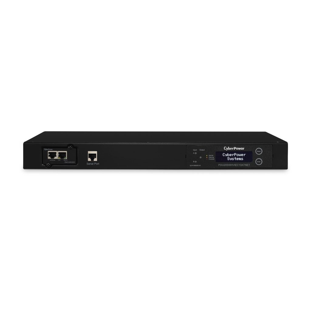 The CyberPower PDU20SWHVIEC10ATNET, a 10-outlet (rear), 1U rackmount switched automatic transfer switch (ATS) power distribution unit (PDU), provides 200-240V 20A output. It distributes unfiltered electrical pass-through to 10 receptacles: 8 IEC-320 C13 outlets and 2 IEC-320 C19 outlets from redundant IEC-320 C20 plugs. Dual power cords can be plugged into separate power sources to provide redundancy to single-corded connected equipment. If power for the primary source exceeds the lower or upper thresholds, or if power fails, the PDU will switch to the secondary power source to ensure continuous operation. The PDU will switch back to the primary power source when incoming power becomes stable.
