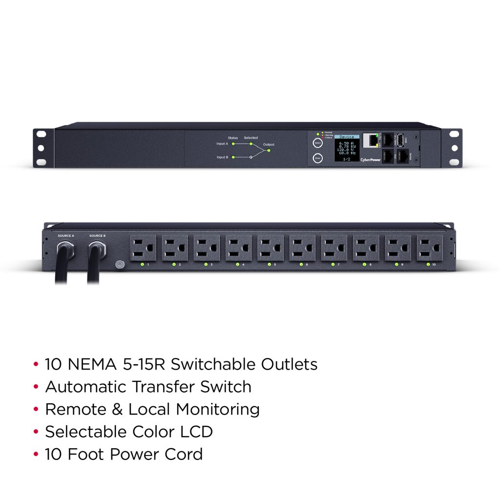 The PDU44001 supports inputs between 100-120V and includes (10) NEMA 5-15R outlets. Dual NEMA 5-15P power cords are plugged into separate power sources (A and B), and information about each power source is clearly displayed on the front panel LED indicator lights. Other features include an LCD with selectable background color, built-in web interface, and power event notifications. The CyberPower PDU44001 is protected by a three-year limited warranty.
