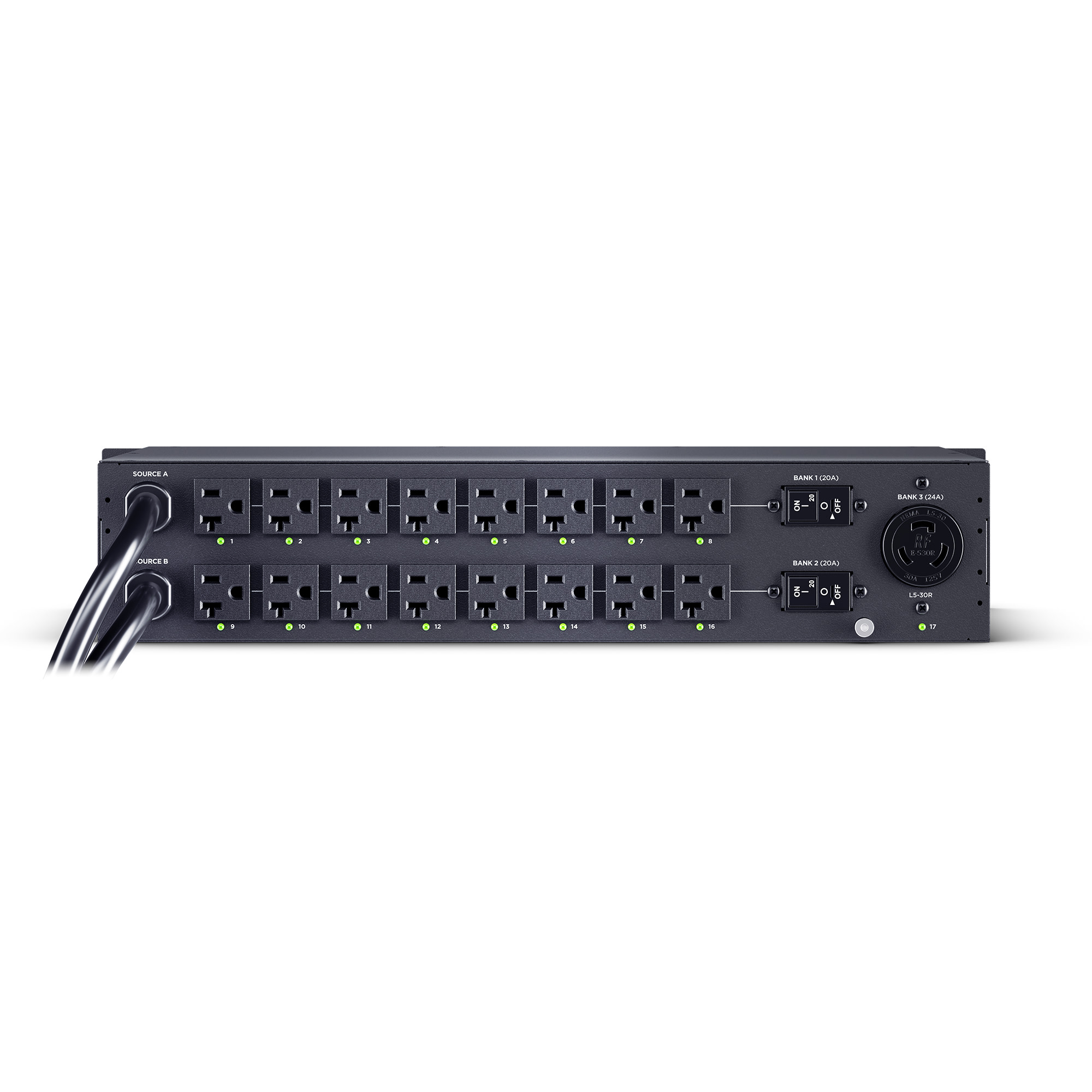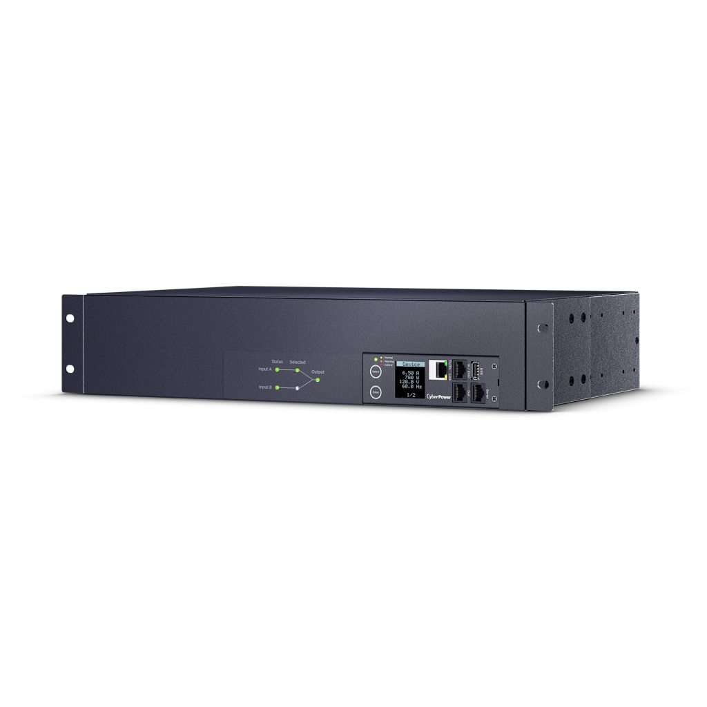 The PDU44003 supports inputs between 100-120V and includes (16) NEMA 5-20R and (1) L5-30R outlets. Dual NEMA L5-30P power cords are plugged into separate power sources (A and B), and information about each power source is clearly displayed on the front panel LED indicator lights. Other features include an LCD with selectable background color, built-in web interface, and power event notifications. The CyberPower PDU44003 is protected by a three-year limited warranty.