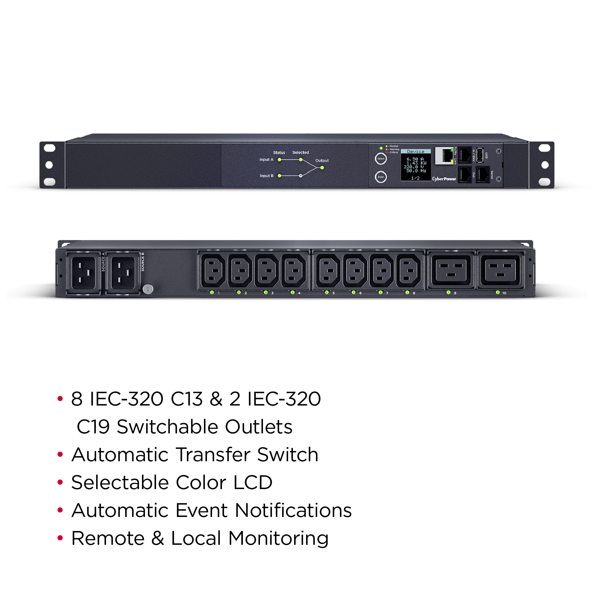 The PDU44006 supports inputs between 200-240V and includes (8) IEC C13 and (2) IEC C19 outlets. Dual NEMA L6-20P power cords are plugged into separate power sources (A and B), and information about each power source is clearly displayed on the front panel LED indicator lights. Other features include an LCD with selectable background color, built-in web interface, and power event notifications. The CyberPower PDU44006 is protected by a three-year limited warranty.