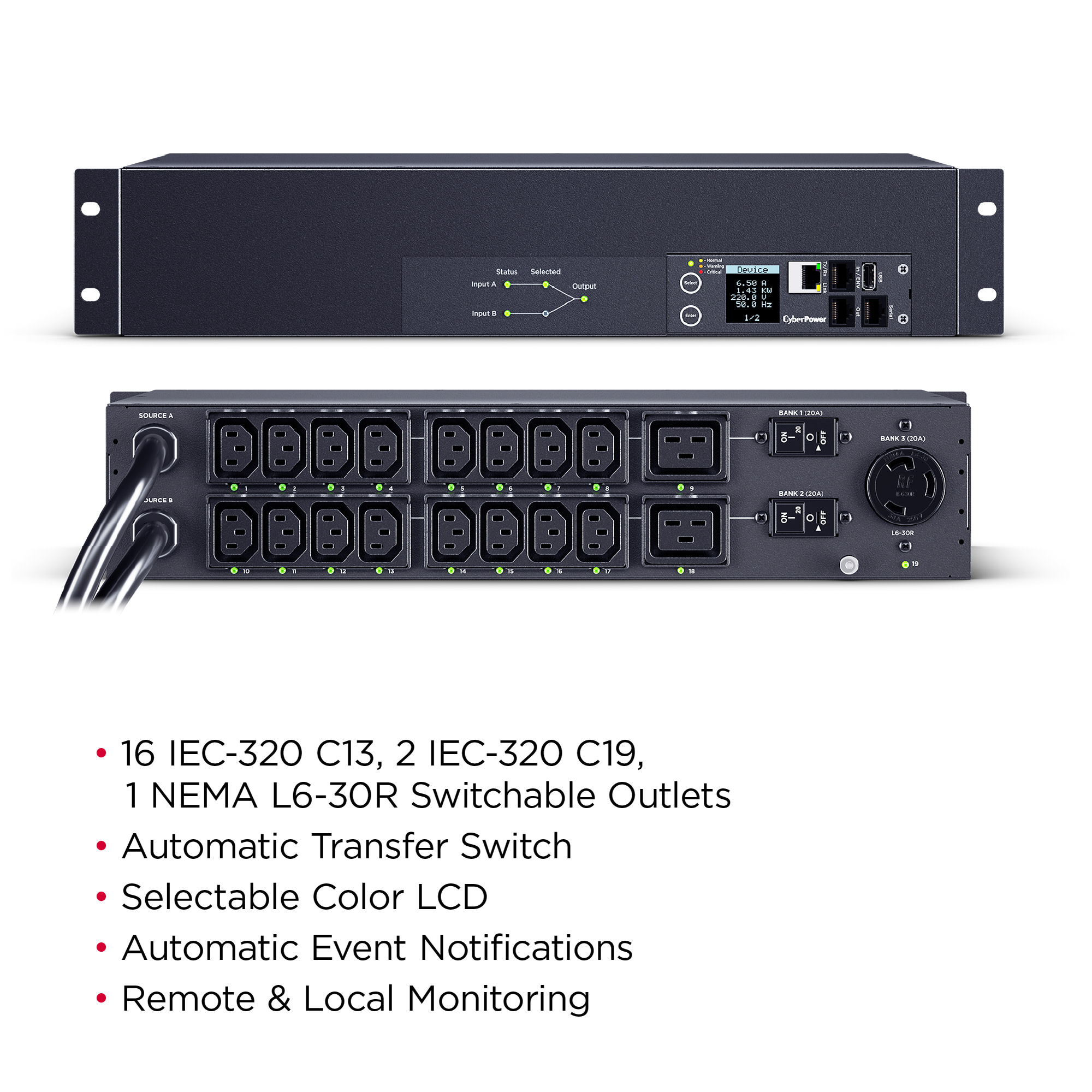 The PDU44007 supports inputs between 200-240V and includes (16) IEC C13, (2) IEC C19, and (1) NEMA L6-30R outlets. Dual NEMA L6-30P power cords are plugged into separate power sources (A and B), and information about each power source is clearly displayed on the front panel LED indicator lights. Other features include an LCD with selectable background color, built-in web interface, and power event notifications. The CyberPower PDU44007 is protected by a three-year limited warranty.