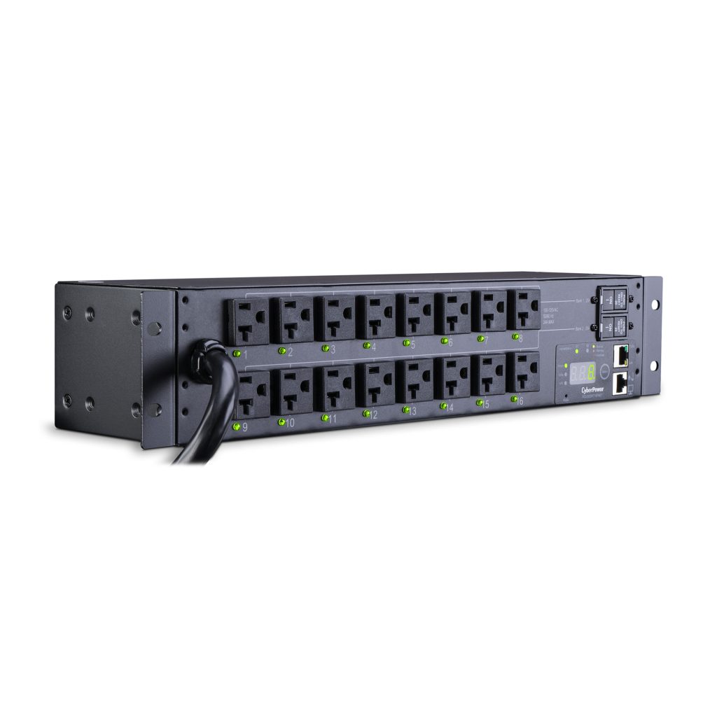 The CyberPower PDU30SWT16FNET, a 16-outlet (front), 2U rackmount switched power distribution unit (PDU), provides 120V 30A output. It distributes power to 16 NEMA 5-20R receptacles from a single twist lock NEMA L5-30P plug with unfiltered electrical pass-through. The switched outlet receptacles can be managed individually or collectively over the network, using the CyberPower Management Console, a web browser, and the RJ45 Ethernet port for network connection, or locally by using the LCD controls.