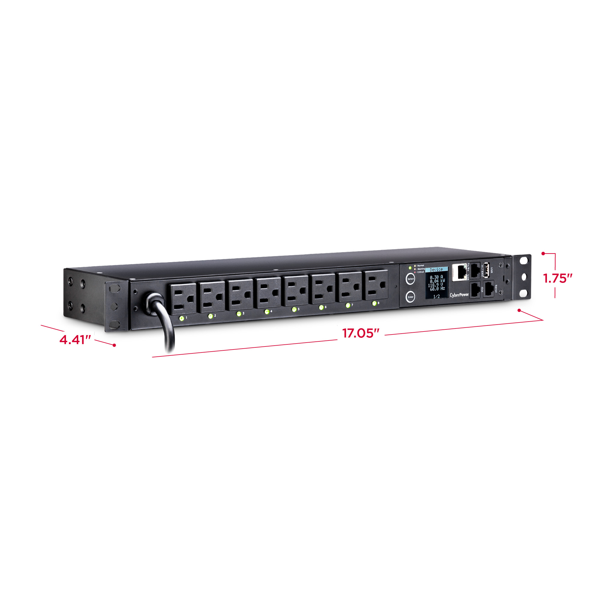 The CyberPower PDU41001, an 8-outlet (front), 1U rackmount switched power distribution unit (PDU), provides 120V 15A output. It distributes power to 8 NEMA 5-15R receptacles from a single NEMA 5-15 plug with unfiltered electrical pass-through. The switched outlet receptacles can be managed individually or collectively over the network, using the CyberPower Management Console, a web browser, and the RJ45 Ethernet port for network connection, or locally by using the LCD controls.
