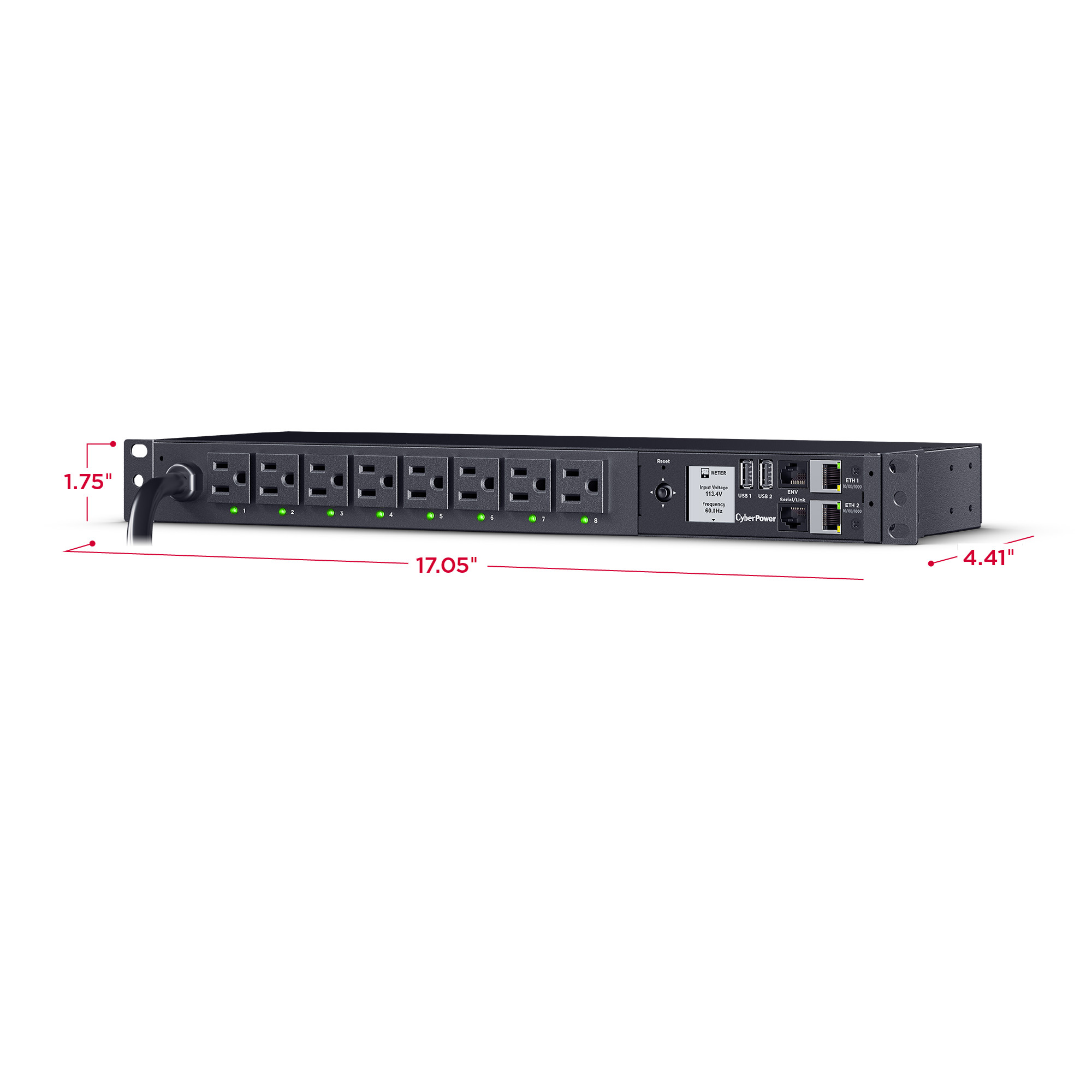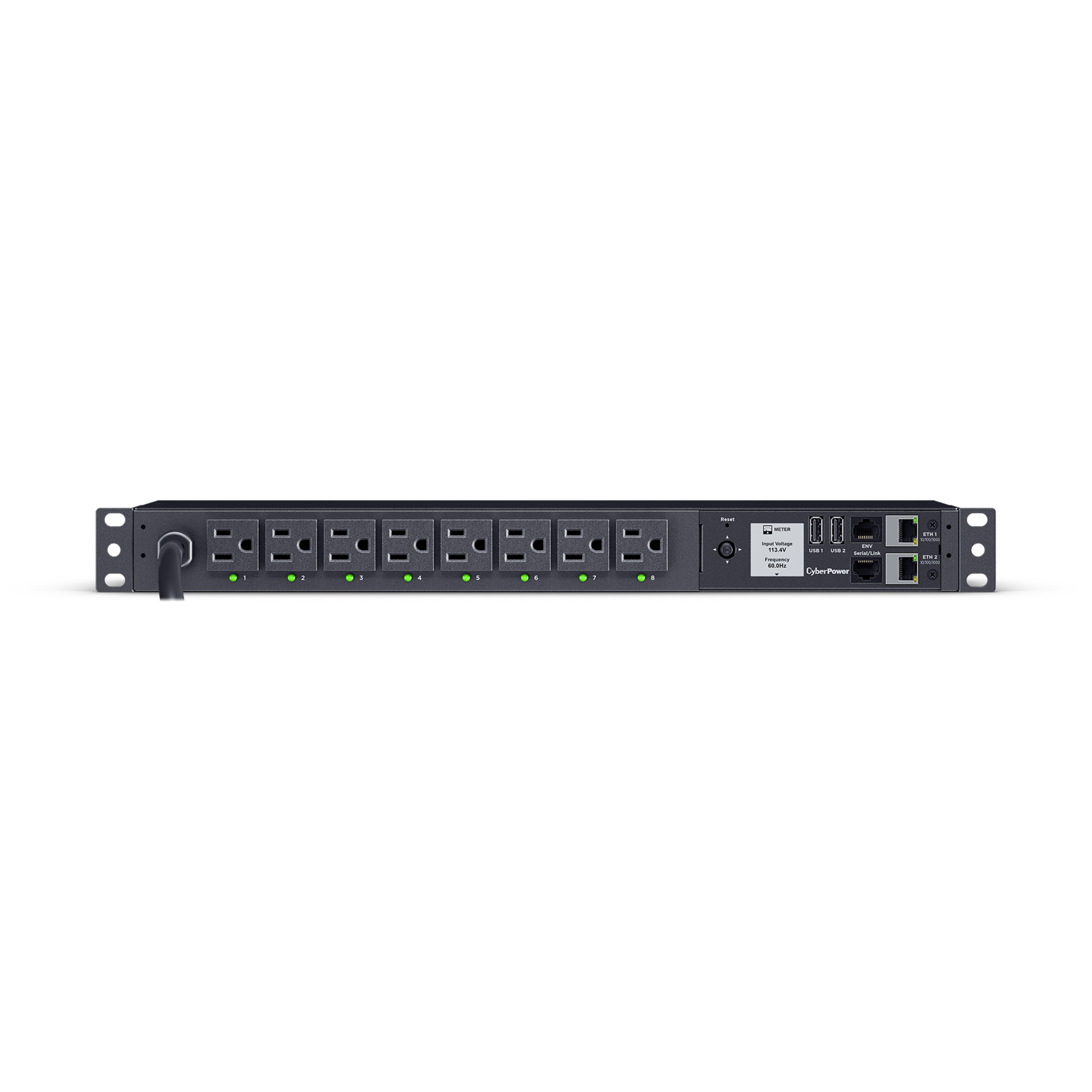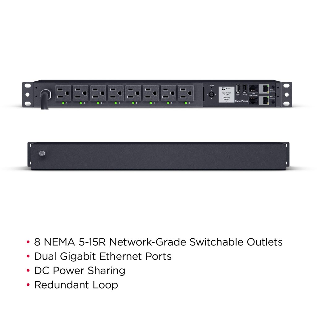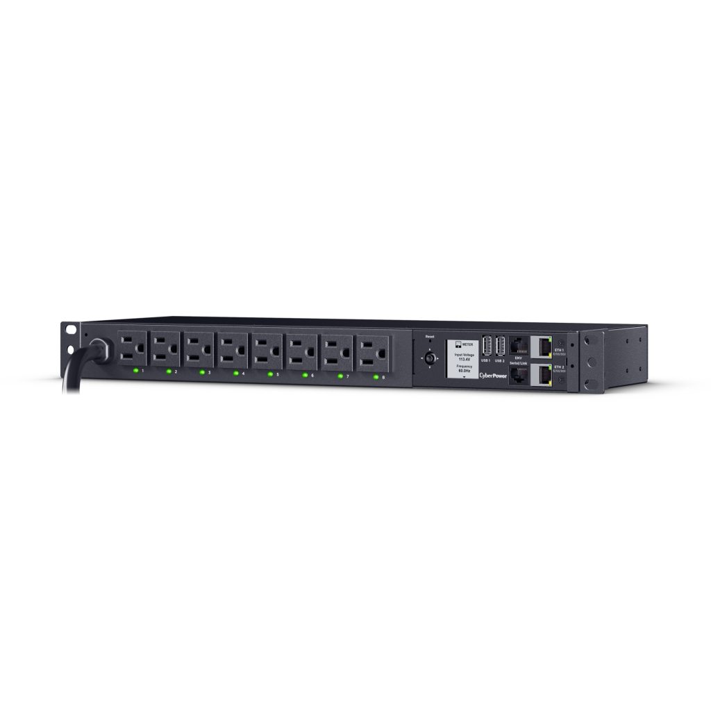 The CyberPower PDU41001G, an 8-outlet (front), 1U rackmount gigabit switched power distribution unit (PDU), provides 120V 15A output. It distributes power to 8 NEMA 5-15R receptacles from a single NEMA 5-15 plug with unfiltered electrical pass-through. The switched outlet receptacles can be managed individually or collectively over the network, using the CyberPower Management Console, a web browser, and the RJ45 Ethernet port for network connection, or locally by using the LCD controls.