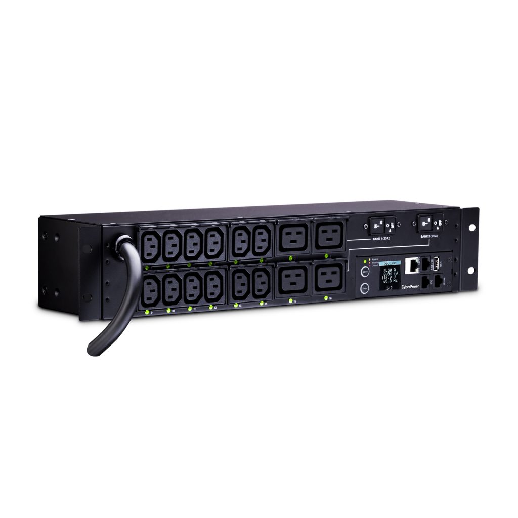 The CyberPower PDU41008, a 16-outlet (front), 2U rackmount switched power distribution unit (PDU), provides 200-240V 30A output. It distributes power to twelve (12) IEC C13 receptacles and four (4) IEC C19 receptacles from a single NEMA L6-30P plug with unfiltered electrical pass-through. The switched outlet receptacles can be managed individually or collectively over the network, using the CyberPower Management Console, a web browser and the RJ45 Ethernet port for network connection, or locally by using the LCD controls.