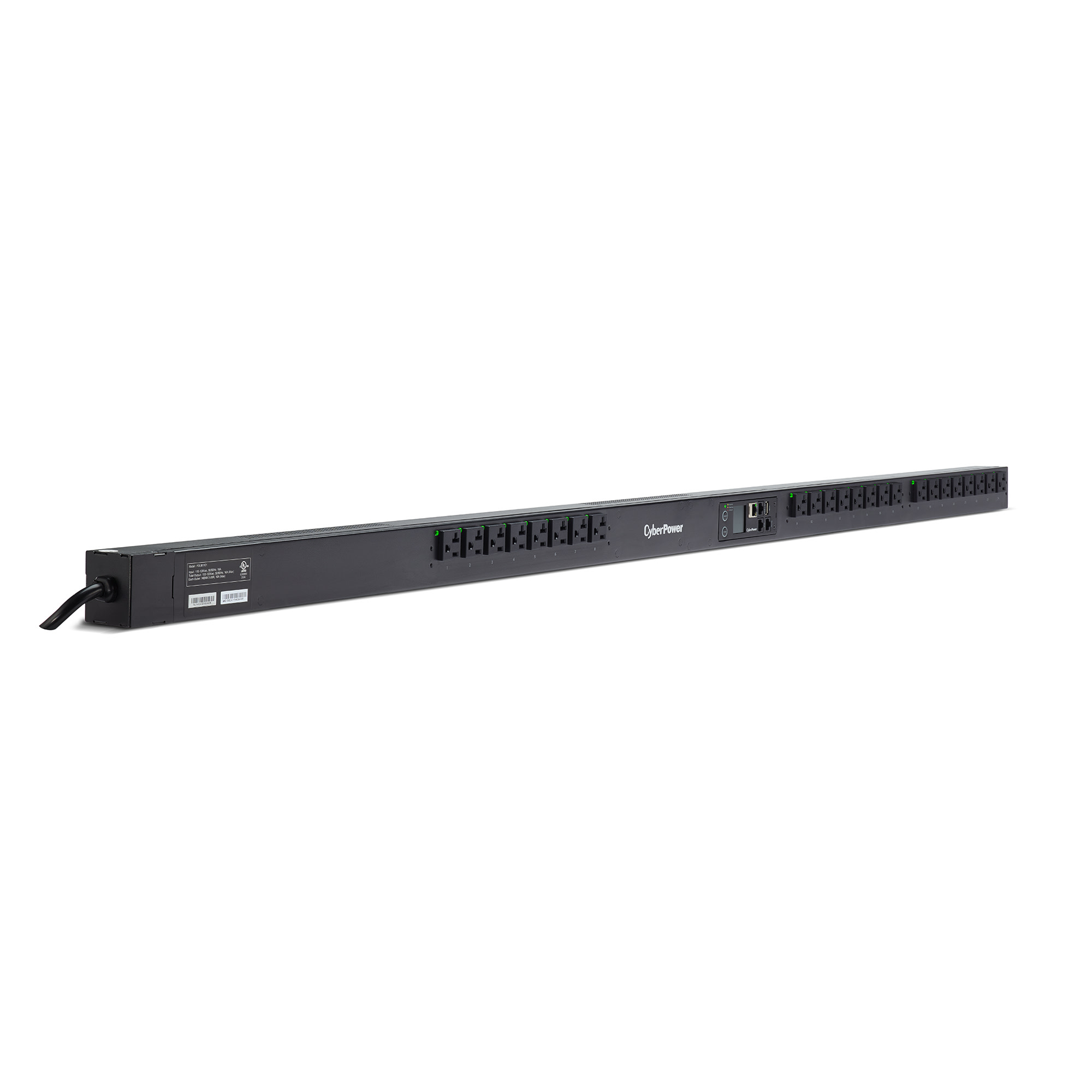 The CyberPower PDU41101 is a 0U rackmount switched power distribution unit or PDU that has 24 outlets and provides 120V 20A output. This PDU distributes power to 24 NEMA 5-20R receptacles from a single NEMA (L)5-20P plug with unfiltered electrical pass-through.