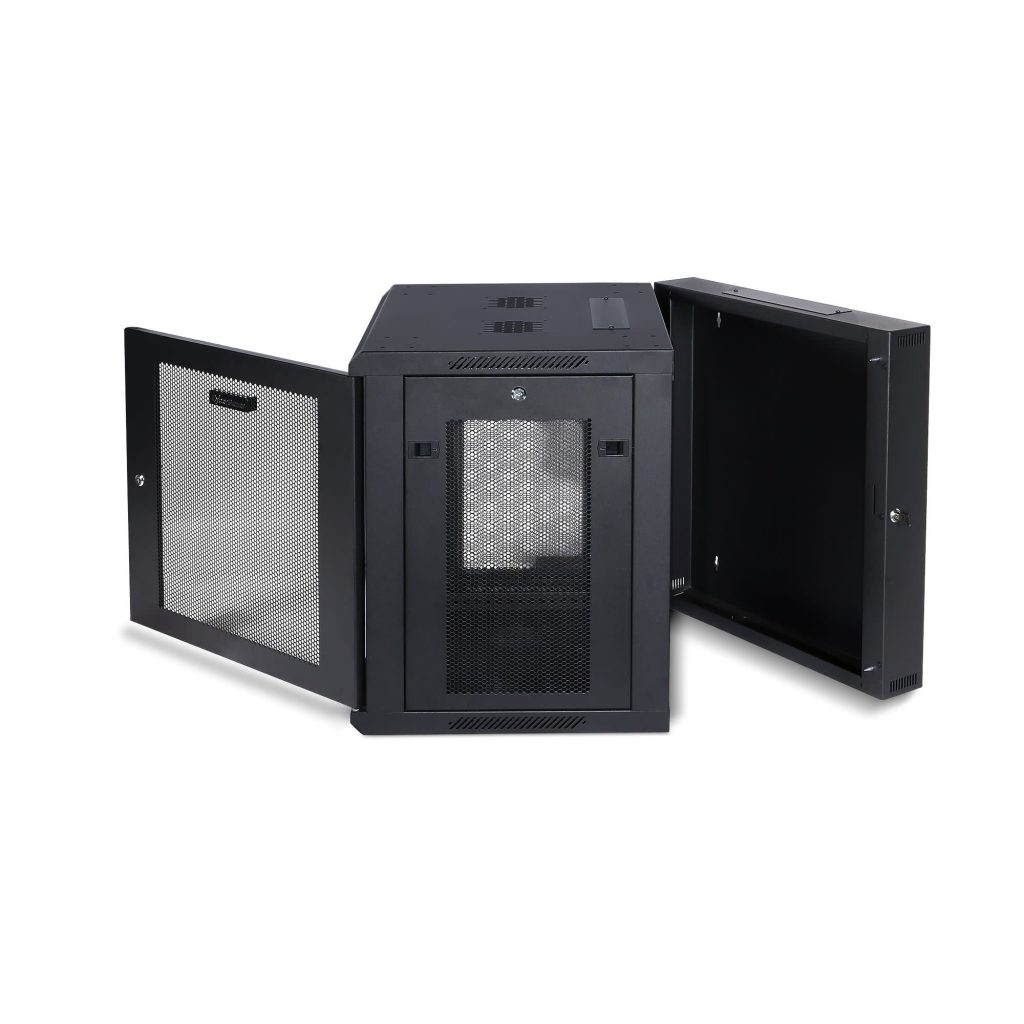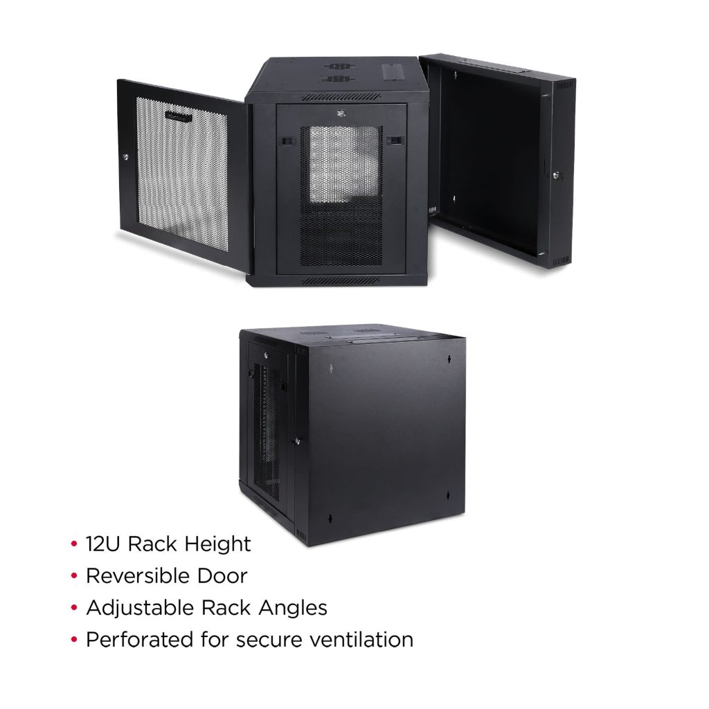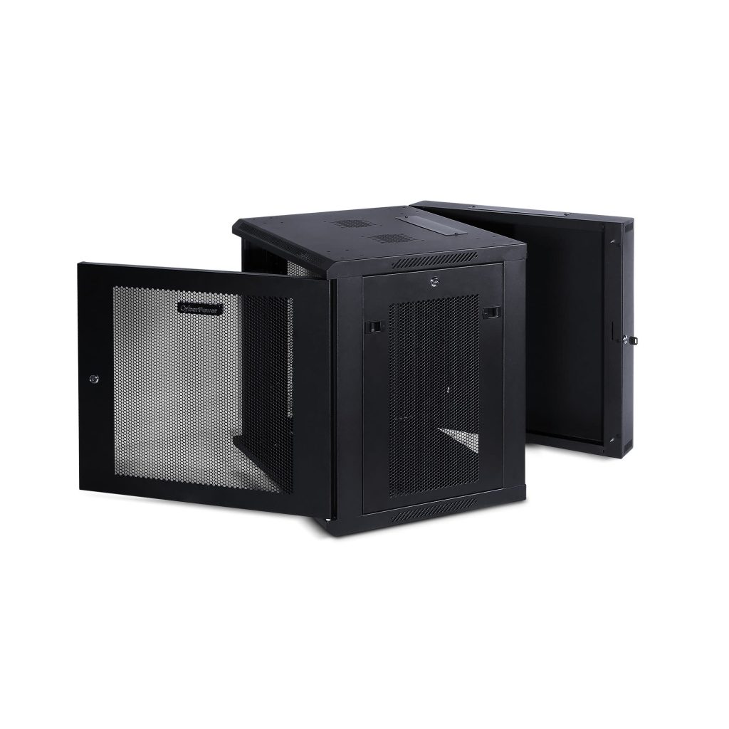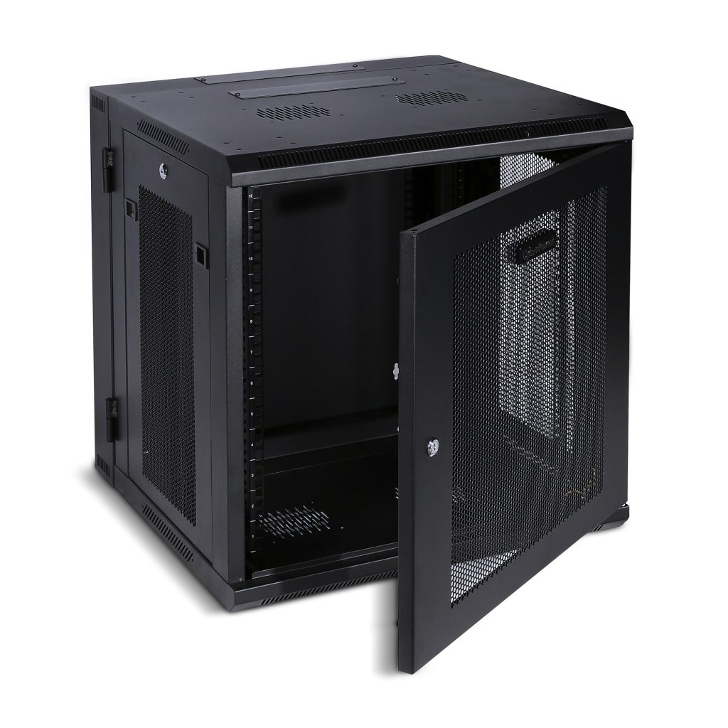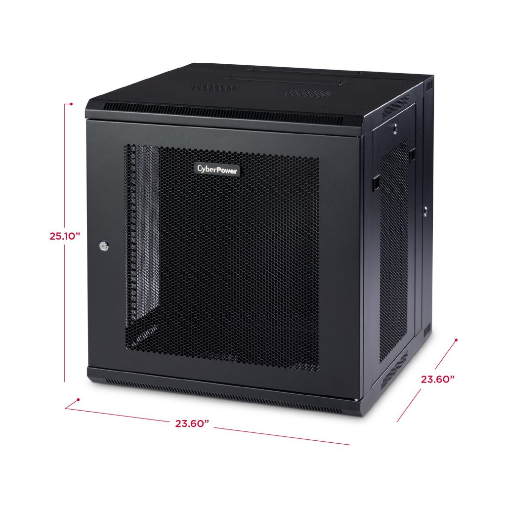 The CR12U51001 is designed for use in network closets, classrooms, and other locations. It houses network switches and patch panels up to 22 inches deep. This rack features convenient top panel cable access openings, perforated doors and side panels for efficient airflow, adjustable rack angles, and square and threaded mounting holes. The CR12U51001 ships fully assembled for quick deployment and can be customized with compatible accessories. It is covered by a 5-year limited warranty.