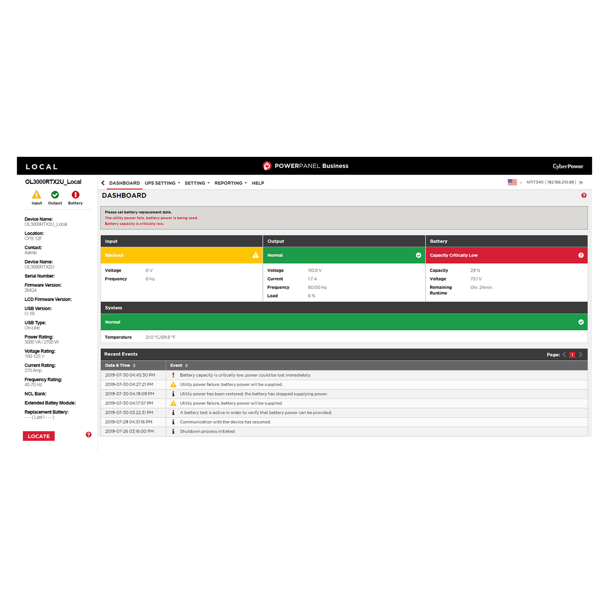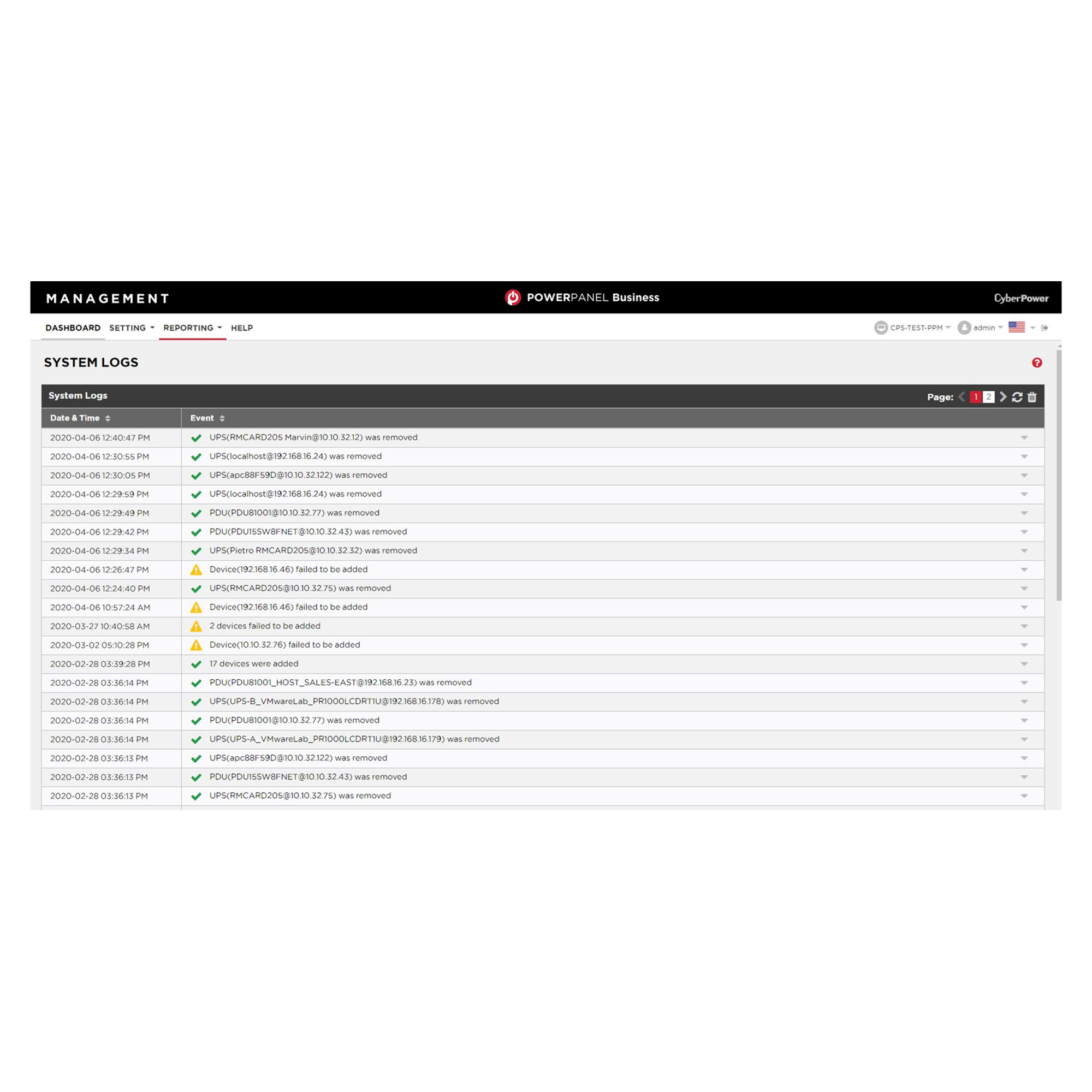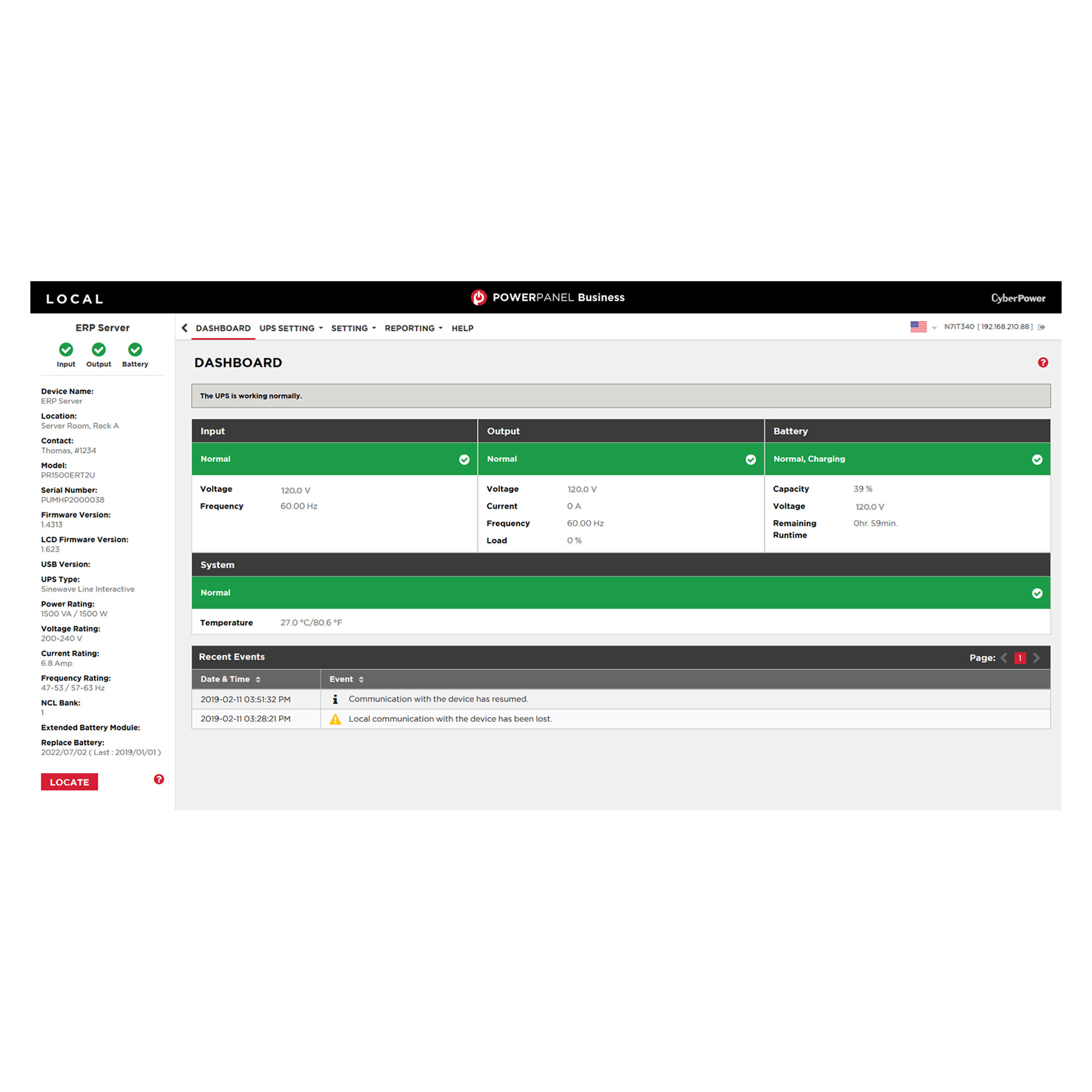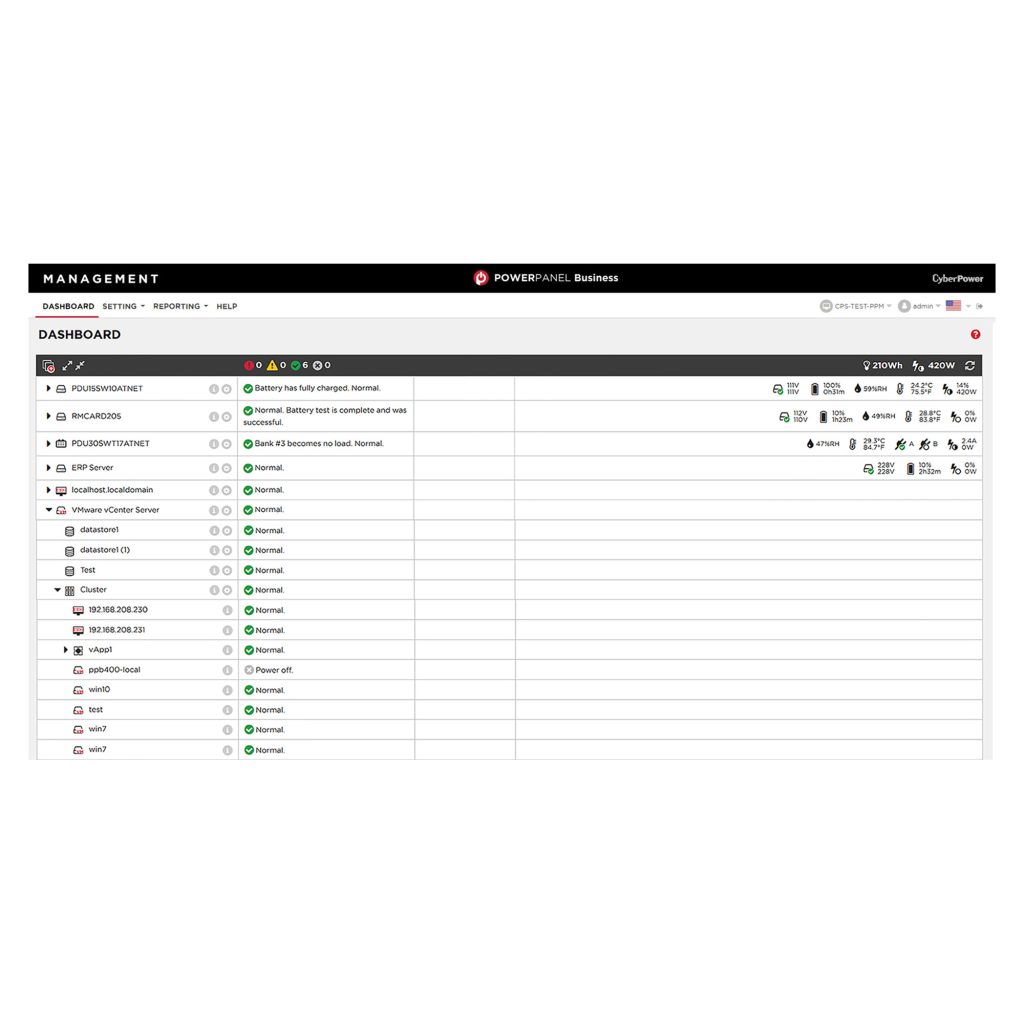 PowerPanel® Business software features the most intuitive power management dashboard design on the market. Users can easily monitor and manage CyberPower UPS systems and network-connected PDUs at anytime from anywhere. The user-friendly dashboard provides real-time status at a glance and instant recognition of problems.
