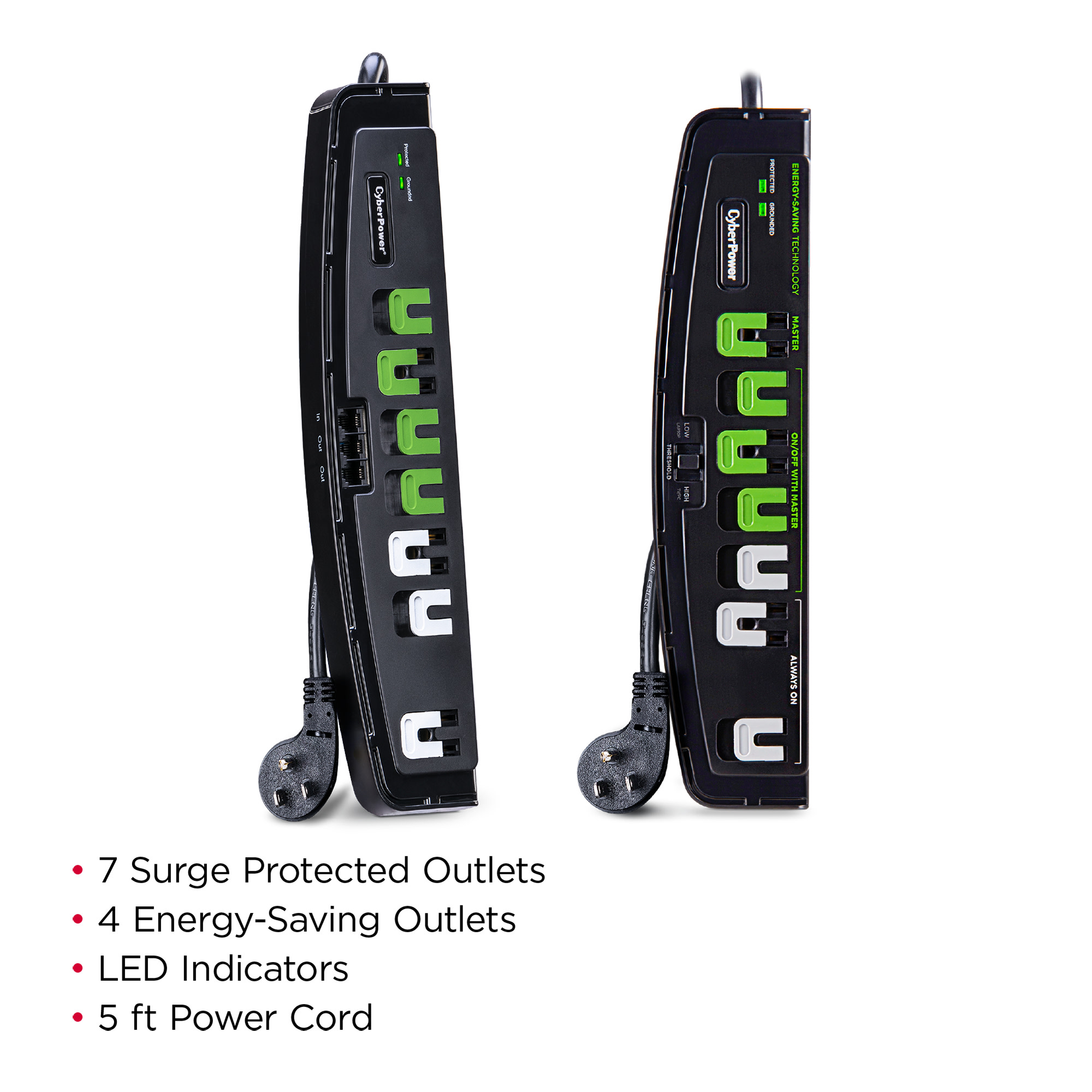 The CyberPower P705G is a commercial and residential surge protector for personal computers, large flat screen TVs, printers, speakers, scanners and home electronics. It offers seven (7) total surge protected outlets and four (4) Energy-Saving outlets designed to turn off up to four connected devices when your TV or PC is shut down or goes into standby mode. The Energy-Saving Threshold Switch keeps the energy-saving feature active when the Master Outlet detects low power consumption.