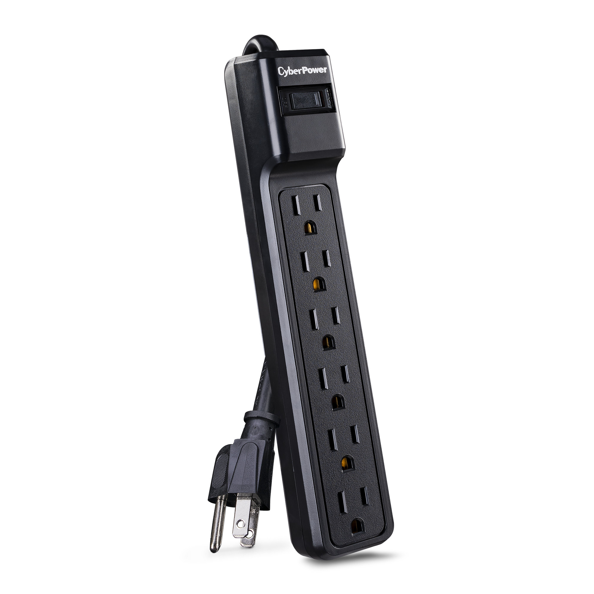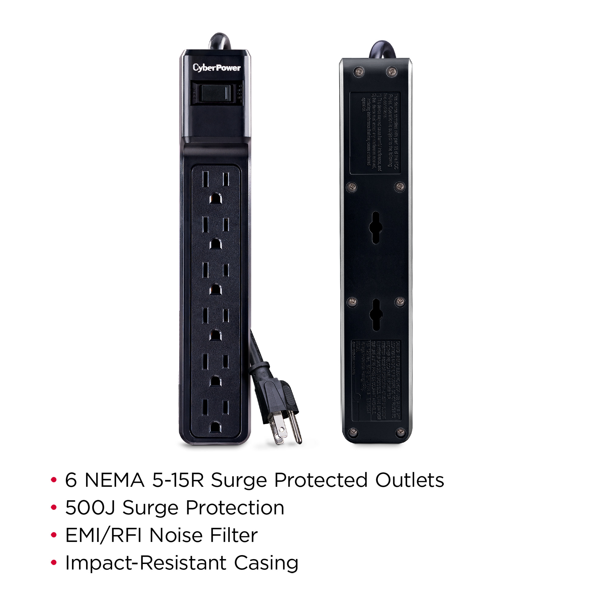 The CyberPower B602RC1BK surge protector offers protection for home and office devices such as computers and electronics. It prevents energy spikes caused by storms and electrical power surges from reaching and potentially harming your electronic equipment. The B602RC1BK provides 500 joules of protection with 6 outlets and a 2 foot power cord. Features of the B602RC1BK include automatic shutdown, metal oxide varistor (MOV) technology, mounting slots, and an impact-resistant casing. This surge protector comes with a Limited Lifetime Warranty and a $25,000 Connected Equipment Guarantee.