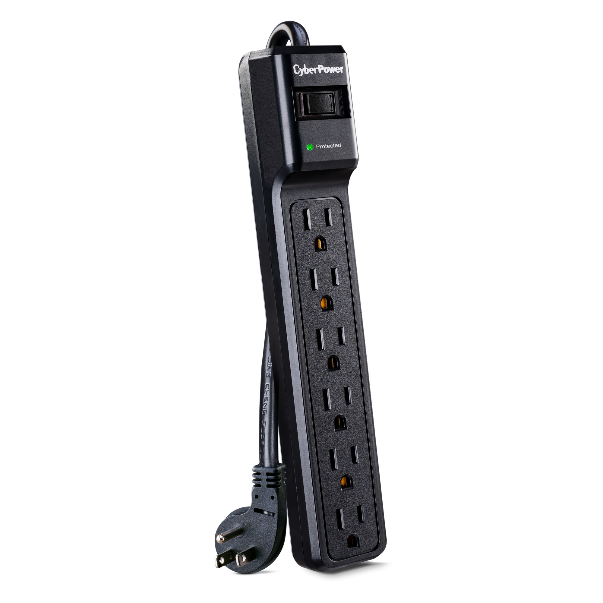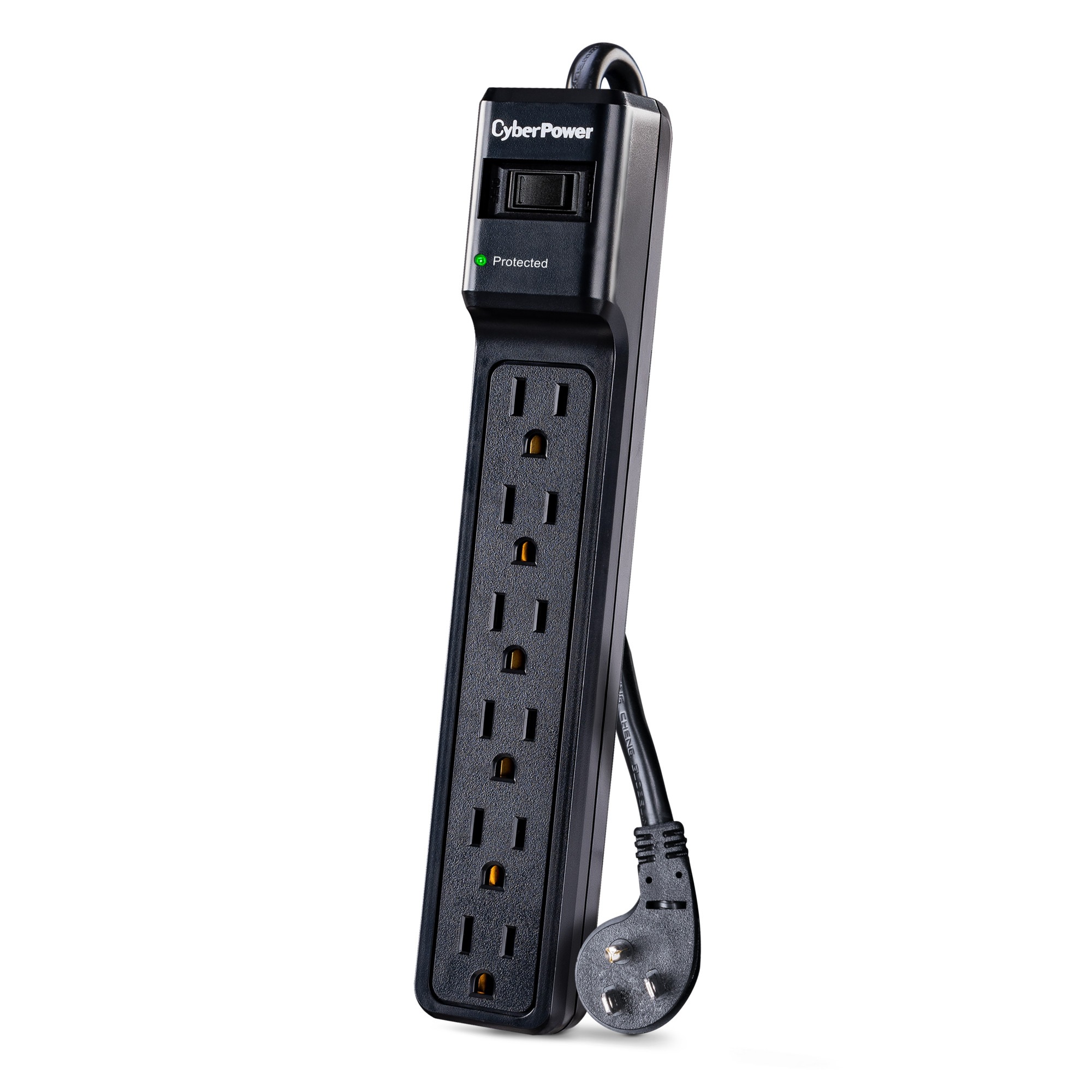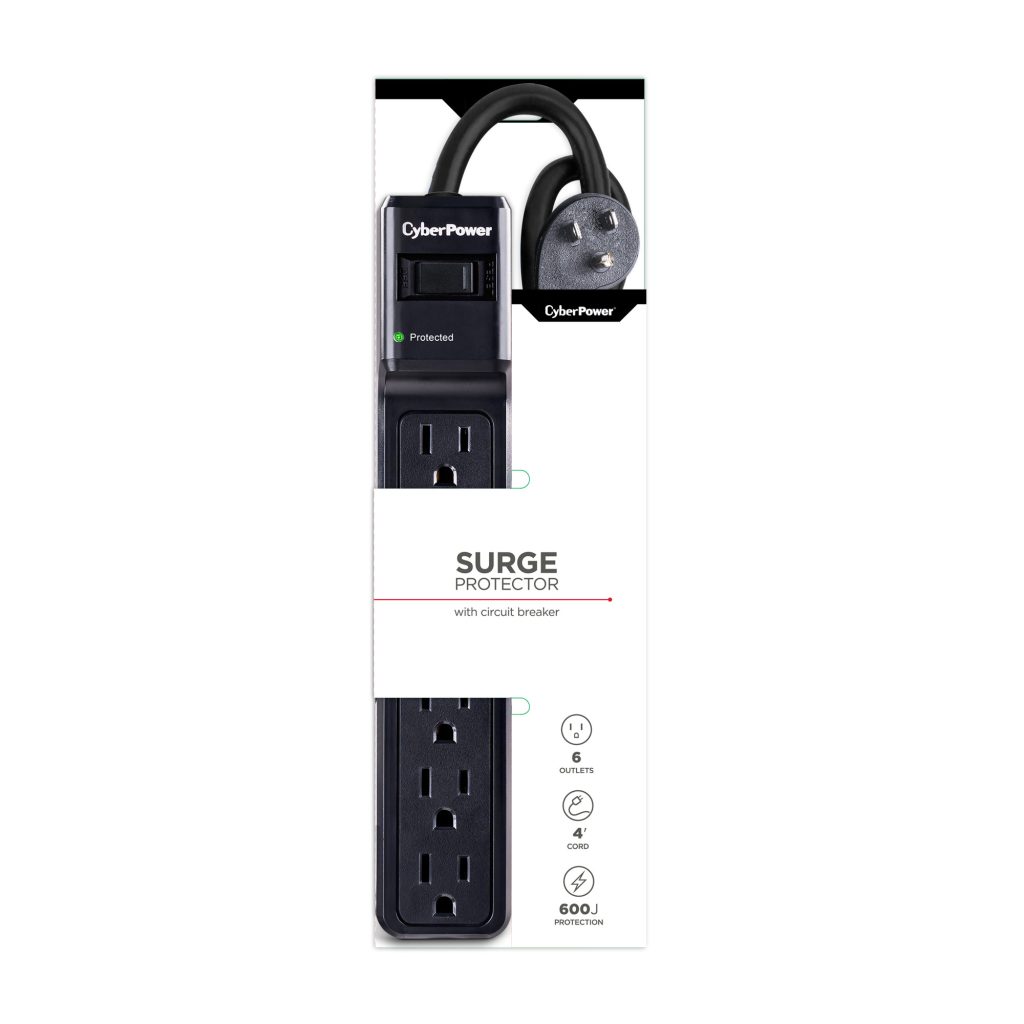 The CyberPower B604BK Surge Protector delivers reliable protection for home and office electronics, safeguarding computers and other sensitive devices from power surges and electrical fluctuations. Designed to withstand energy spikes caused by storms or grid irregularities, it provides 600 joules of surge protection across six outlets. Its durable 4-foot power cord features a space-saving right-angle plug for convenient and flexible placement.