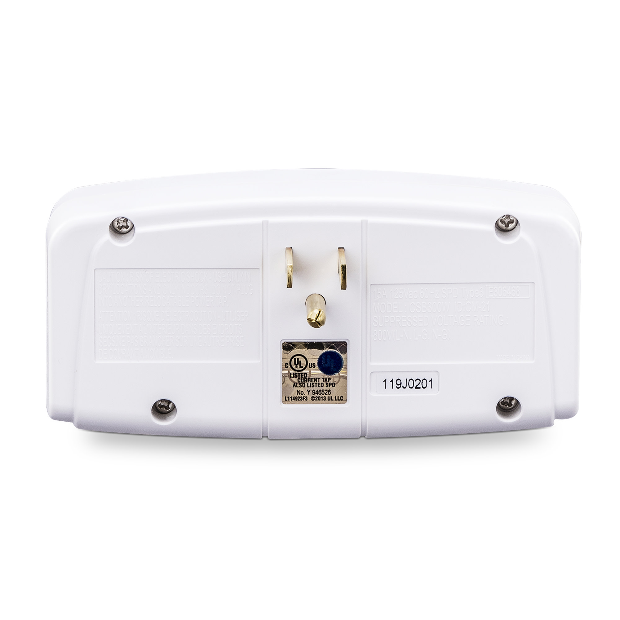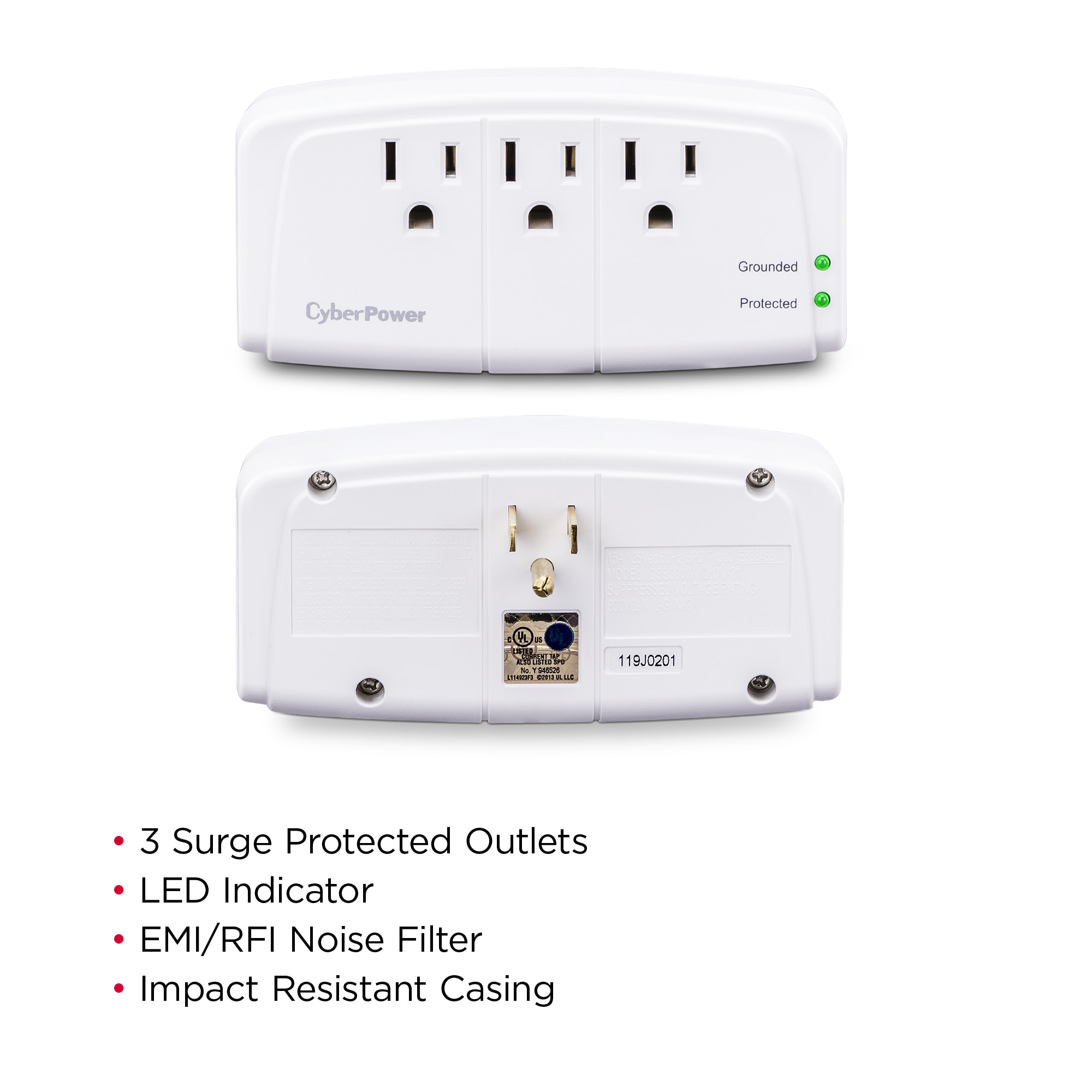 Features of the CSB300W include metal oxide varistor (MOV) technology, an EMI/RFI noise filter, LED status indicators, and impact-resistant casing. This compact surge suppressor comes with a Limited Lifetime Warranty and a Connected Equipment Guarantee.