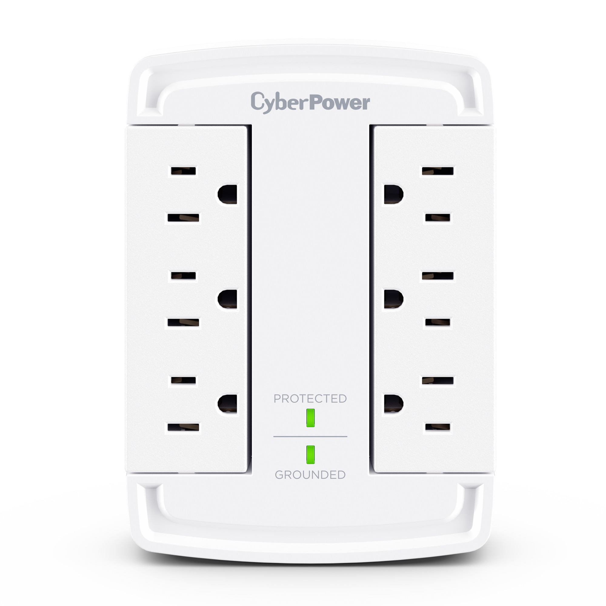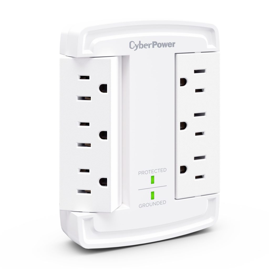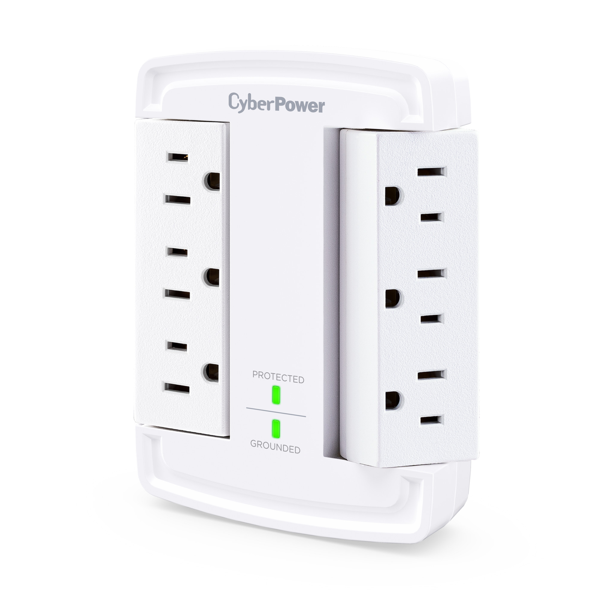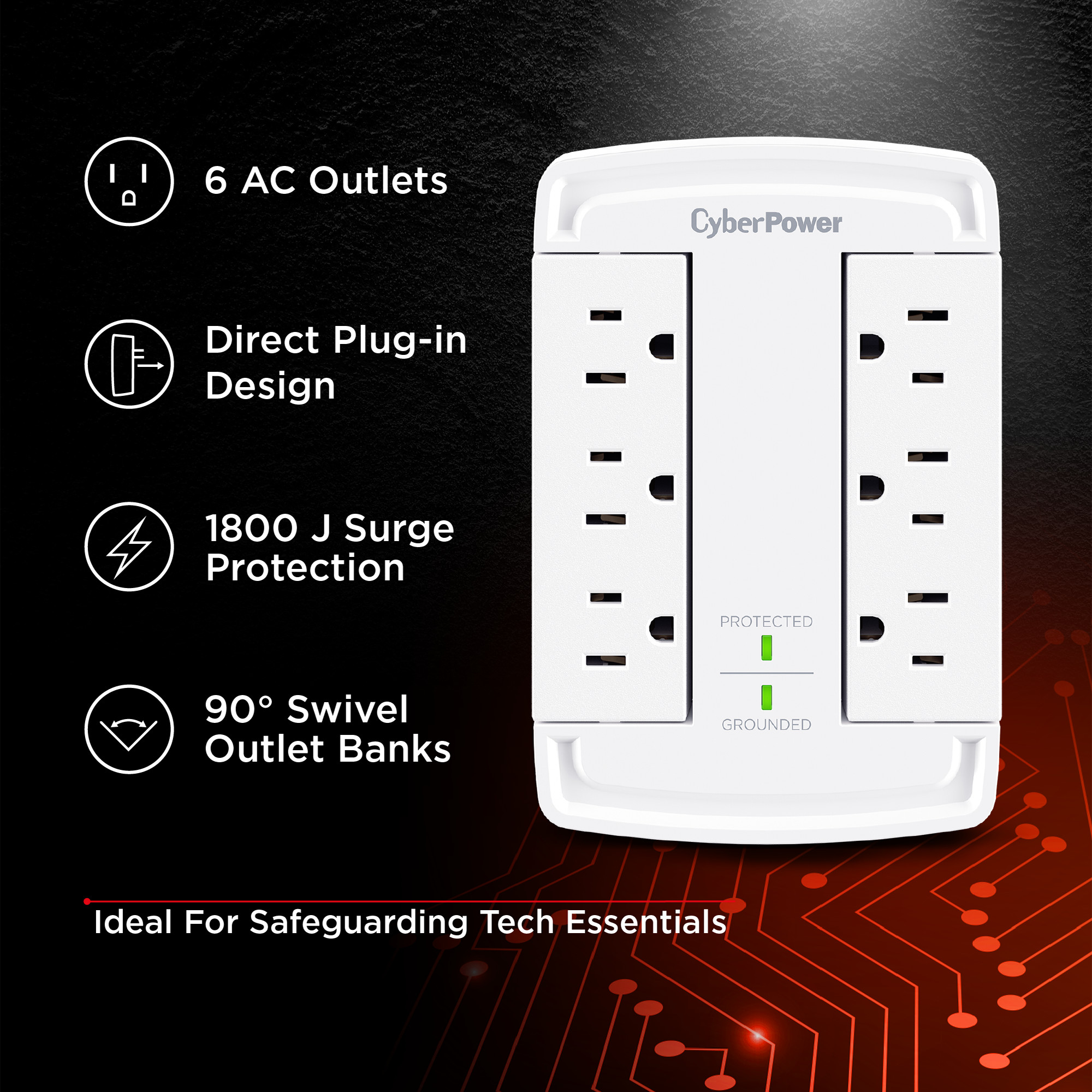 The CyberPower CSB6WS Surge Protector transforms a standard 2-outlet wall socket into six surge-protected outlets, giving you the space and safety your devices need. Perfect for crowded areas where chargers, computers, and electronics compete for limited plugs. Featuring dual swiveling outlet banks, this surge protector offers flexible positioning and improved cord management—keeping your setup neat and organized. With 1800 joules of surge protection, it defends your valuable tech from power spikes and electrical surges. Ideal for safeguarding computers, routers, modems, chargers, and other personal tech essentials.