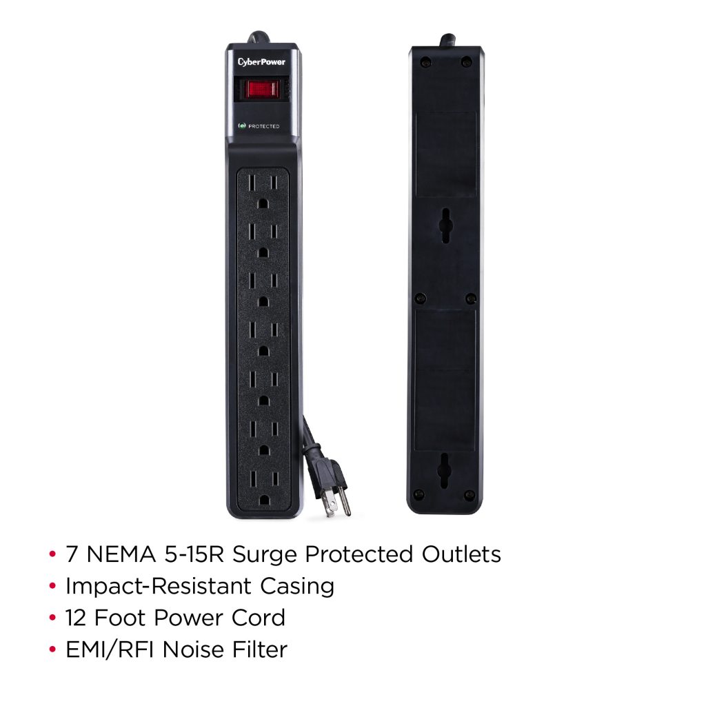 The CyberPower Essential Surge Protector CSB7012 offers vital surge protection for common home and office devices such as computers and electronics. It prevents spikes in energy caused by storms and electrical power surges from reaching your electronic equipment. The CSB7012 provides 1500 joules of protection, 7 outlets, a 12 ft. power cord.