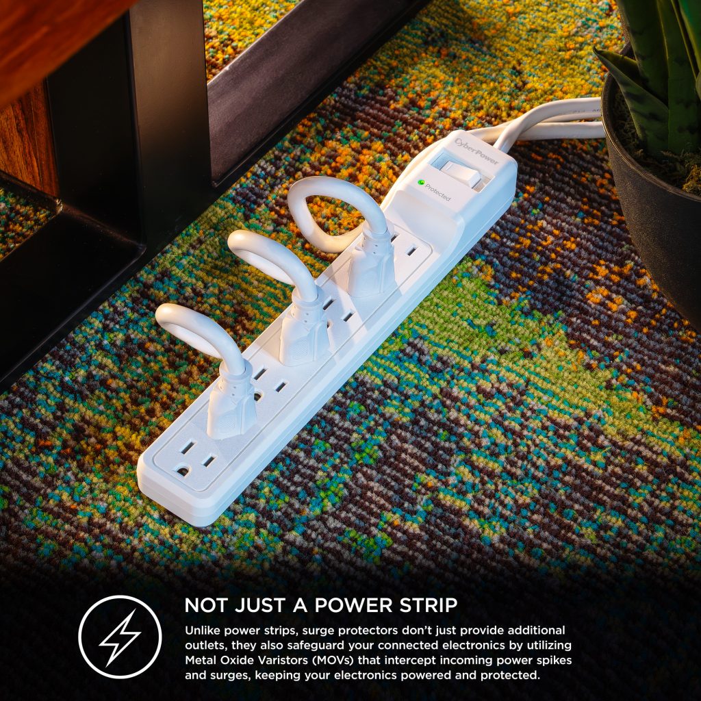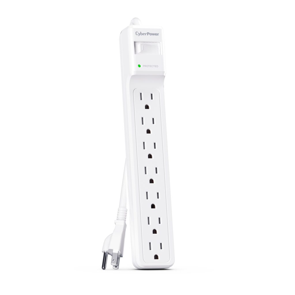 The CyberPower CSB706W surge protector safeguards home and office electronics, like computers, from power spikes and surges. It delivers 1800 joules of protection, featuring 7 outlets and a 6-foot power cord. Equipped with metal oxide varistor (MOV) technology, an EMI/RFI noise filter, and keyhole mounting slots, it ensures reliable performance. The CSB706W includes a Limited Lifetime Warranty and a Connected Equipment Guarantee.
