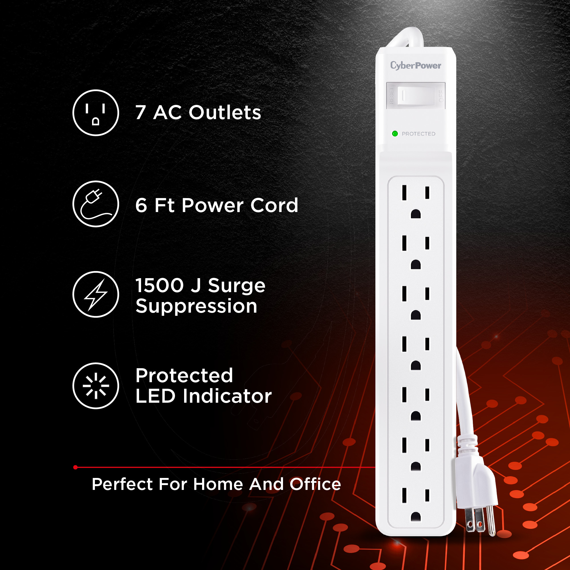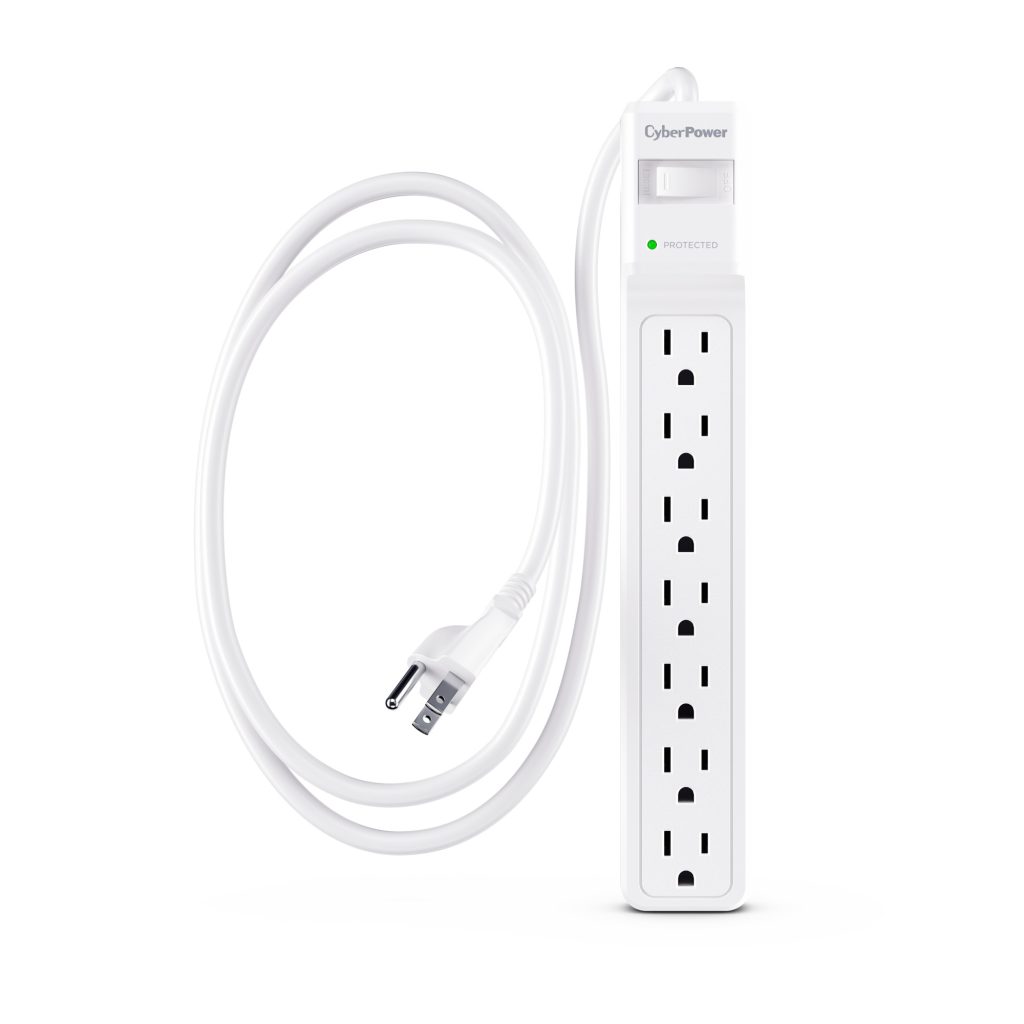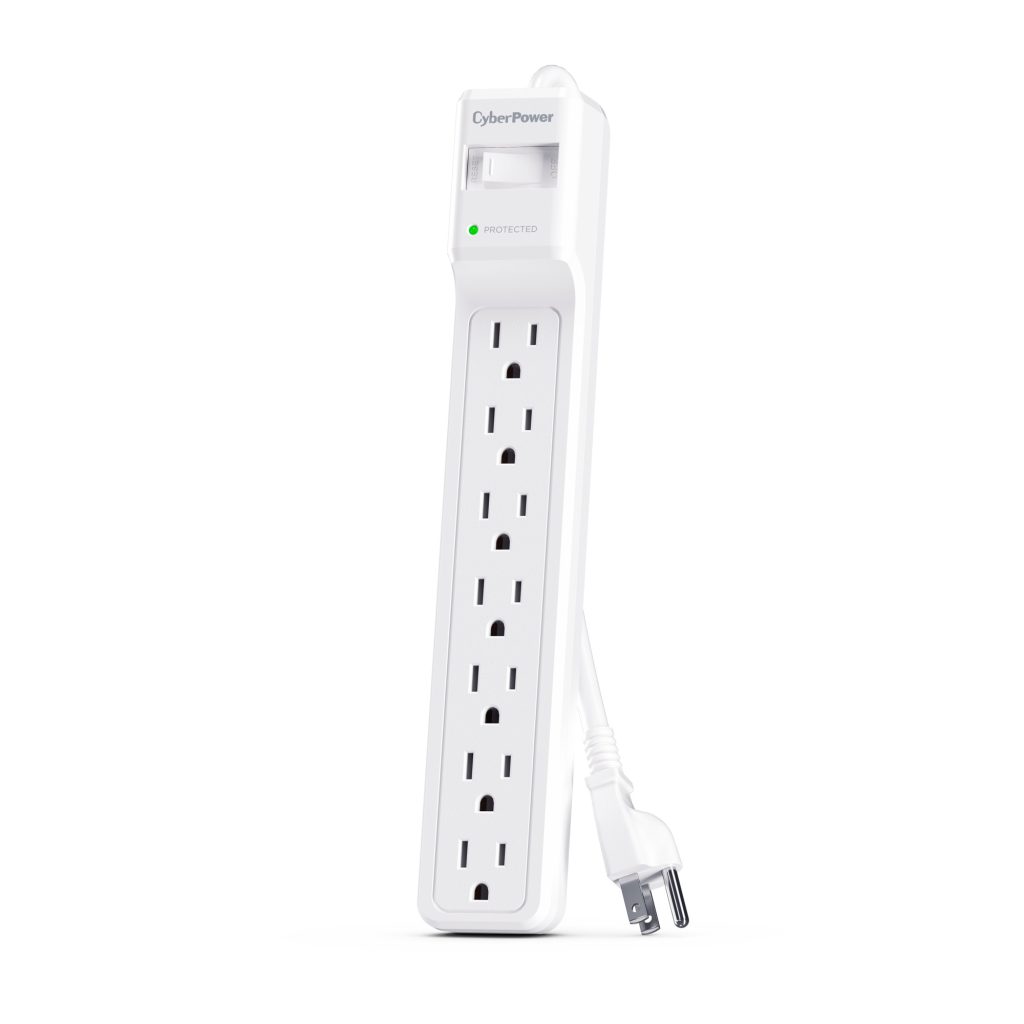 The CyberPower CSB706W surge protector safeguards home and office electronics, like computers, from power spikes and surges. It delivers 1800 joules of protection, featuring 7 outlets and a 6-foot power cord. Equipped with metal oxide varistor (MOV) technology, an EMI/RFI noise filter, and keyhole mounting slots, it ensures reliable performance. The CSB706W includes a Limited Lifetime Warranty and a Connected Equipment Guarantee.