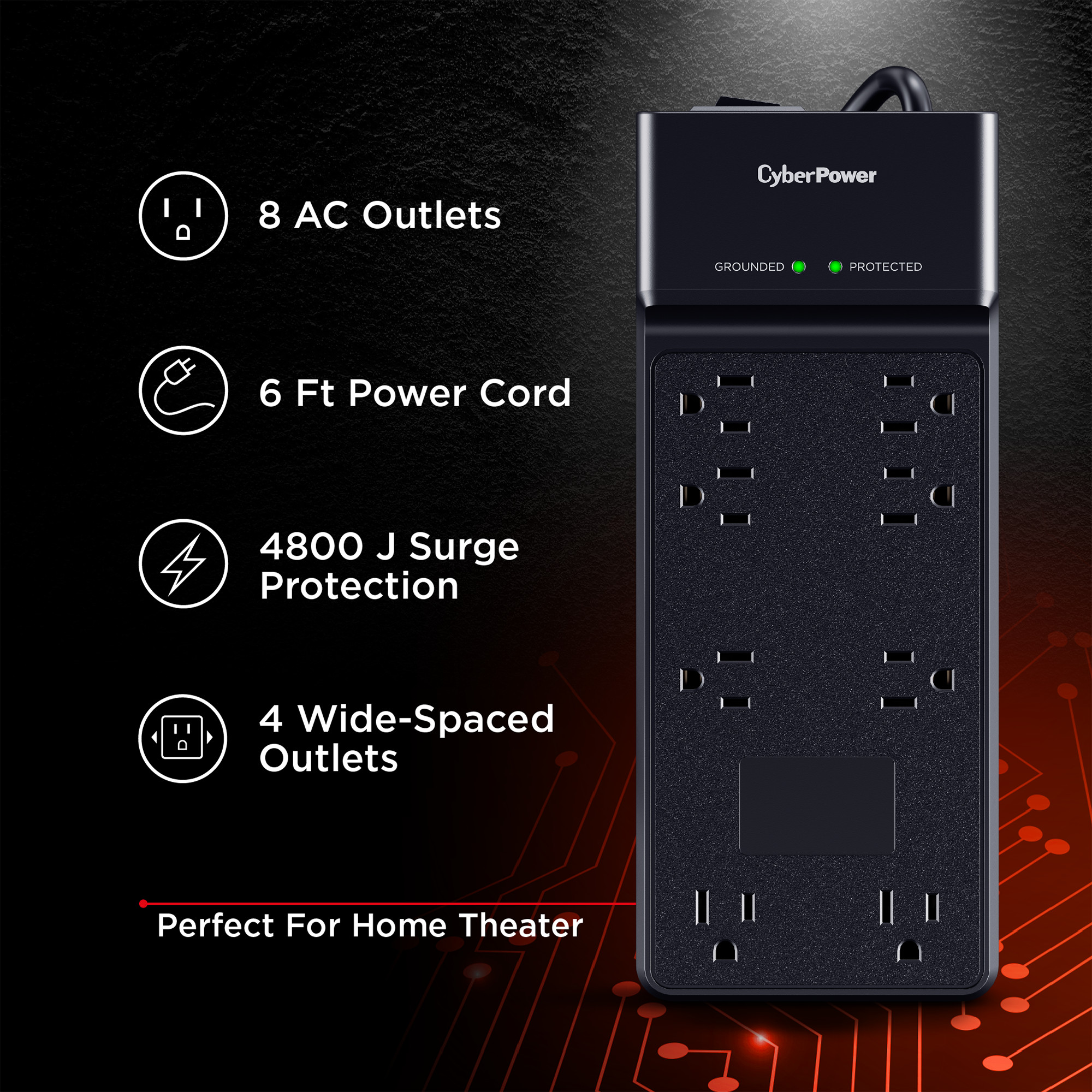 The CyberPower CSB806R1 offers powerful surge protection with 4800 joules across eight AC outlets, shielding your electronics from power spikes and electrical disturbances. Four widely spaced outlets accommodate larger plugs, while the 6-foot heavy-duty cord allows flexible placement. Ideal for protecting computers, home office gear, and entertainment systems.