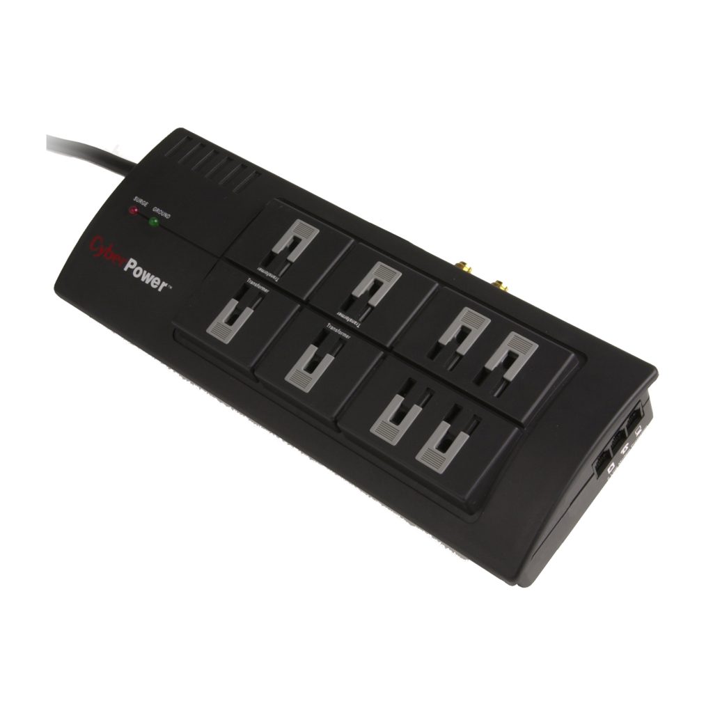 The CyberPower 880 surge suppressor is a computer/audio/video-grade model that provides 2800 joules of protection and has 8 surge-protected outlets. It is equipped with an RJ11 port that protects phone/fax/modem/DSL equipment, as well as a gold-plated RG6 coaxial port that is perfect for your cable modem, cable TV lines, and DSS equipment. Electromagnetic and radio frequency interference (EMI/RFI) shielding will rid your equipment from any harmful EMI/RFI interferences. Metal oxide varistor (MOV) technology ensures the protection of all connected electronics and the surge suppressor itself.