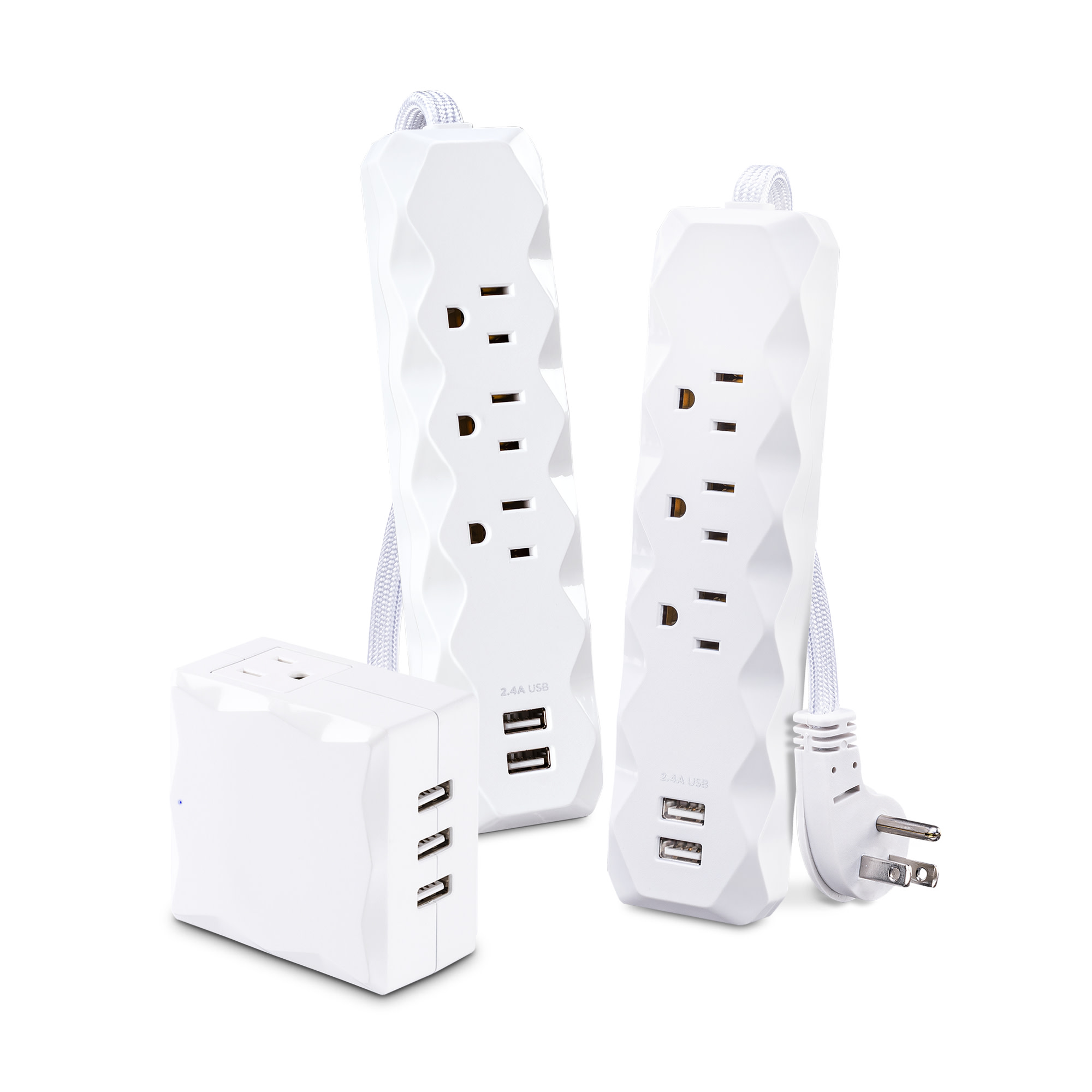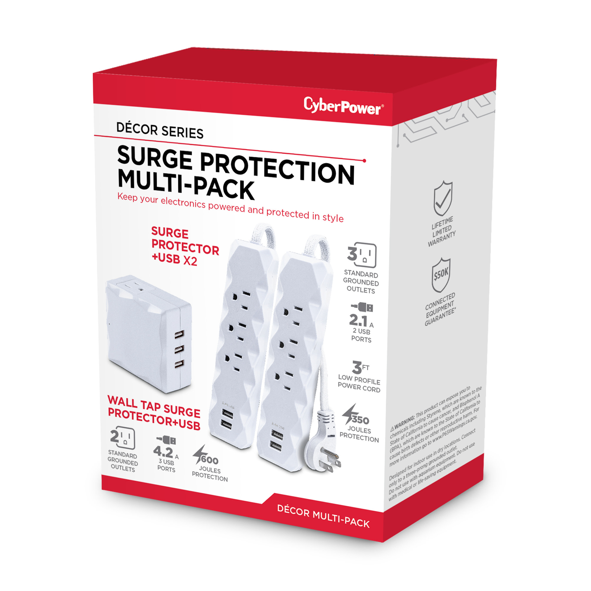 The Cyberpower Surge Protector MP60BK combo pack comes with two three-outlet surge protector strips, and one two-outlet wall tap surge protector. Each surge protector in this combo pack provides protection to prevent damaging power spikes and surges from reaching your small electronics. These surge protectors include USB ports to quickly charge USB-powered devices, including tablets.