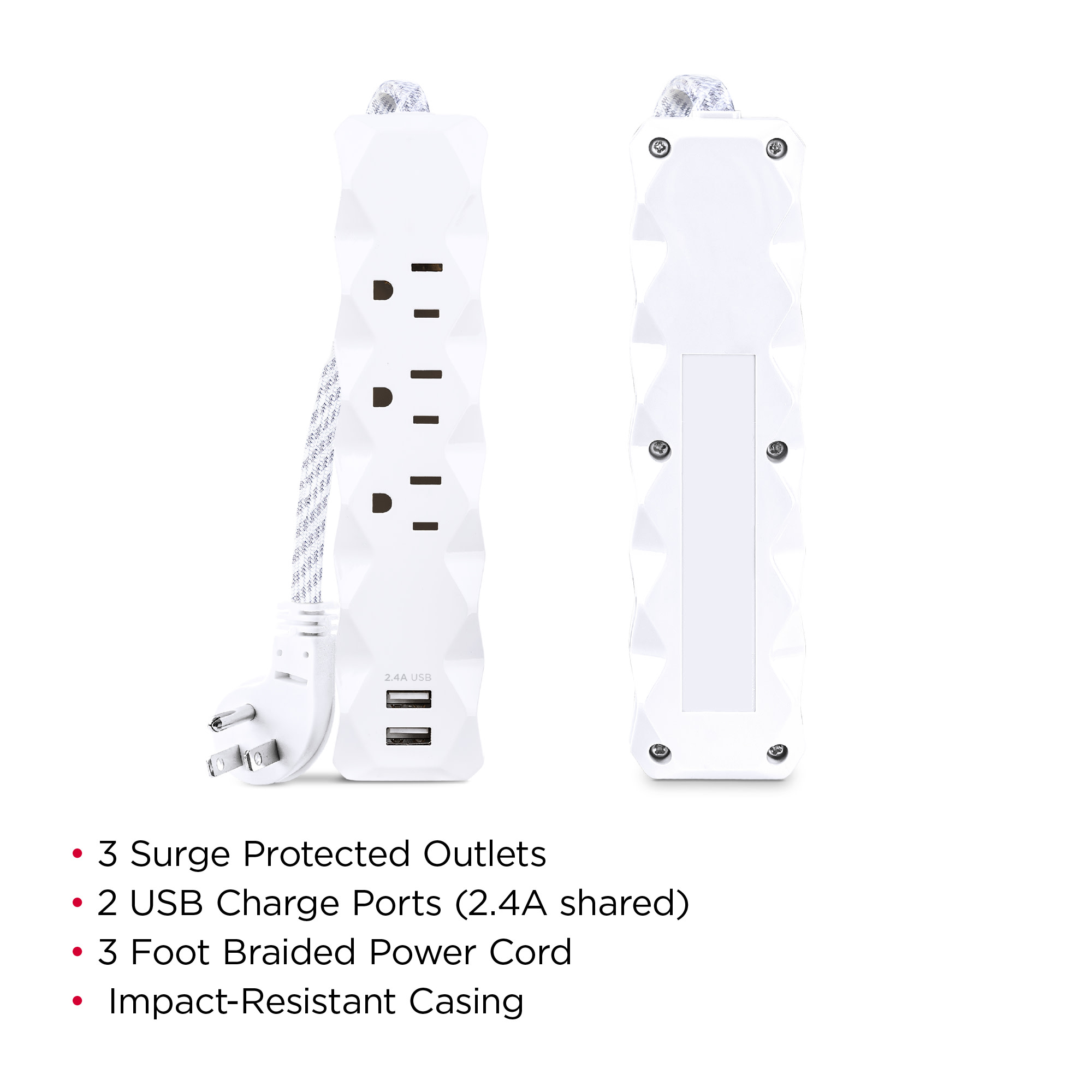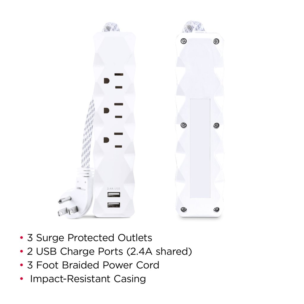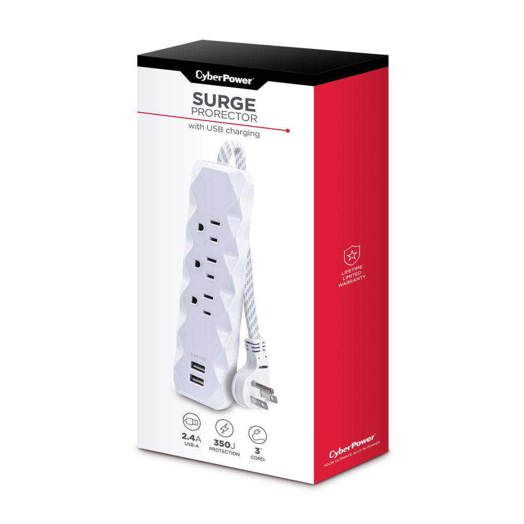 This Cyberpower Surge Protector provides protection to prevent damaging power spikes and surges from reaching your small electronics. The P303UWG surge protector includes 2 USB ports to quickly charge USB-powered devices, including tablets.