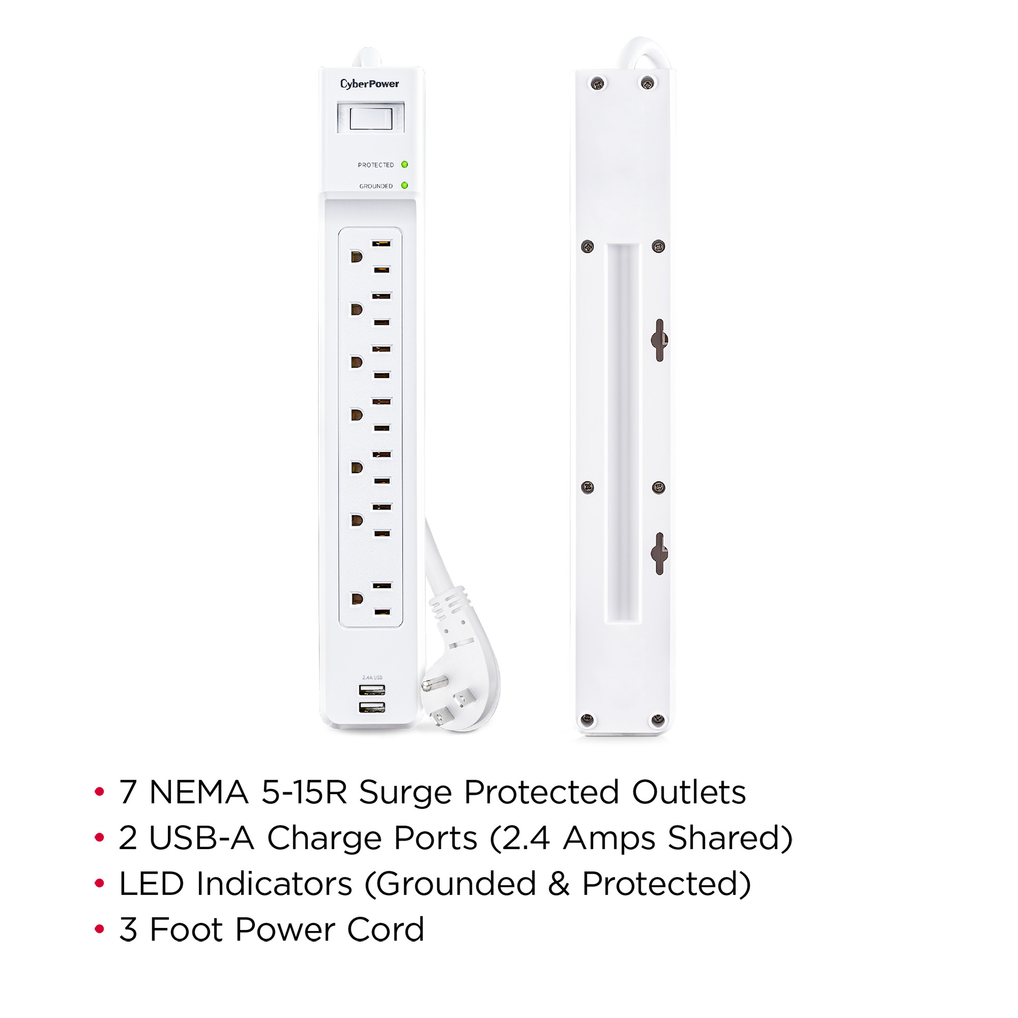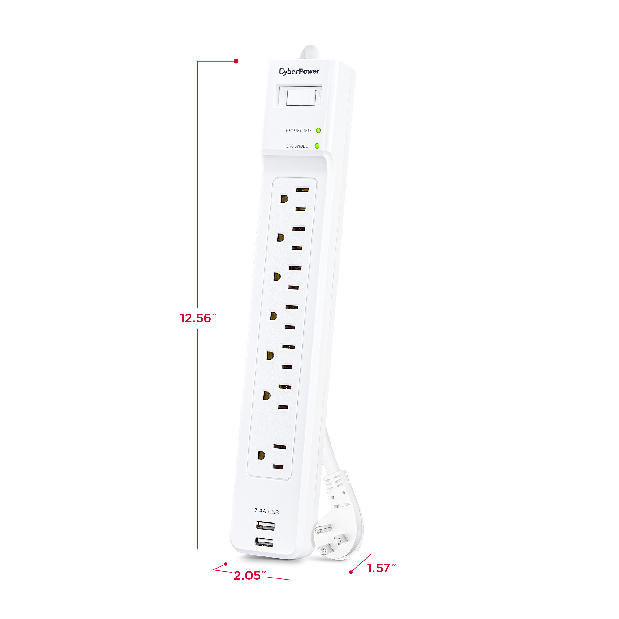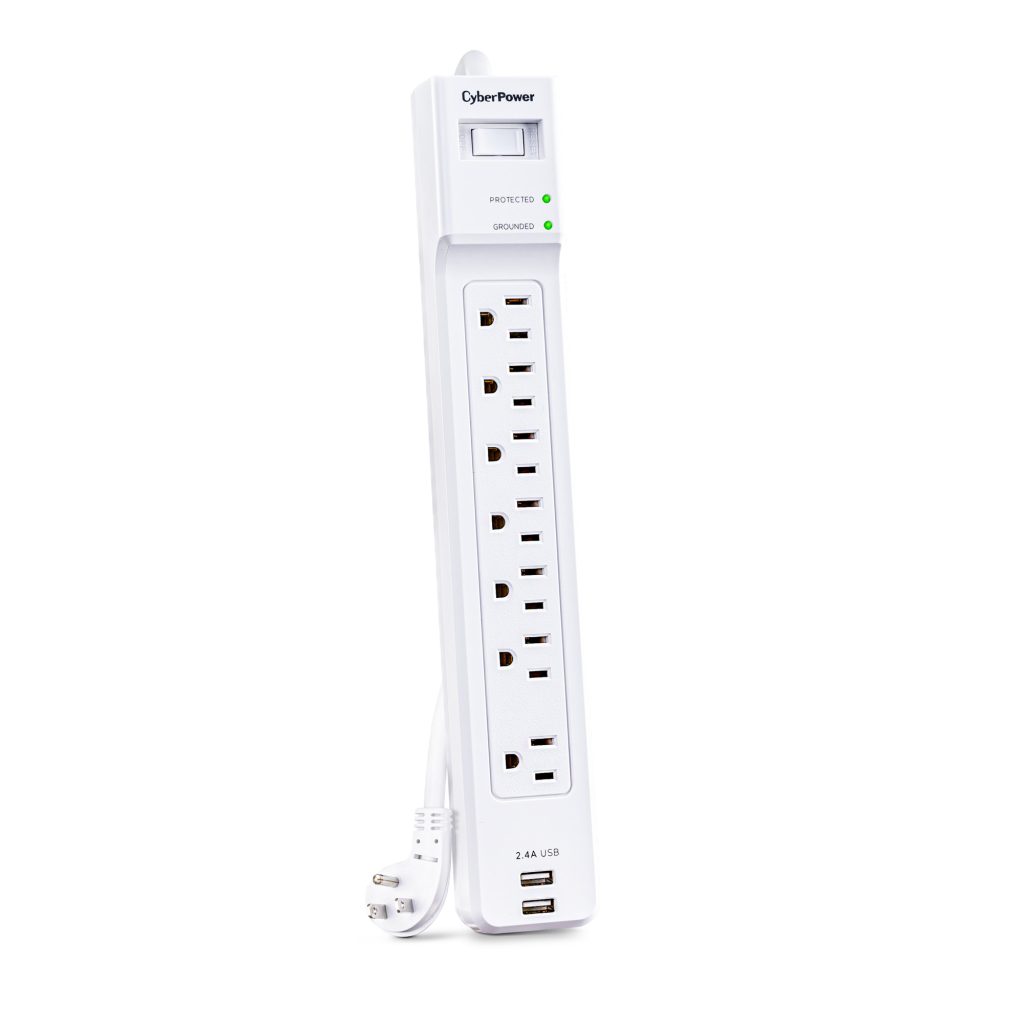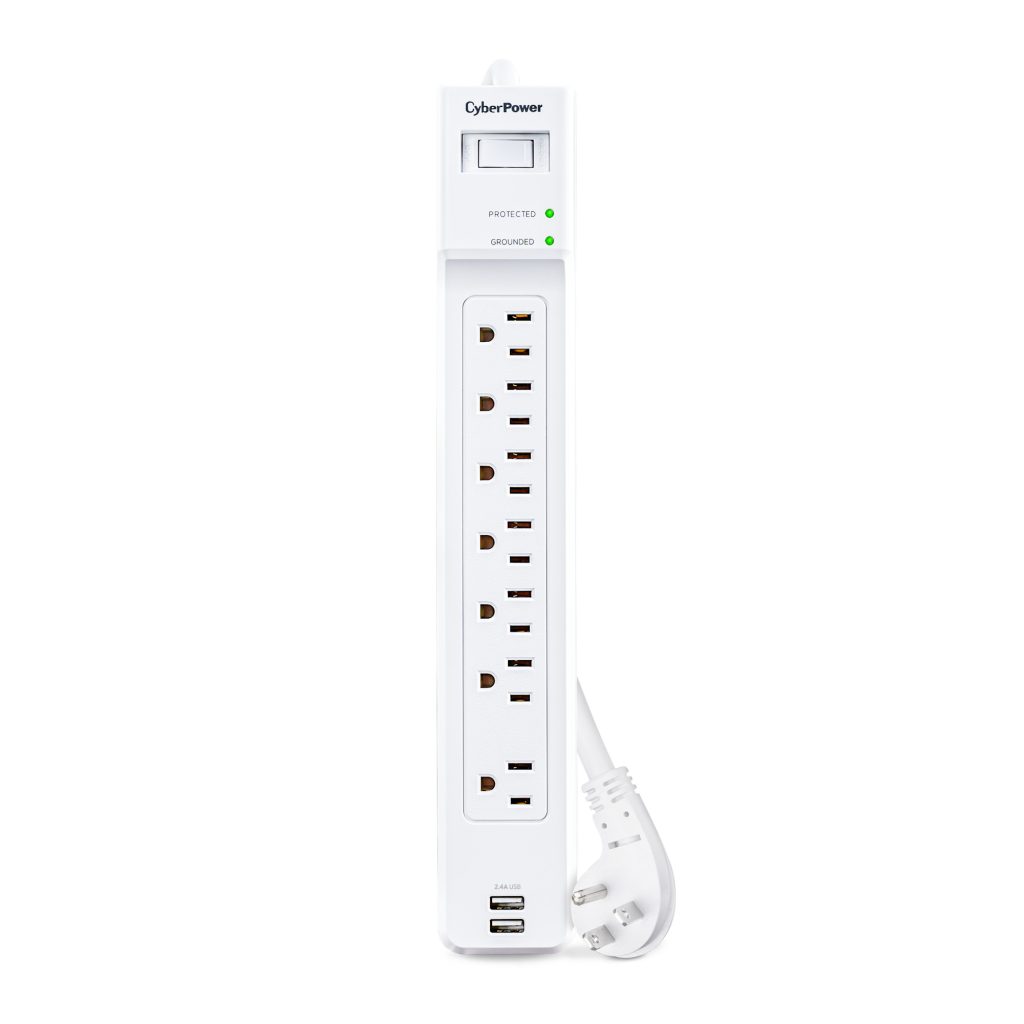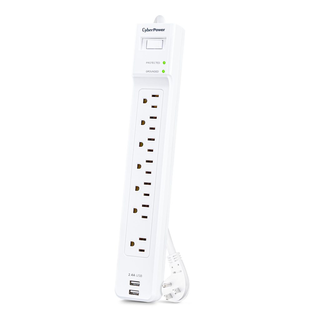 The CyberPower P703URC1 7-outlet surge protector power strip offers a high level of surge protection for essential home and office electronics such as computers and peripherals, home theater equipment, and appliances. With 2000 joules of surge protection, the P703URC1 outlet extender prevents power surges and power spikes caused by storms and electrical grid fluctuations from reaching and potentially harming your valuable electronic equipment. In addition to surge protection, the P703URC1 has 2 USB-A ports rated at 2.4 amps of shared output, which will charge USB enabled mobile device. The P703URC1 comes with 7 standard, grounded power outlets and a 3 foot extension power cord with a low profile grounded plug, which fits tightly against walls for placement behind furniture.