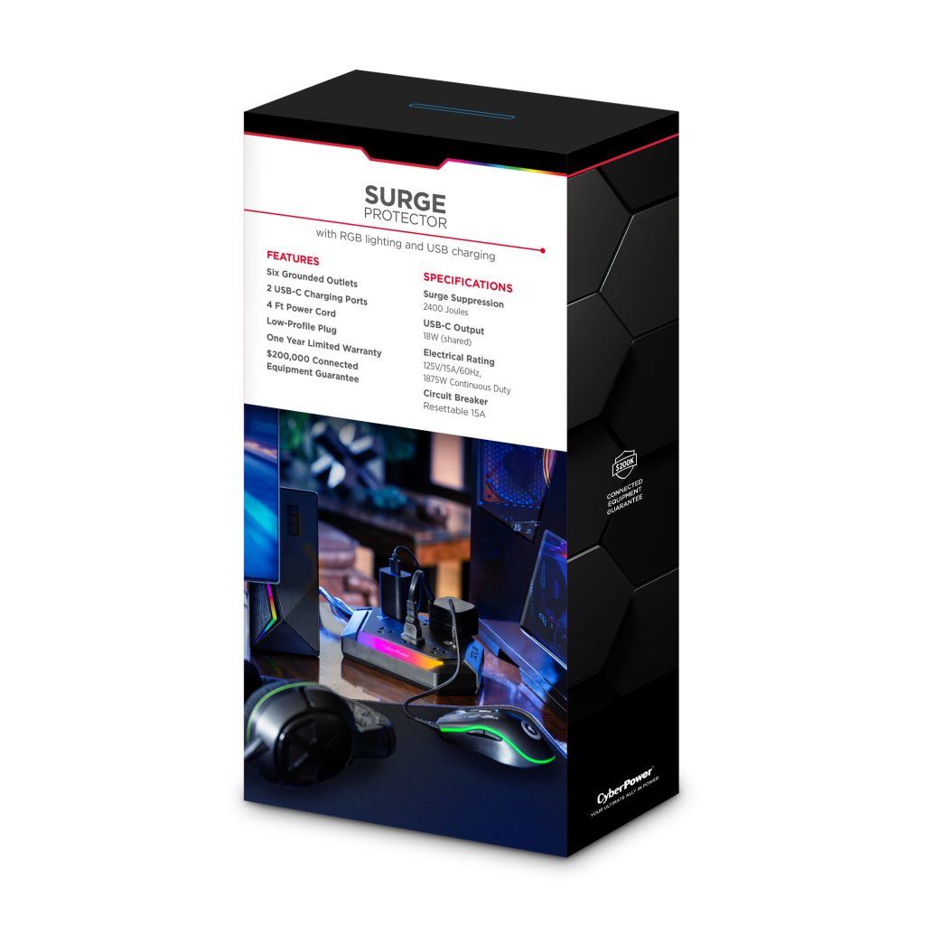 Level up your defense with the CyberPower GXS604C2 Surge Protector – built for gamers who don’t mess around. Whether you're grinding through raids on your console or dominating matches on your PC, this surge protector keeps your gear safe from power spikes and surges with a massive 2400 joules of protection. With 6 wide-spaced outlets, a 4-foot power cord, and dual USB-C ports, you’ve got plenty of room to power your rig, monitors, and charge your controllers—no outlet Tetris required. And the customizable RGB light bar? Yeah, it’s there to sync up with your setup and look just as fresh as the rest of your gear. CyberPower’s got your back with a 1-year limited warranty and a $300,000 Connected Equipment Guarantee. Stay powered. Stay protected. Stay in the game.
