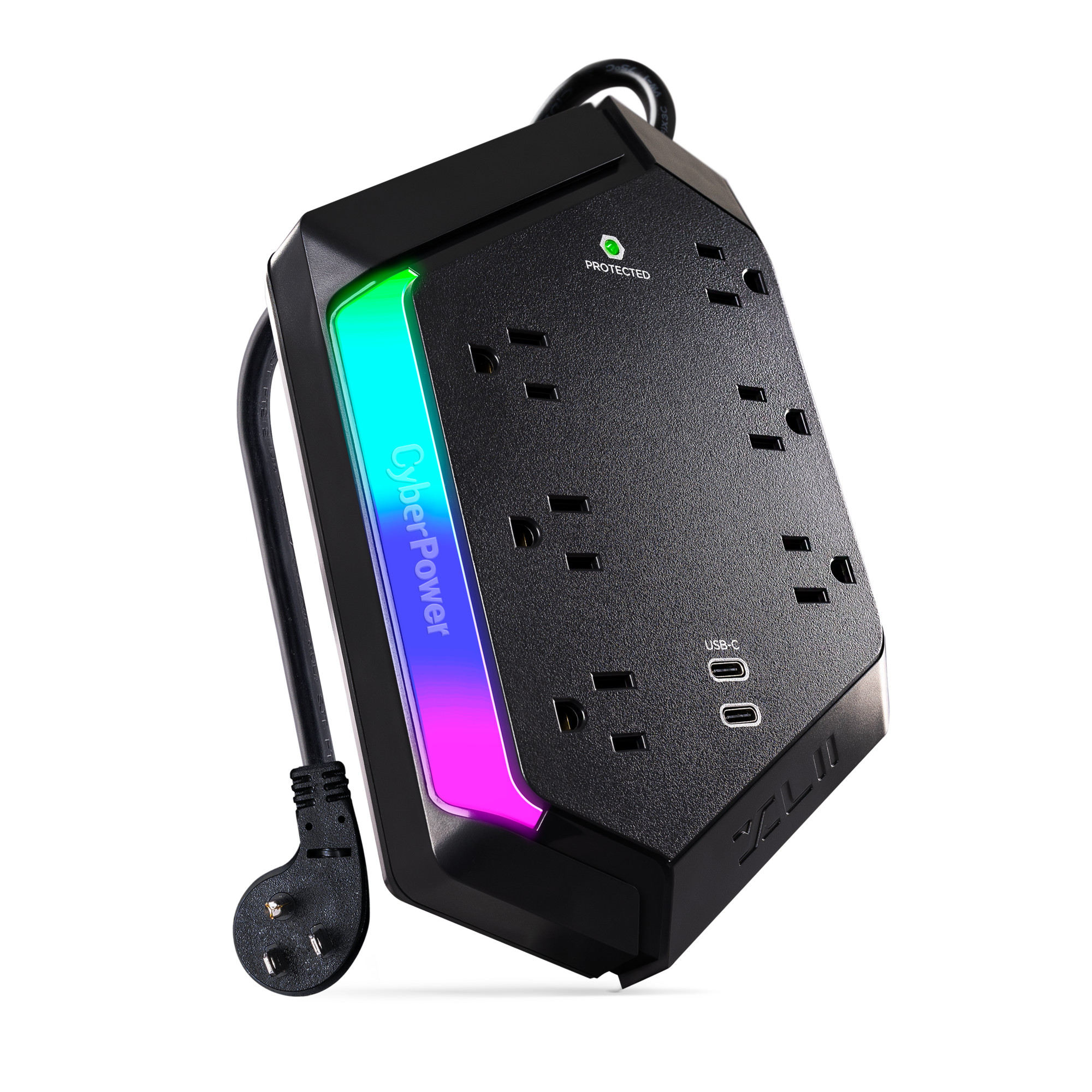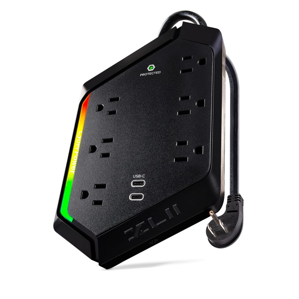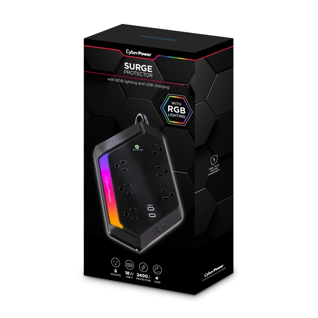 Level up your defense with the CyberPower GXS604C2 Surge Protector – built for gamers who don’t mess around. Whether you're grinding through raids on your console or dominating matches on your PC, this surge protector keeps your gear safe from power spikes and surges with a massive 2400 joules of protection. With 6 wide-spaced outlets, a 4-foot power cord, and dual USB-C ports, you’ve got plenty of room to power your rig, monitors, and charge your controllers—no outlet Tetris required. And the customizable RGB light bar? Yeah, it’s there to sync up with your setup and look just as fresh as the rest of your gear. CyberPower’s got your back with a 1-year limited warranty and a $300,000 Connected Equipment Guarantee. Stay powered. Stay protected. Stay in the game.