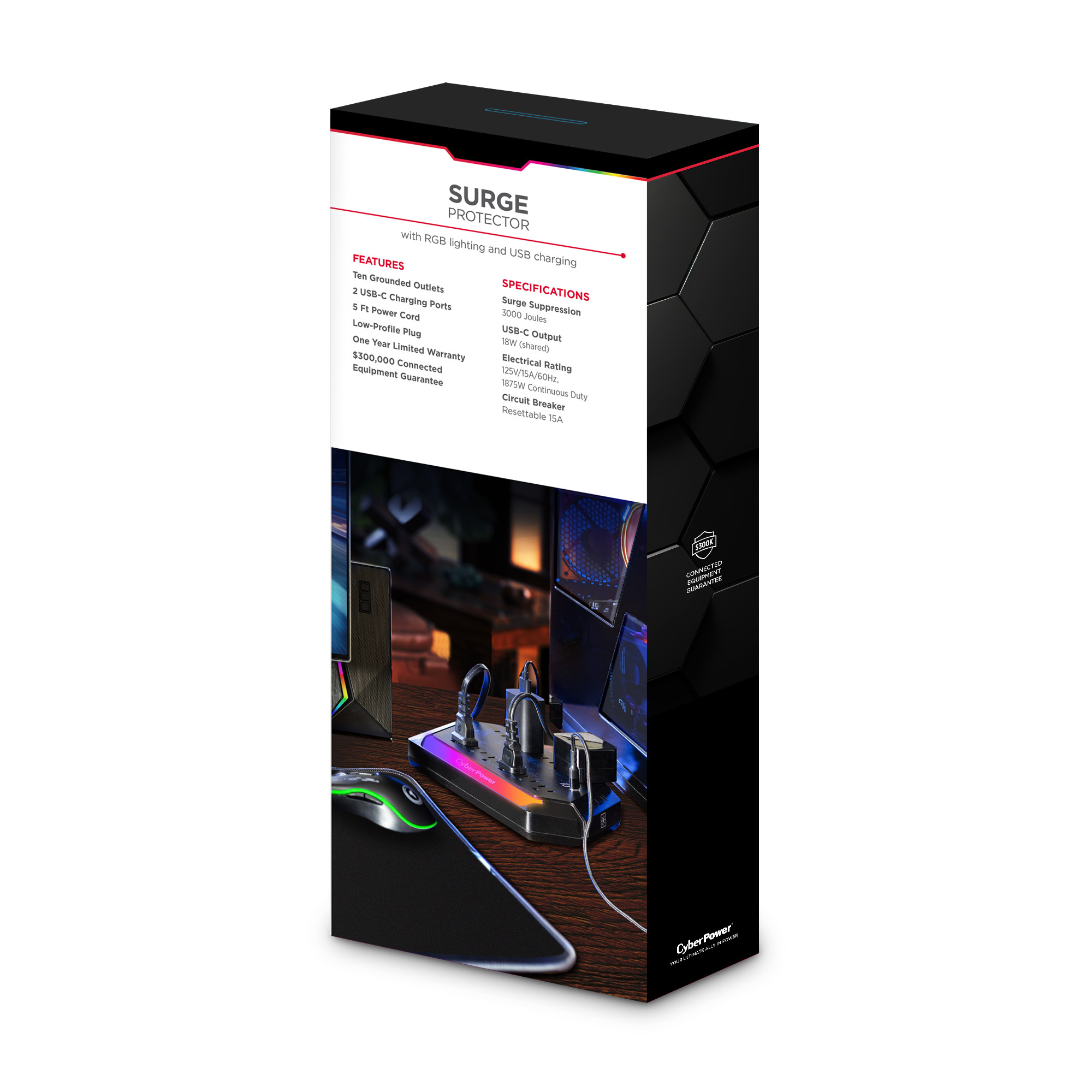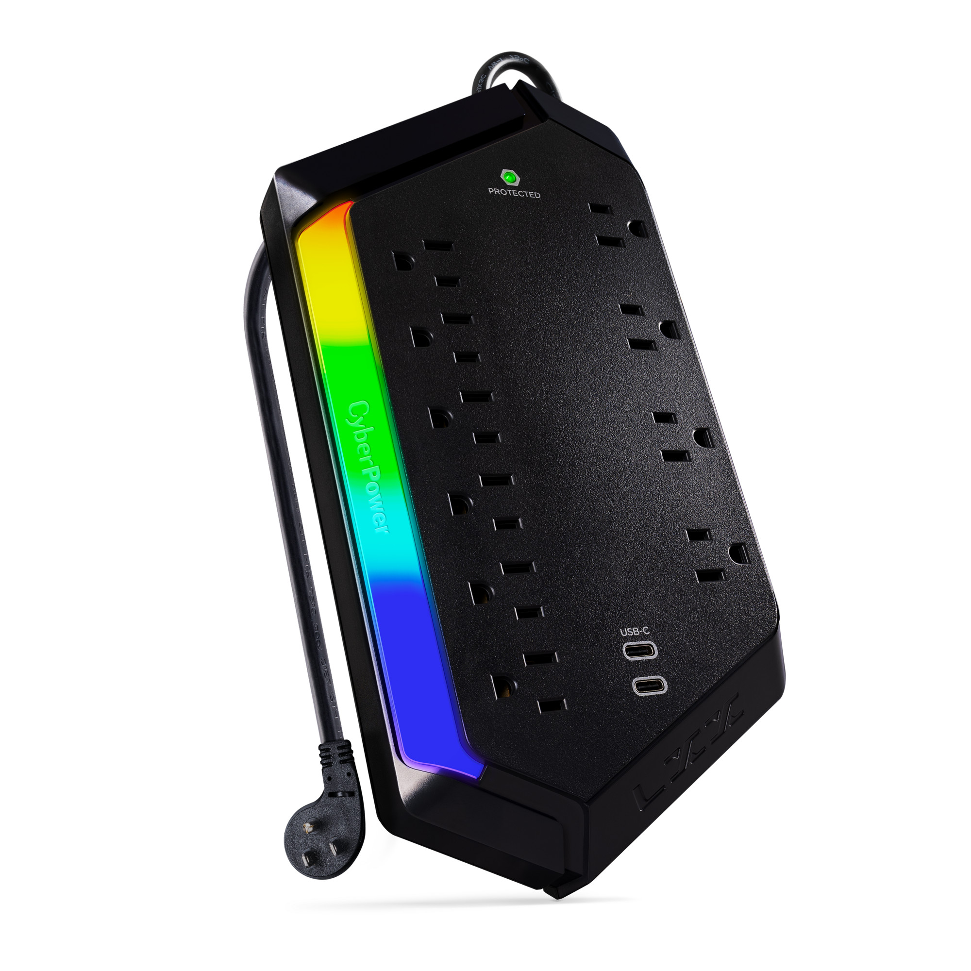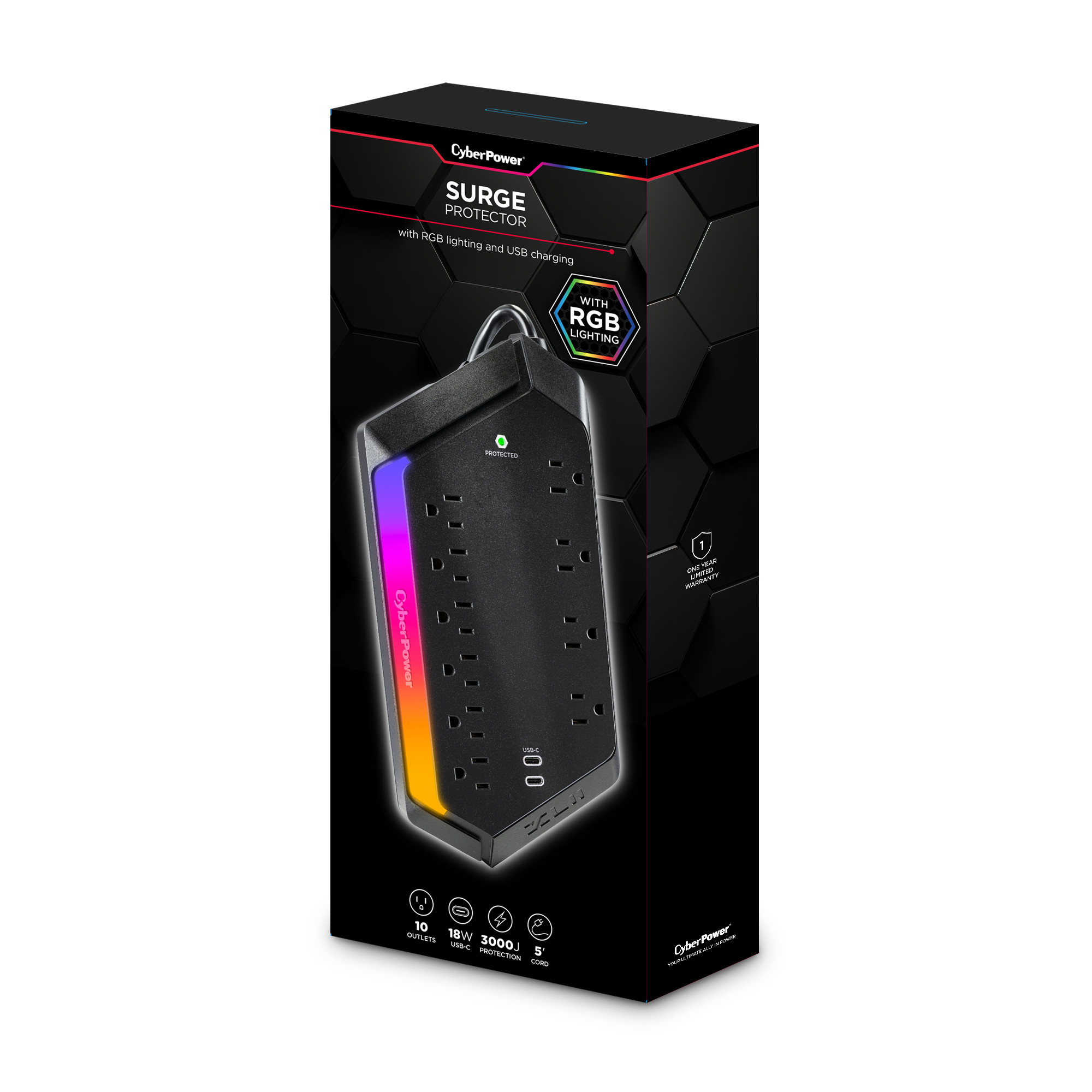 Level up your defense with the CyberPower GXS1005C2 Surge Protector – built for gamers who don’t mess around. Packing a whopping 3000 joules of protection, it shields your battle station from power spikes, surges, and the chaos of the grid. Whether you’re running raids on your console or racking up kills on your PC, your gear stays locked and loaded. With 10 total outlets (including 4 wide-spaced for chunky plugs), a 5-foot cord, and dual USB-C ports for fast charging, you can power your rig, dual monitors, charging docks, VR base stations, and still have room to spare—no more playing outlet Tetris. And the customizable RGB light bar? It syncs with your setup so your surge protector doesn’t just protect—it flexes. Backed by a 1-year warranty and a $300,000 Connected Equipment Guarantee, the GXS1005C2 is your shield against power chaos. Defend your gear. Light up your loadout. Stay in the game.