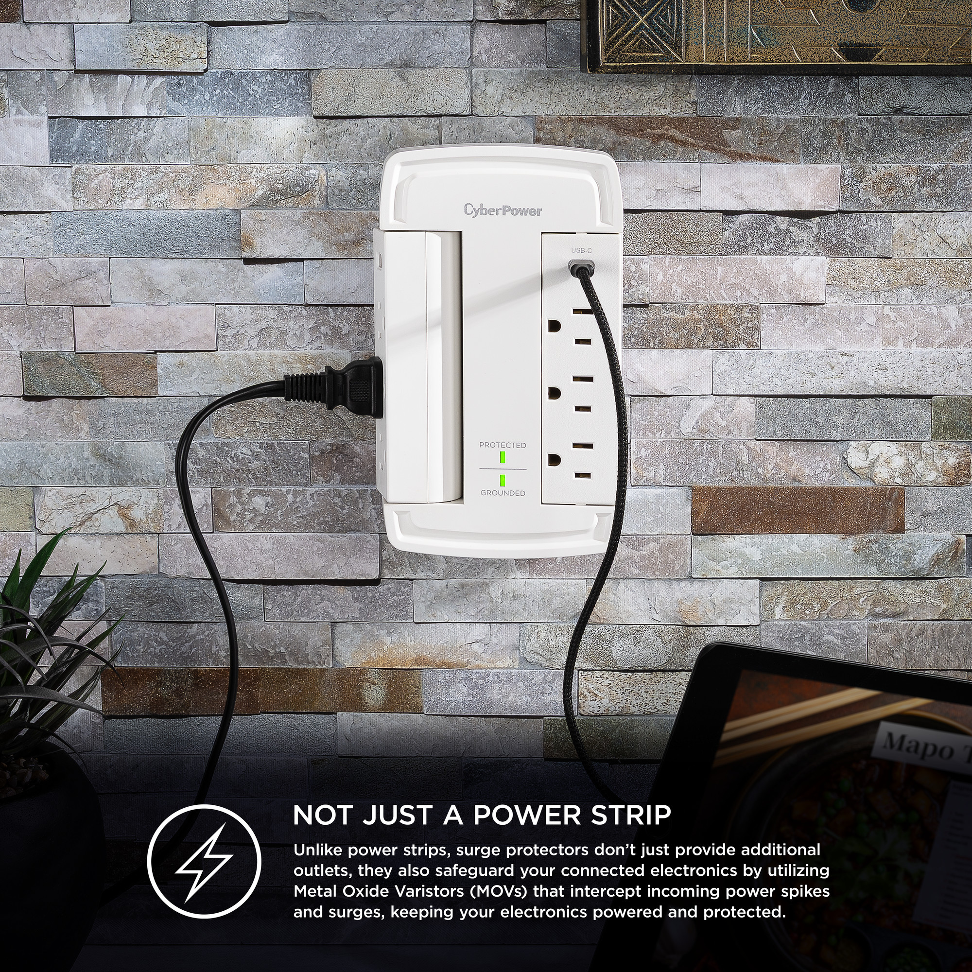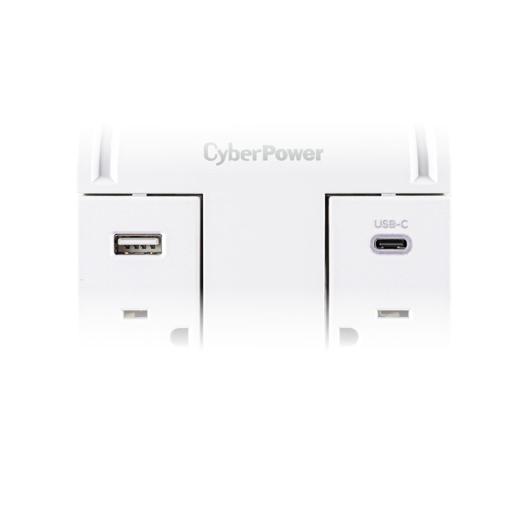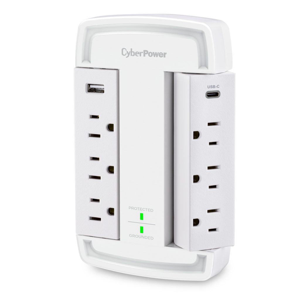 The CyberPower CSP6WSUC Wall-Tap Surge Protector with USB charging is designed to protect essential home and office electronics, including computers, networking equipment and other devices from power surges and energy spikes caused by storms and electrical fluctuations. Offering 2,400 joules of surge protection, this unit features six surge-protected AC outlets, a USB-A port with 2.4A power output, and a USB-C port delivering 15W of power, ensuring efficient charging for mobile and USB-enabled devices.