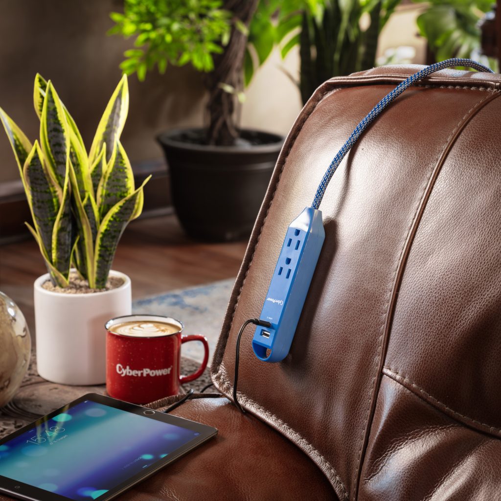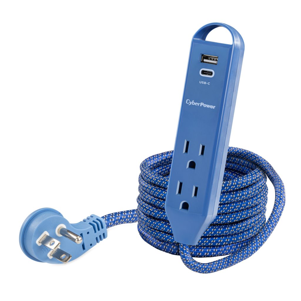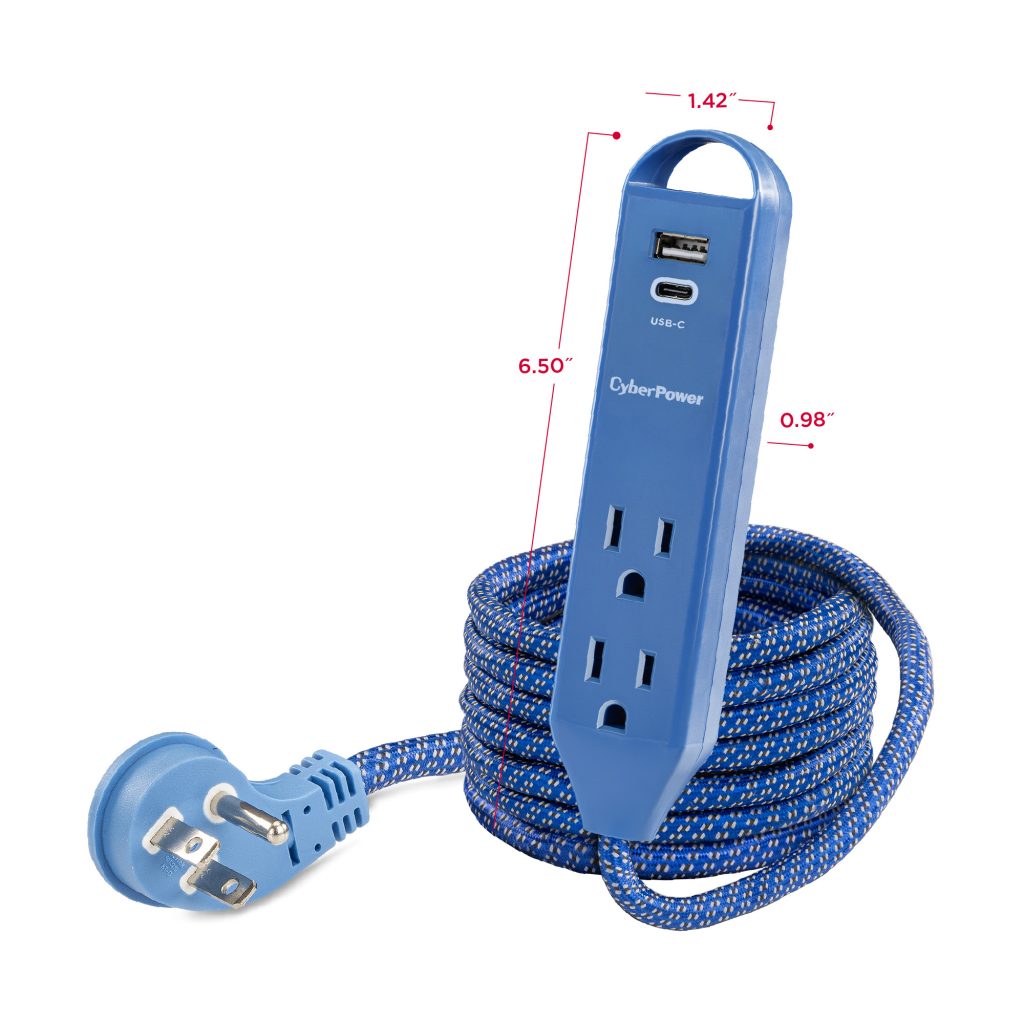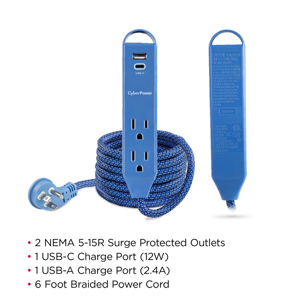 Extend power to where you want it! Set up a temporary personal power station to quickly charge multiple devices using AC power and USB ports. This USB & AC extension cord surge protector provides two standard-spaced surge-protected outlets, one 2.4 A USB charging port, and one 12W USB-C charging port, making it perfect for mobile devices, fitness trackers, and smart home devices. The GC206UCBL has a stylish, braided cord that prevents tangles, and can be conveniently hung with its integrated mounting loop. A low-profile plug fits in tight spaces to keep power within reach.