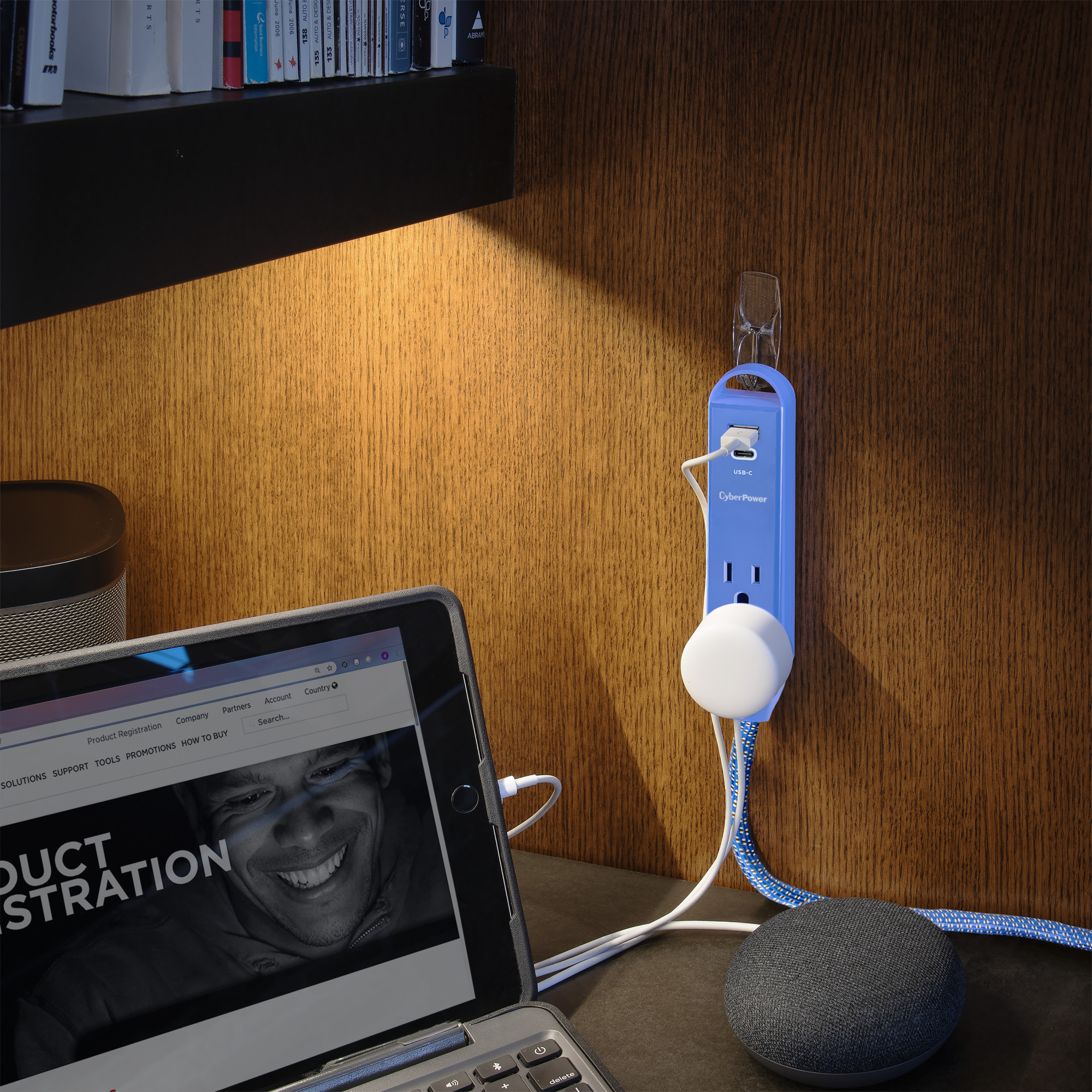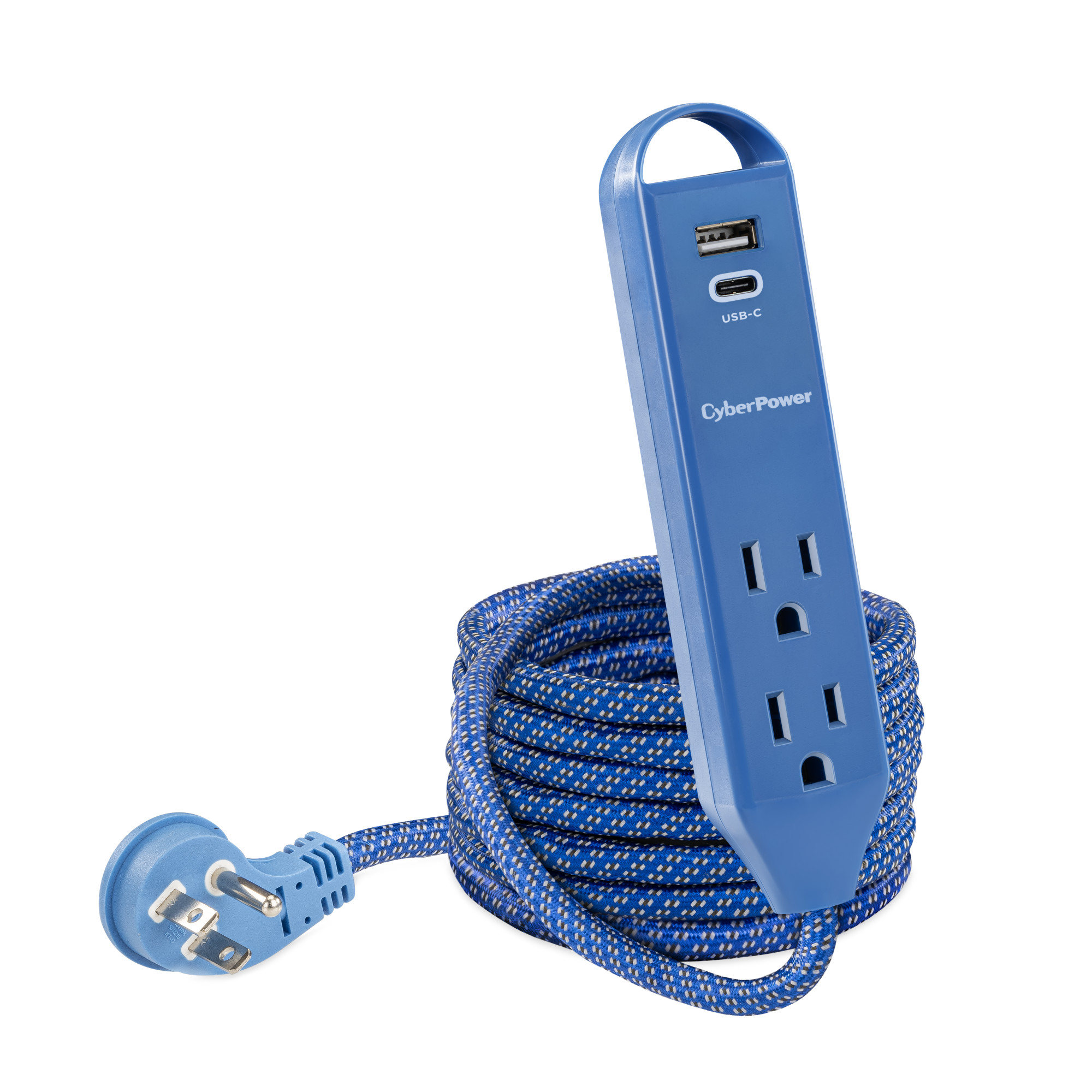 Extend power to where you want it! Set up a temporary personal power station to quickly charge multiple devices using AC power and USB ports. This USB & AC extension cord surge protector provides two standard-spaced surge-protected outlets, one 2.4 A USB charging port, and one 12W USB-C charging port, making it perfect for mobile devices, fitness trackers, and smart home devices. The GC206UCBL has a stylish, braided cord that prevents tangles, and can be conveniently hung with its integrated mounting loop. A low-profile plug fits in tight spaces to keep power within reach.
