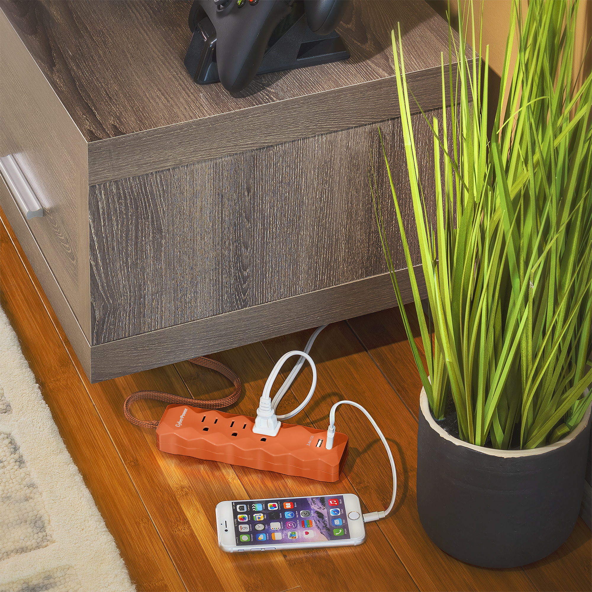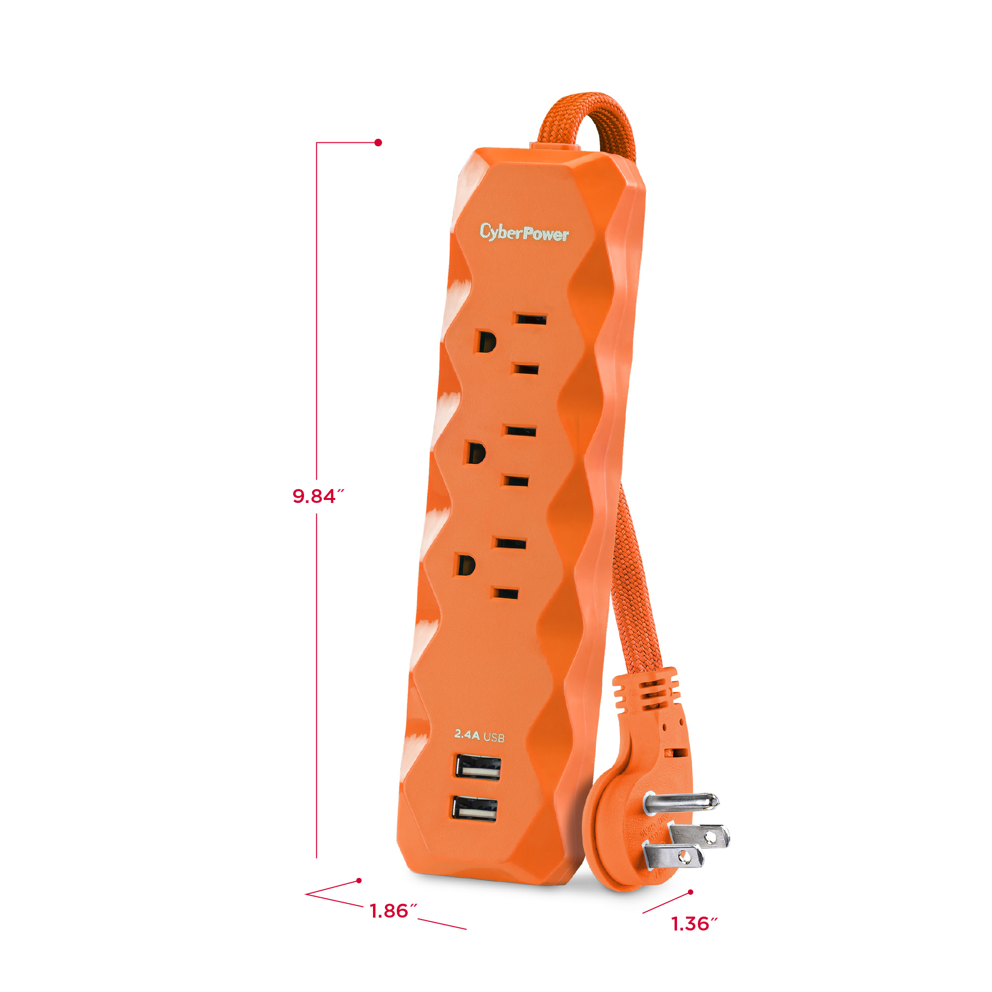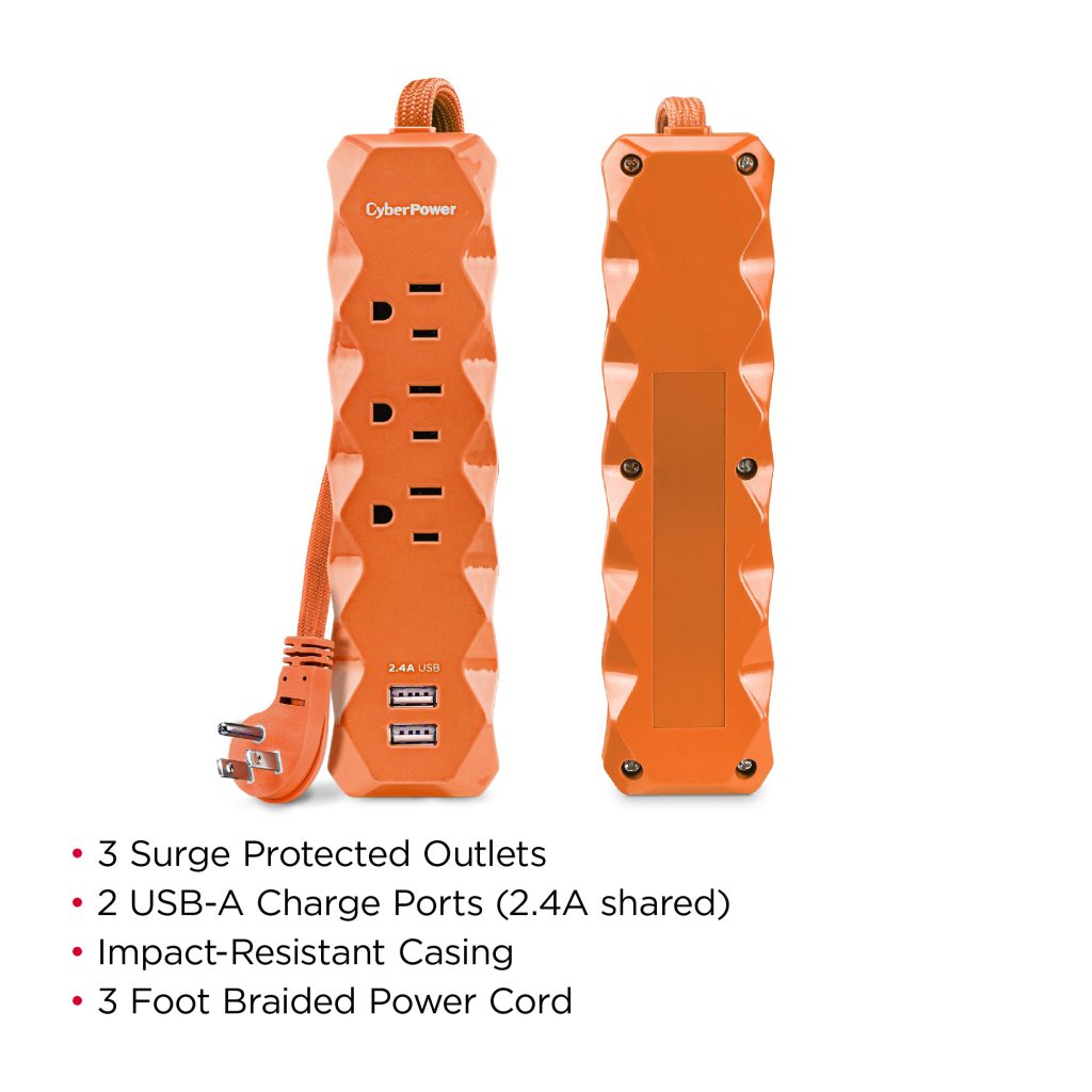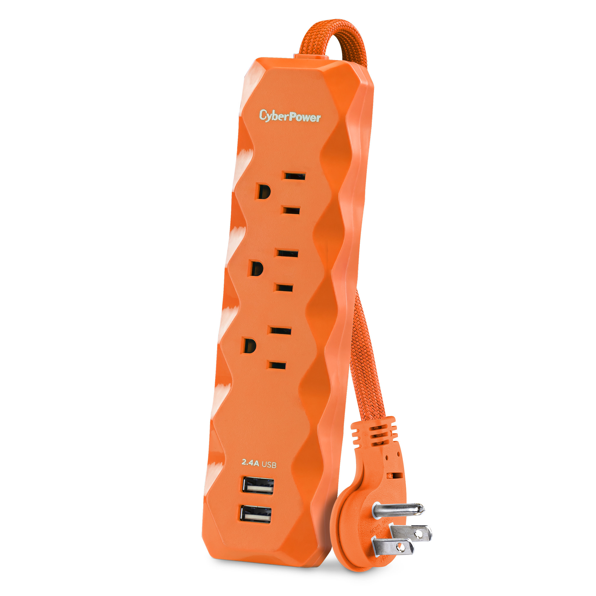 This Cyberpower Surge Protector provides protection to prevent damaging power spikes and surges from reaching your small electronics. The P303UOR surge protector includes 2 USB ports to quickly charge USB-powered devices, including tablets.