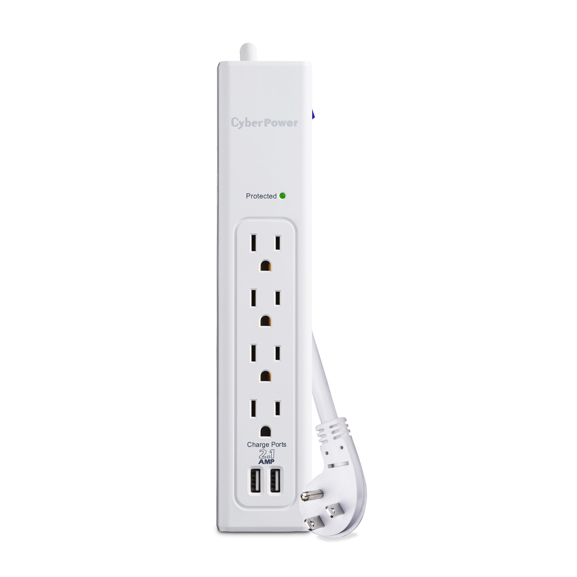 The CyberPower Home Office Surge Protector P403U prevents spikes in energy caused by storms and electrical power surges from reaching your home office equipment such as laptops, small electronics, and chargers. The P403U provides 450 joules of protection, 4 AC outlets, and a 3-ft. power cord with a right-angle plug. It also has 2 USB ports (2.1 Amp) to quickly charge USB-powered devices.
