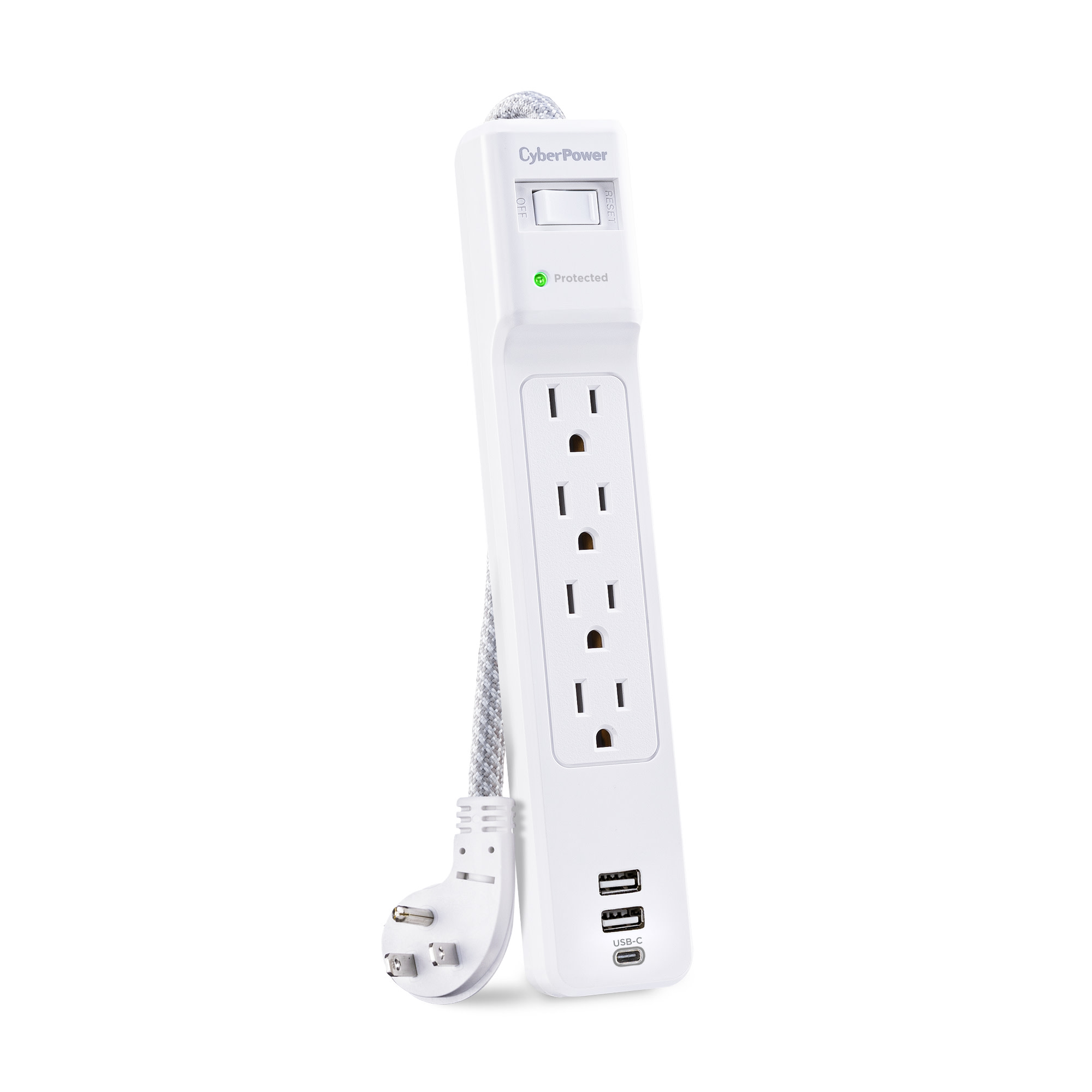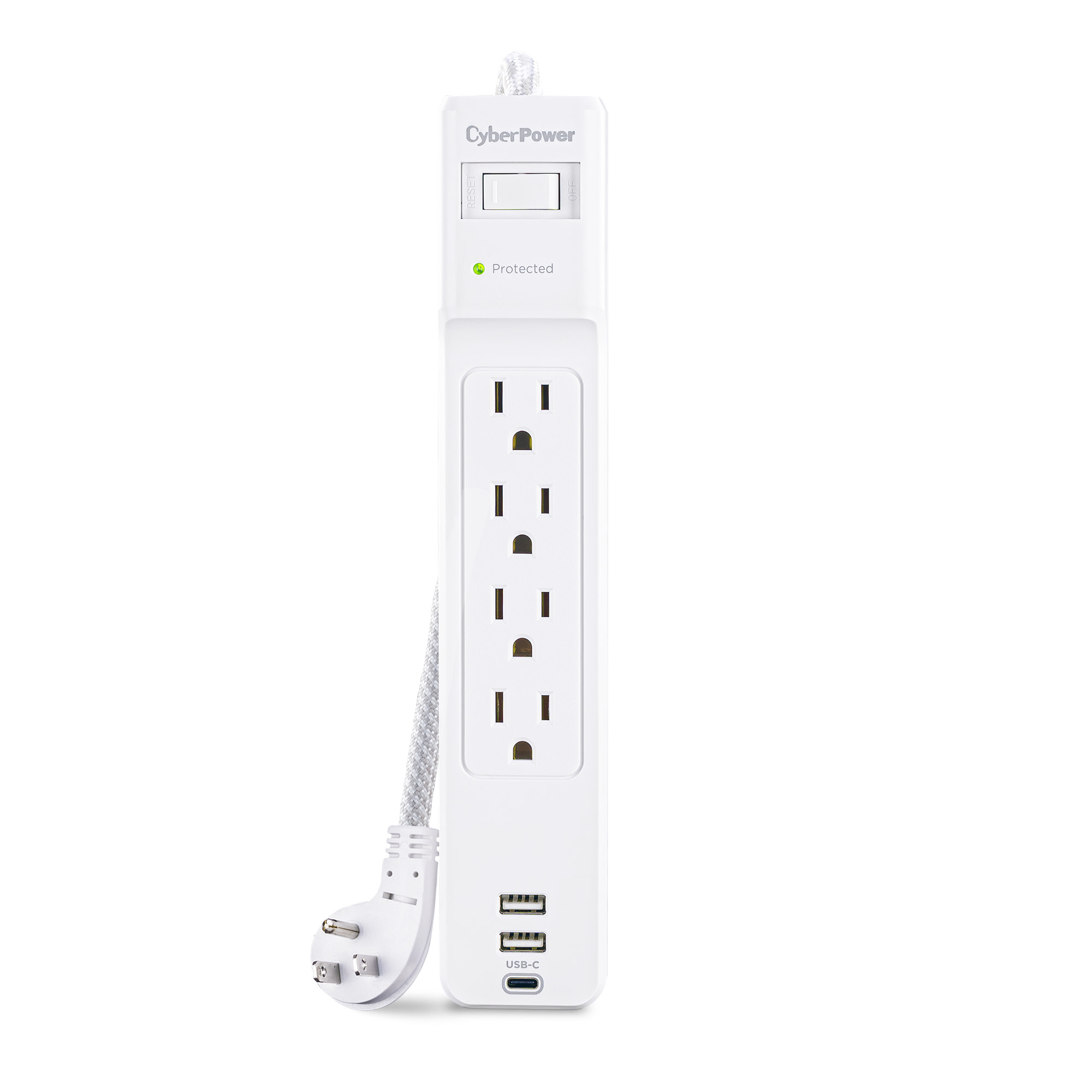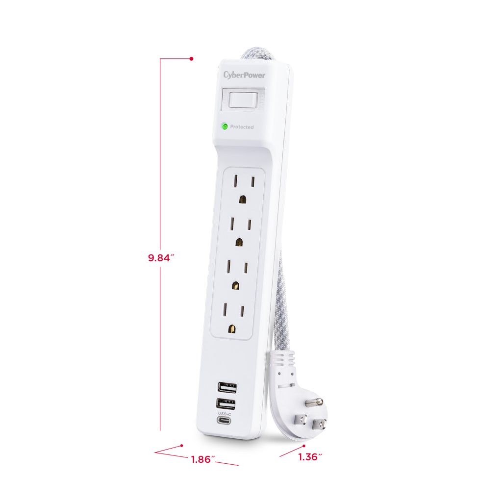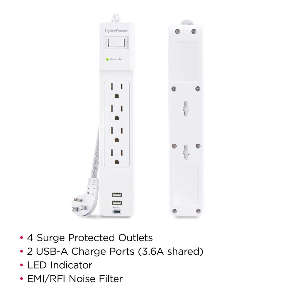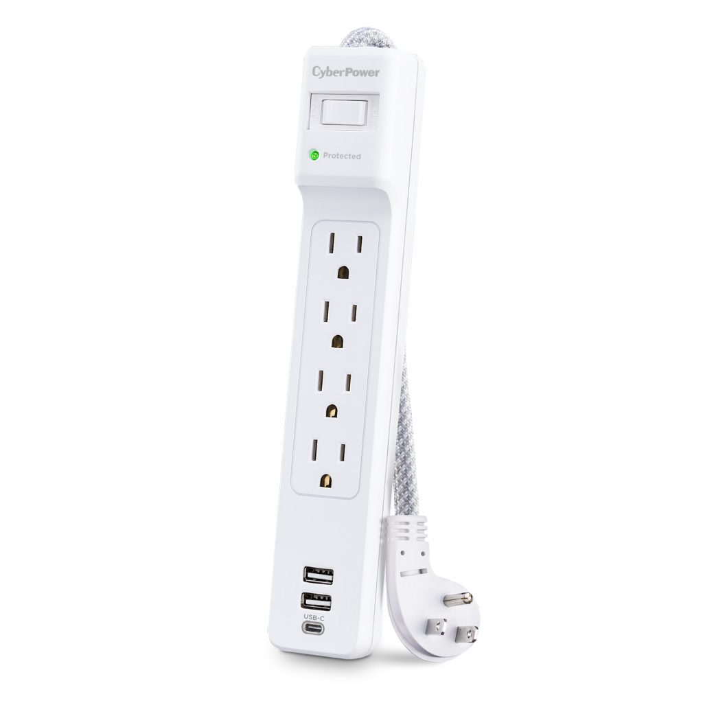 The CyberPower P405UC Surge Protector Strip prevents spikes caused by storms and electrical power surges from reaching your home electronics such as home entertainment equipment, computers, household appliances and small electronics. The P405UC provides 1500 joules of surge protection, 4 AC outlets, 1 USB-C charging port, two USB-A charging ports, and a braided 5-foot power cord with a right-angle plug.
