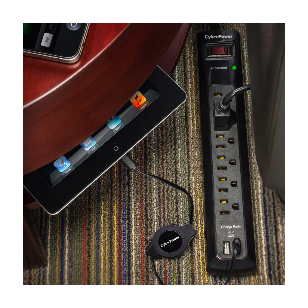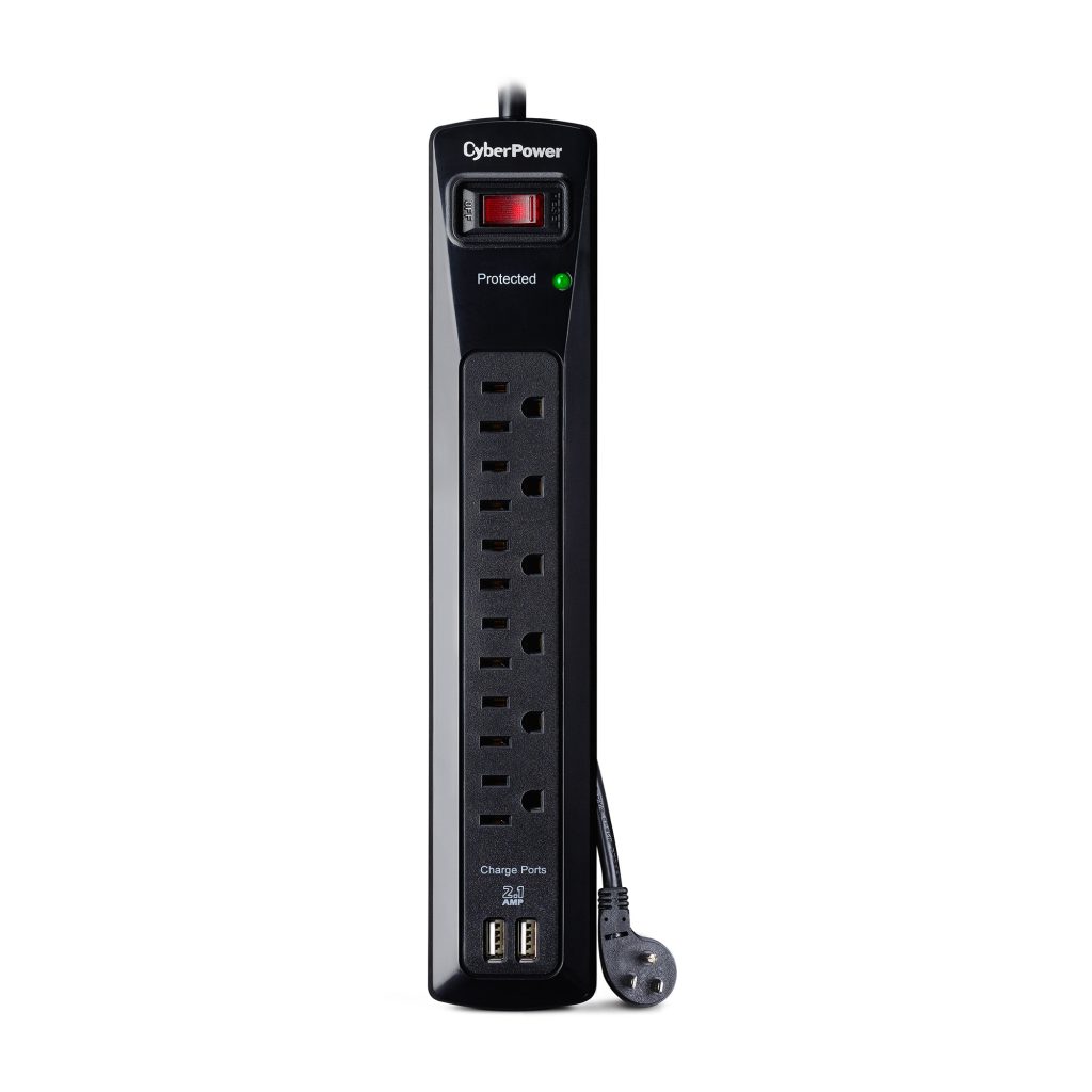 The Home Office Surge Protector P604U from CyberPower offers vital surge suppression for common home and office devices such as computers and electronics. It prevents spikes in energy caused by storms and electrical power surges and is ideal for safeguarding personal computers, phones/faxes/modems, and other consumer electronics. The P604U provides 2 USB ports (2.1-Amp), 1200 joules of protection and 6 surge-protected outlets (1 widely spaced for transformer plugs).