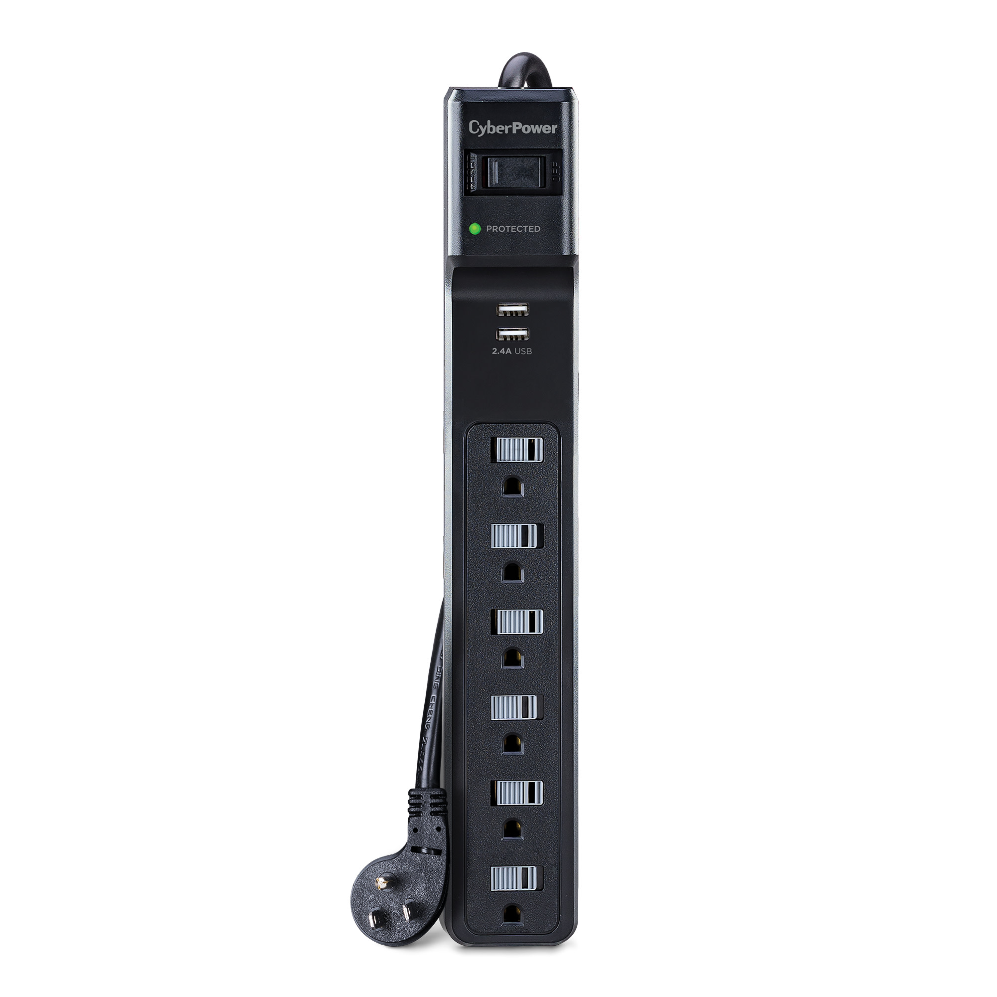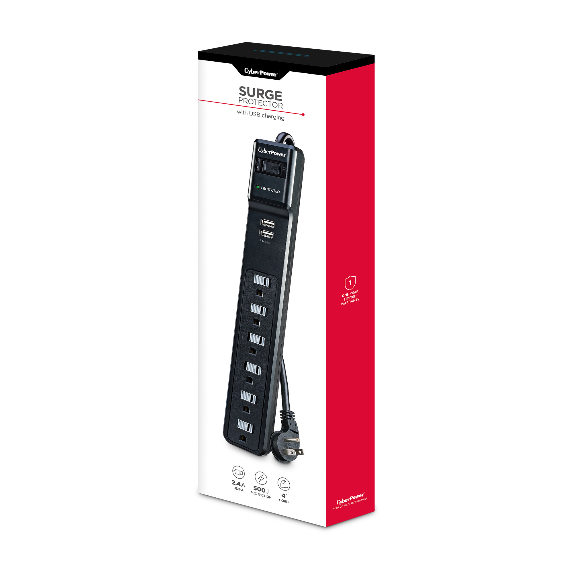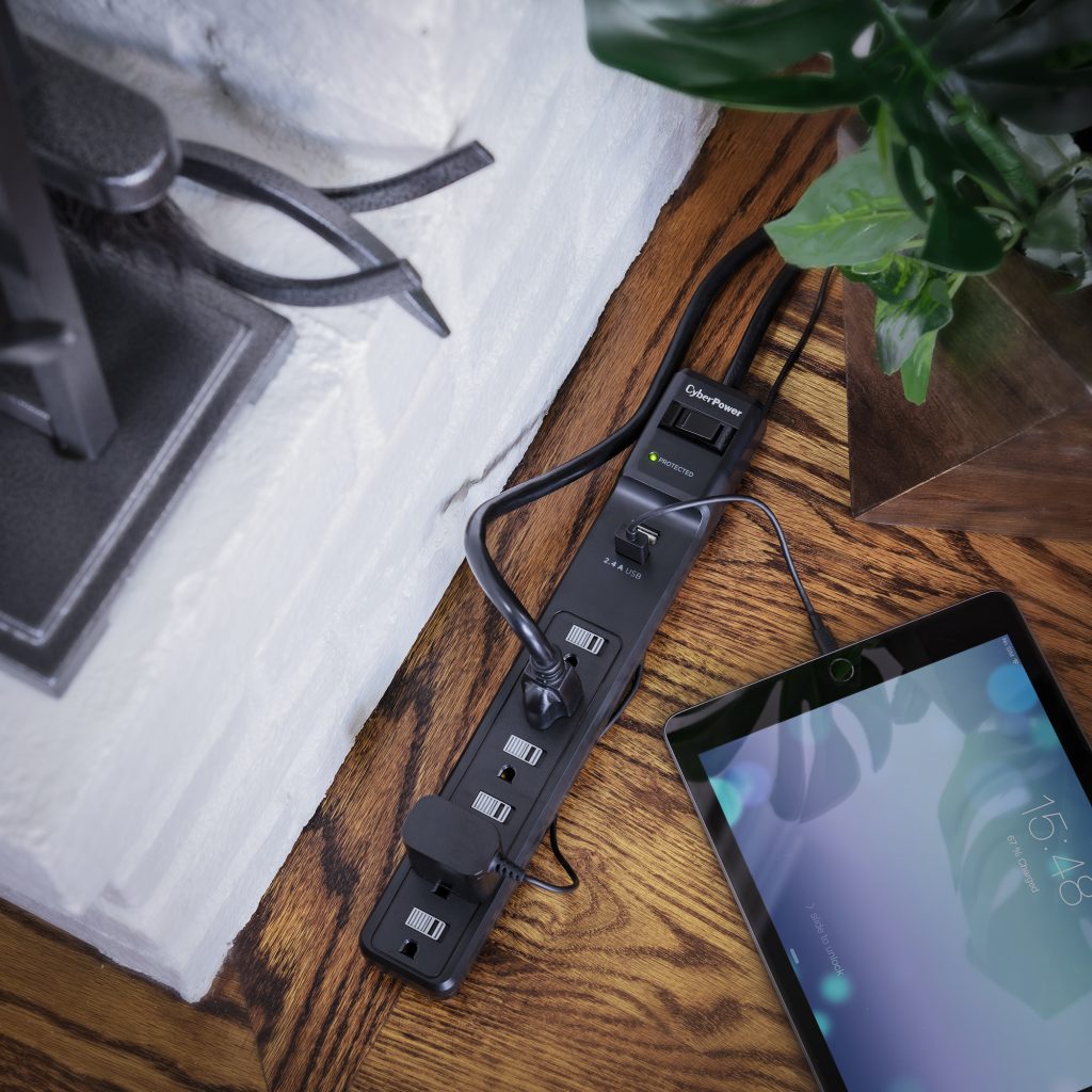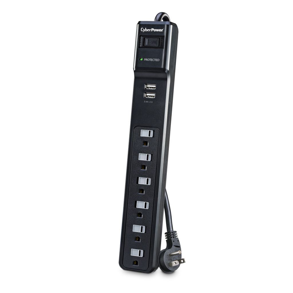 The CyberPower Home Office Surge Protector P604URC1 prevents spikes in energy caused by storms and electrical power surges from reaching your home office equipment such as laptops, small electronics, and chargers. The P604URC1 provides 500 joules of protection, 6 AC outlets, and a 4-ft. power cord with a right-angle plug. It also has 2 USB ports (2.4 Amp) to quickly charge USB-powered devices.